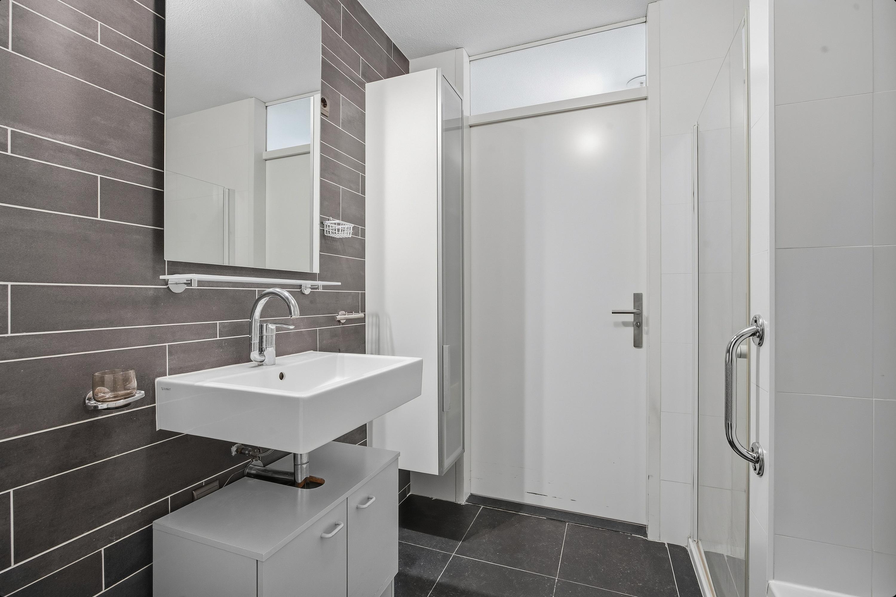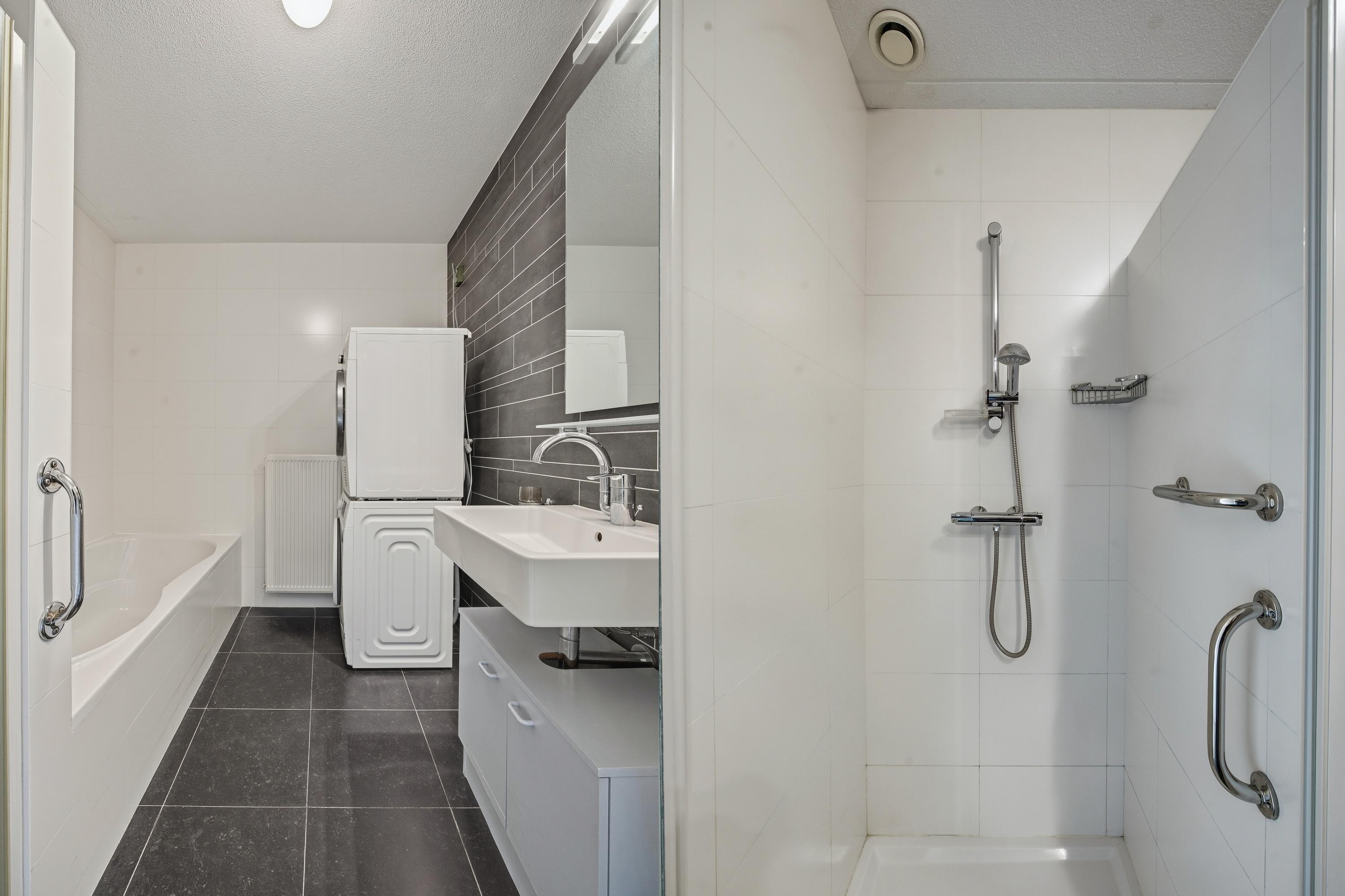 De ruime badkamer is compleet uitgerust met een douche, ligbad, wastafelmeubel en aansluitingen voor wasapparatuur.