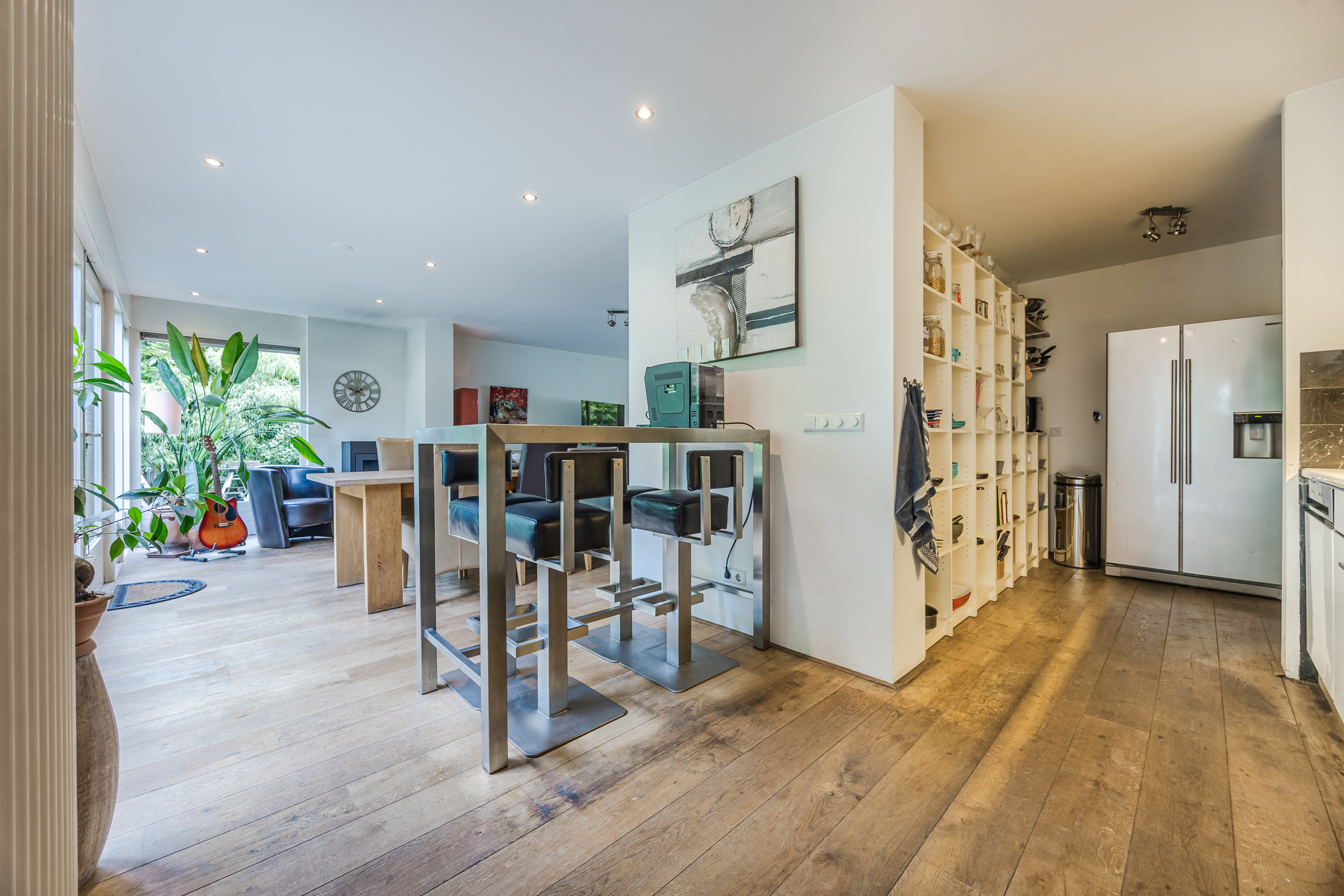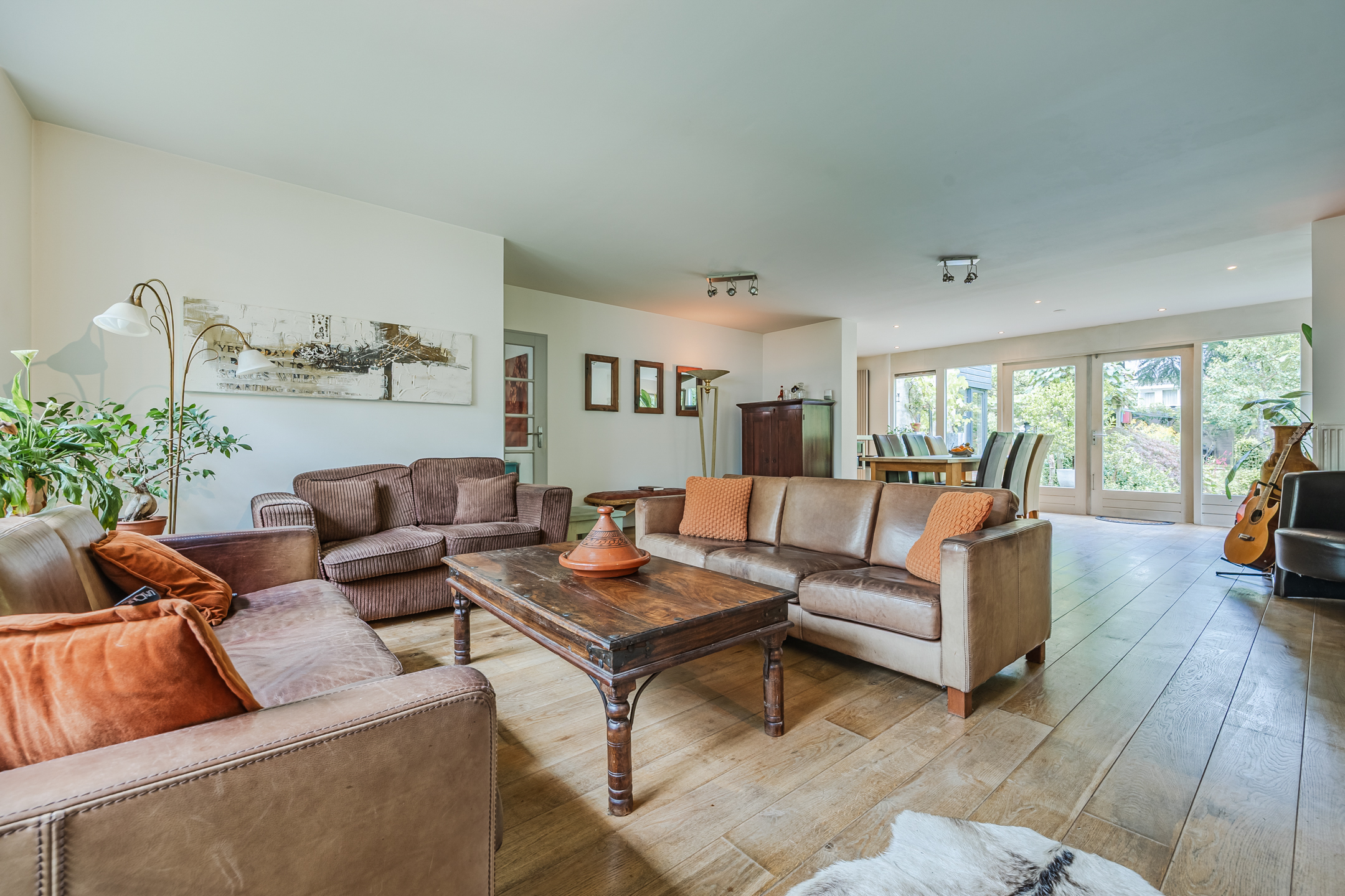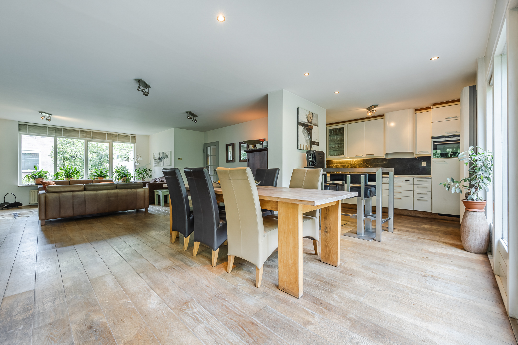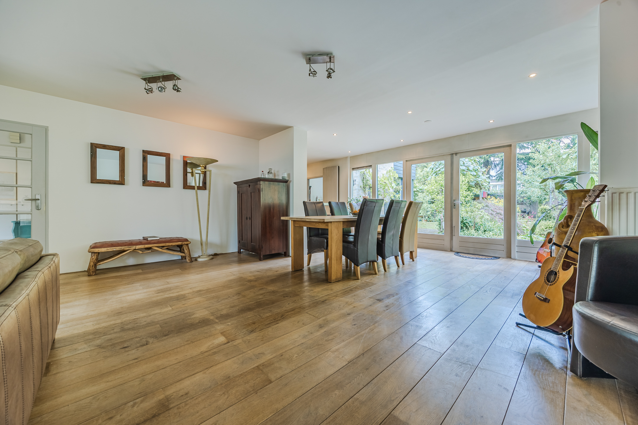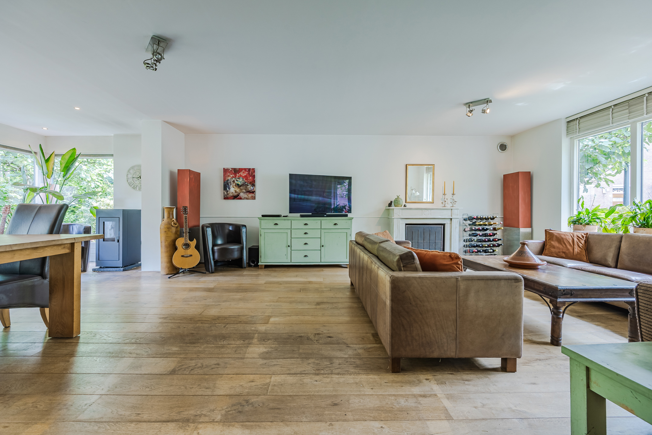 Zodra je de royale woonkamer binnenstapt, valt direct de fraaie houten vloer en de fijne lichtinval op. De ruimte is ingedeeld met een ruime zithoek rond de sfeervolle open haard en een gezellige eethoek die beschikt over een en pelletkachel. Via de openslaande deuren heb je een directe verbinding met de achtertuin, waardoor binnen en buiten naadloos in elkaar overlopen.