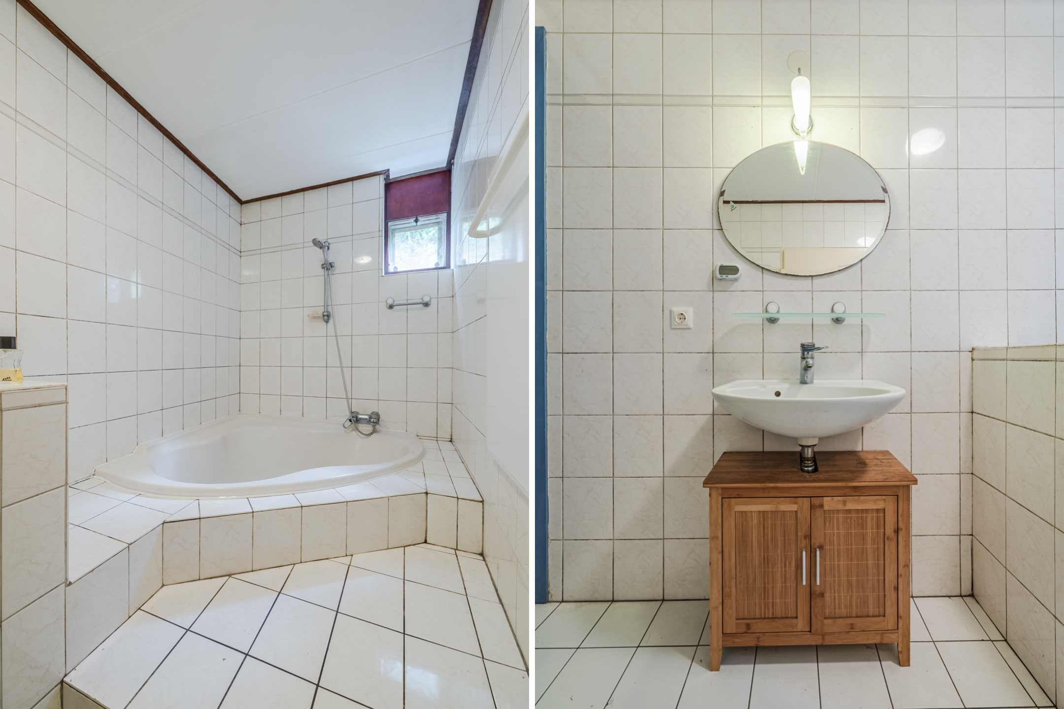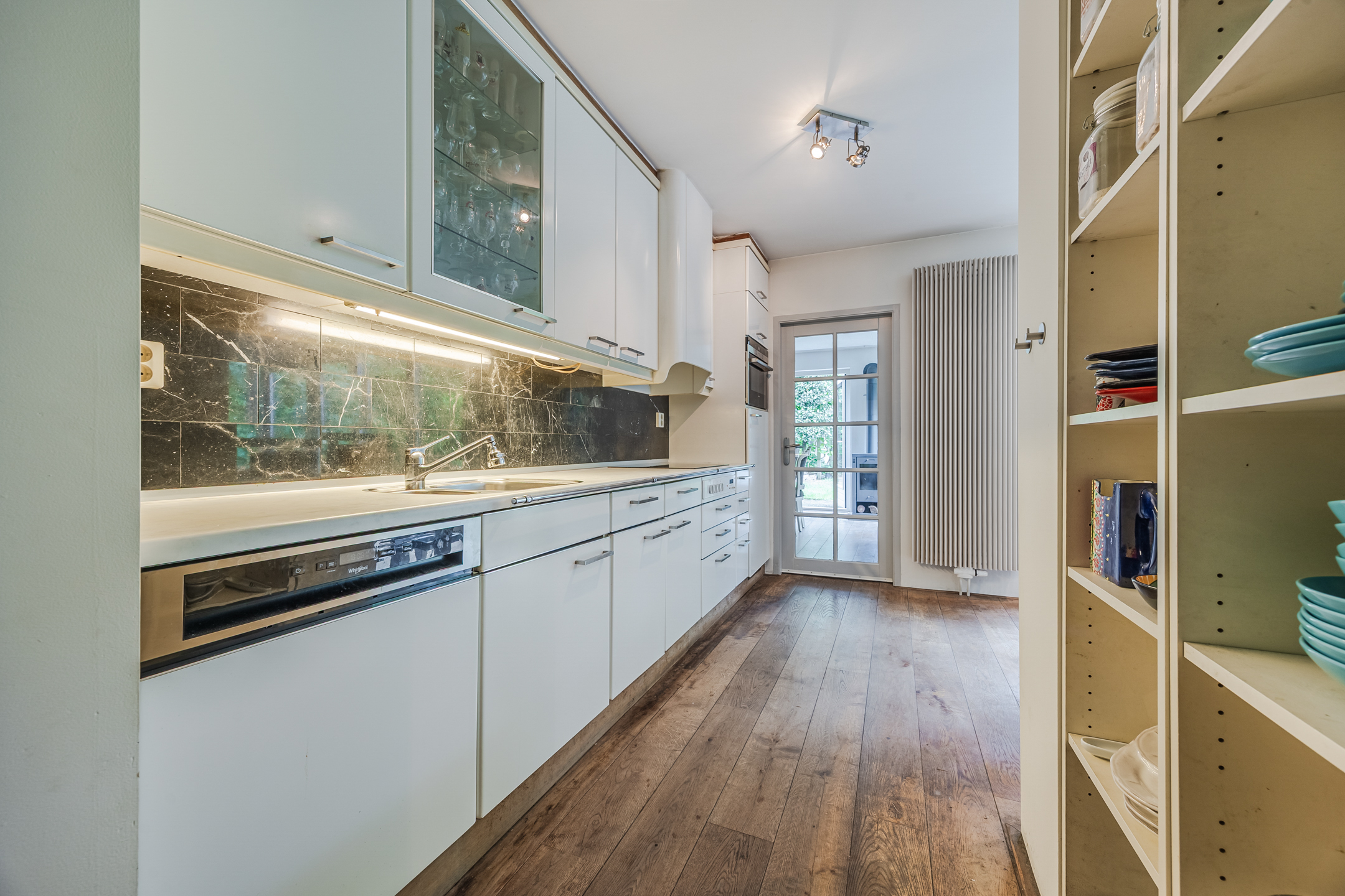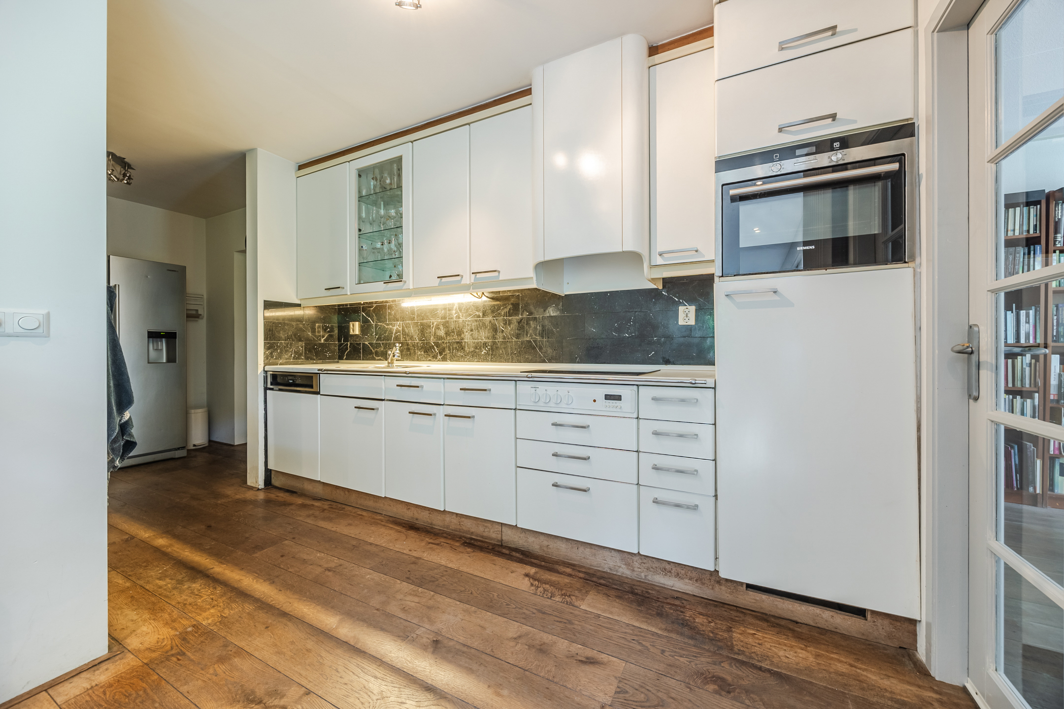 De keuken grenst direct aan zowel de woonkamer als de bijkeuken en vormt daarmee een praktisch middelpunt van de woning. De inrichting is eenvoudig maar functioneel, met volop werk- en kastruimte om dagelijks comfortabel te koken. Vanuit de keuken loop je gemakkelijk door naar de bijkeuken (de voormalige garage), waar aansluitingen voor wasmachine en droger aanwezig zijn en extra bergruimte voorhanden is. Hier vind je bovendien toegang tot de slaapkamer op de begane grond, die direct grenst aan een complete badkamer met ligbad, toilet en wastafelmeubel. Dit maakt de begane grond niet alleen verrassend veelzijdig, maar ook geschikt voor levensloopbestendig wonen of een kantoor/praktijk aan huis.