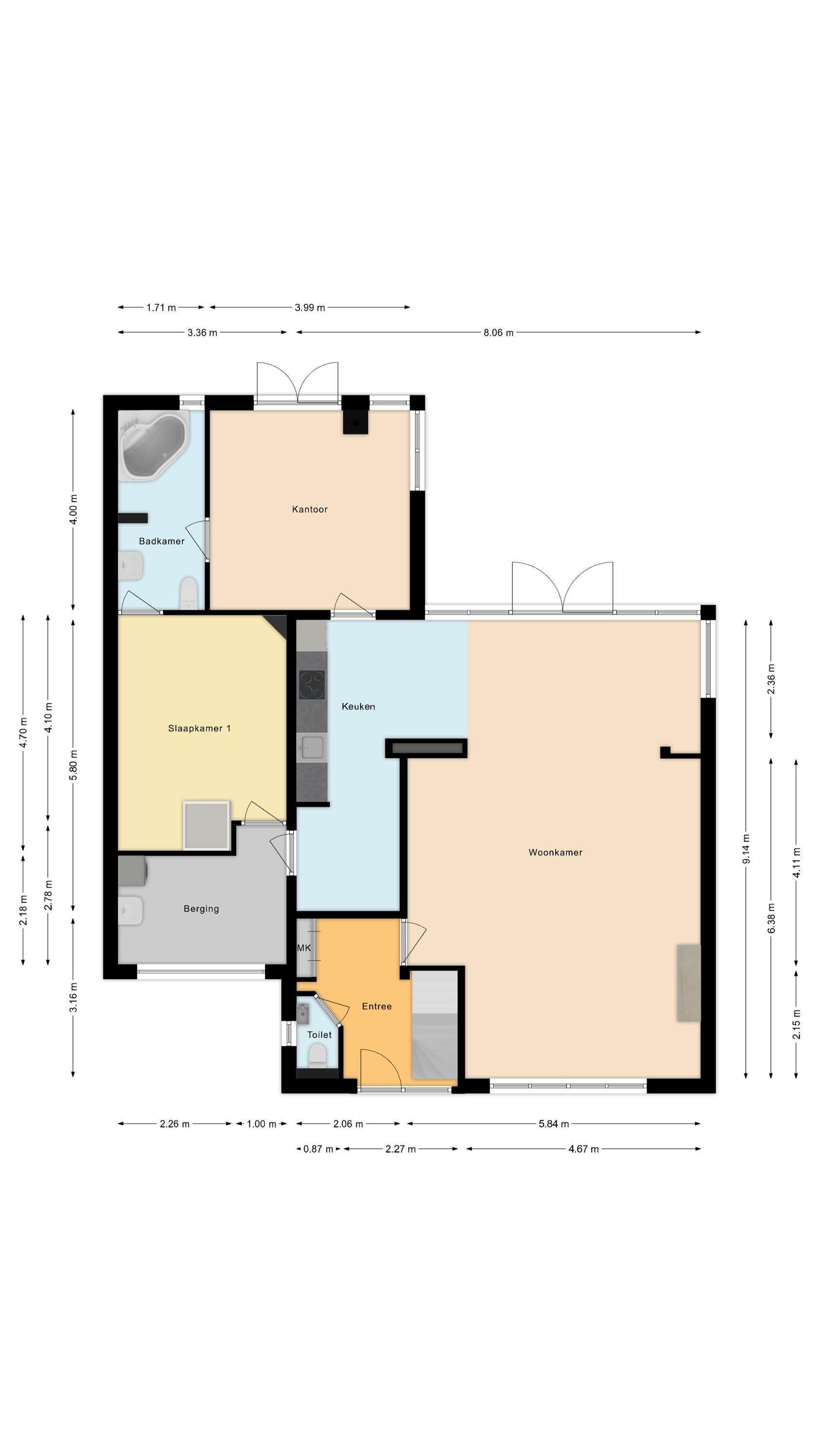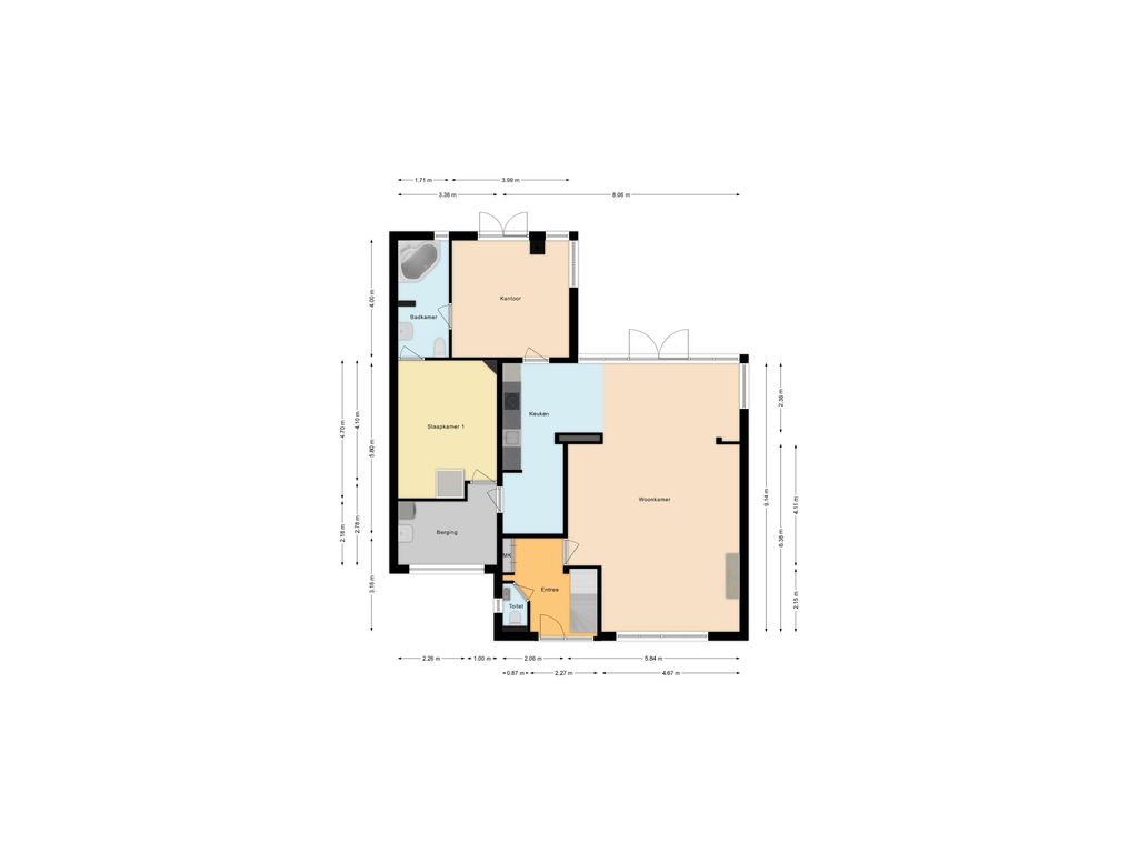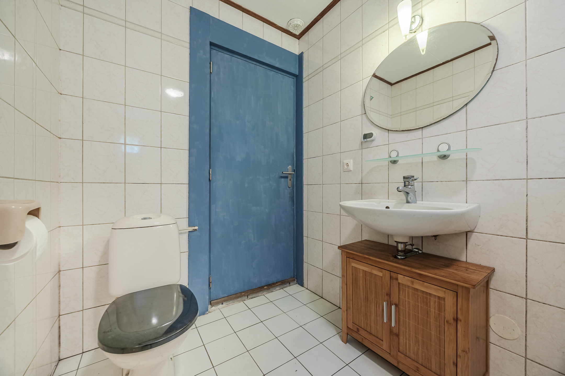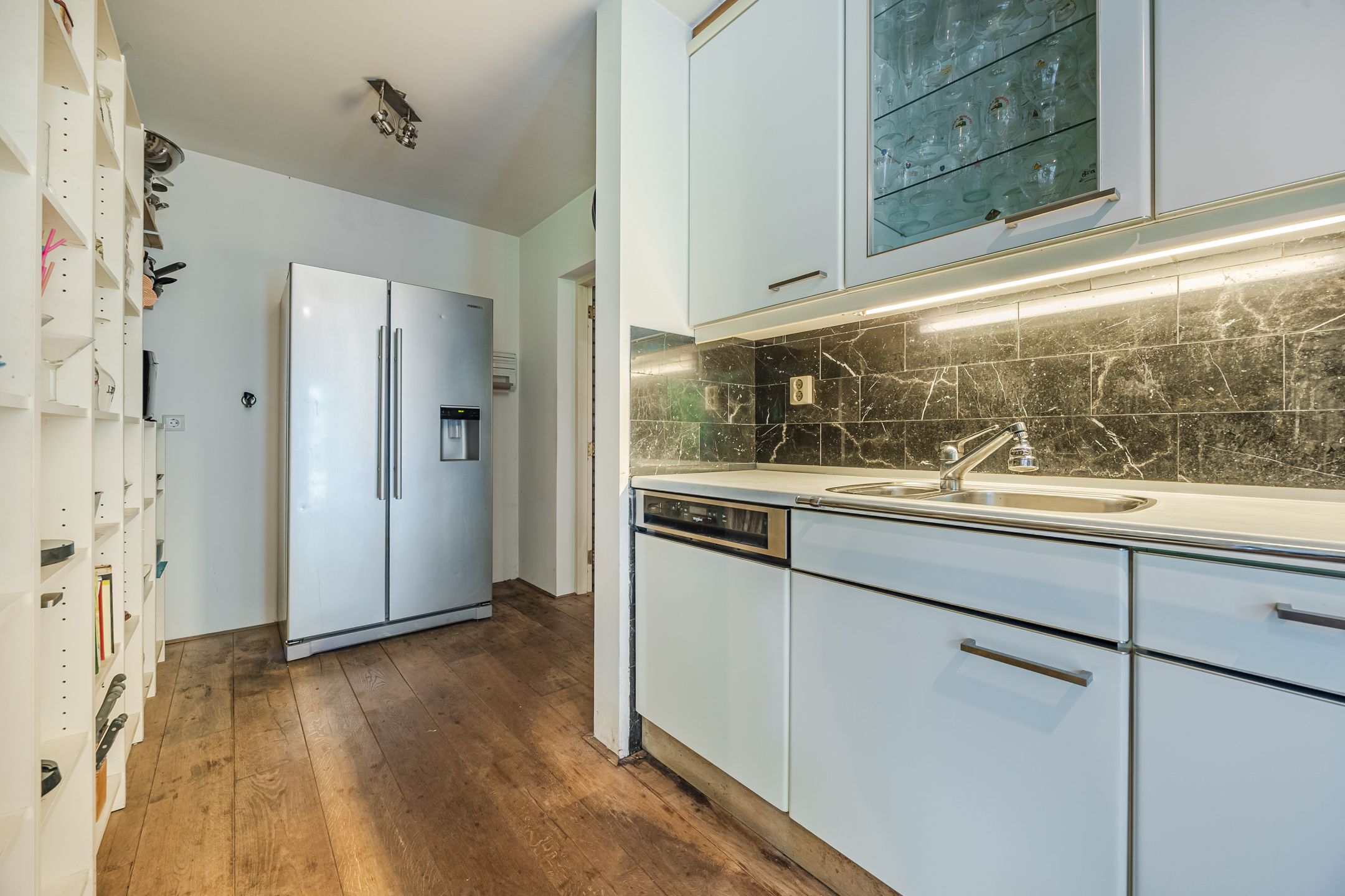 De keuken grenst direct aan zowel de woonkamer als de bijkeuken en vormt daarmee een praktisch middelpunt van de woning. De inrichting is eenvoudig maar functioneel, met volop werk- en kastruimte om dagelijks comfortabel te koken. Vanuit de keuken loop je gemakkelijk door naar de bijkeuken (de voormalige garage), waar aansluitingen voor wasmachine en droger aanwezig zijn en extra bergruimte voorhanden is. Hier vind je bovendien toegang tot de slaapkamer op de begane grond, die direct grenst aan een complete badkamer met ligbad, toilet en wastafelmeubel. Dit maakt de begane grond niet alleen verrassend veelzijdig, maar ook geschikt voor levensloopbestendig wonen of een kantoor/praktijk aan huis.