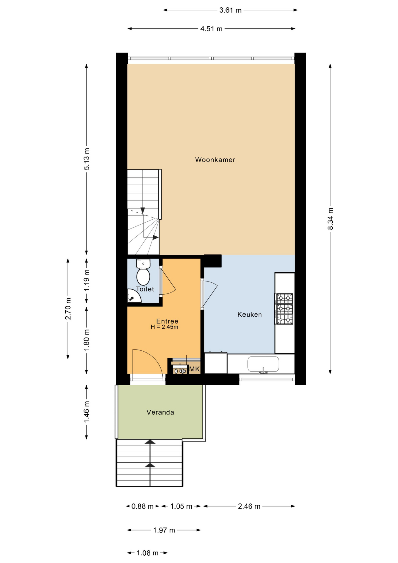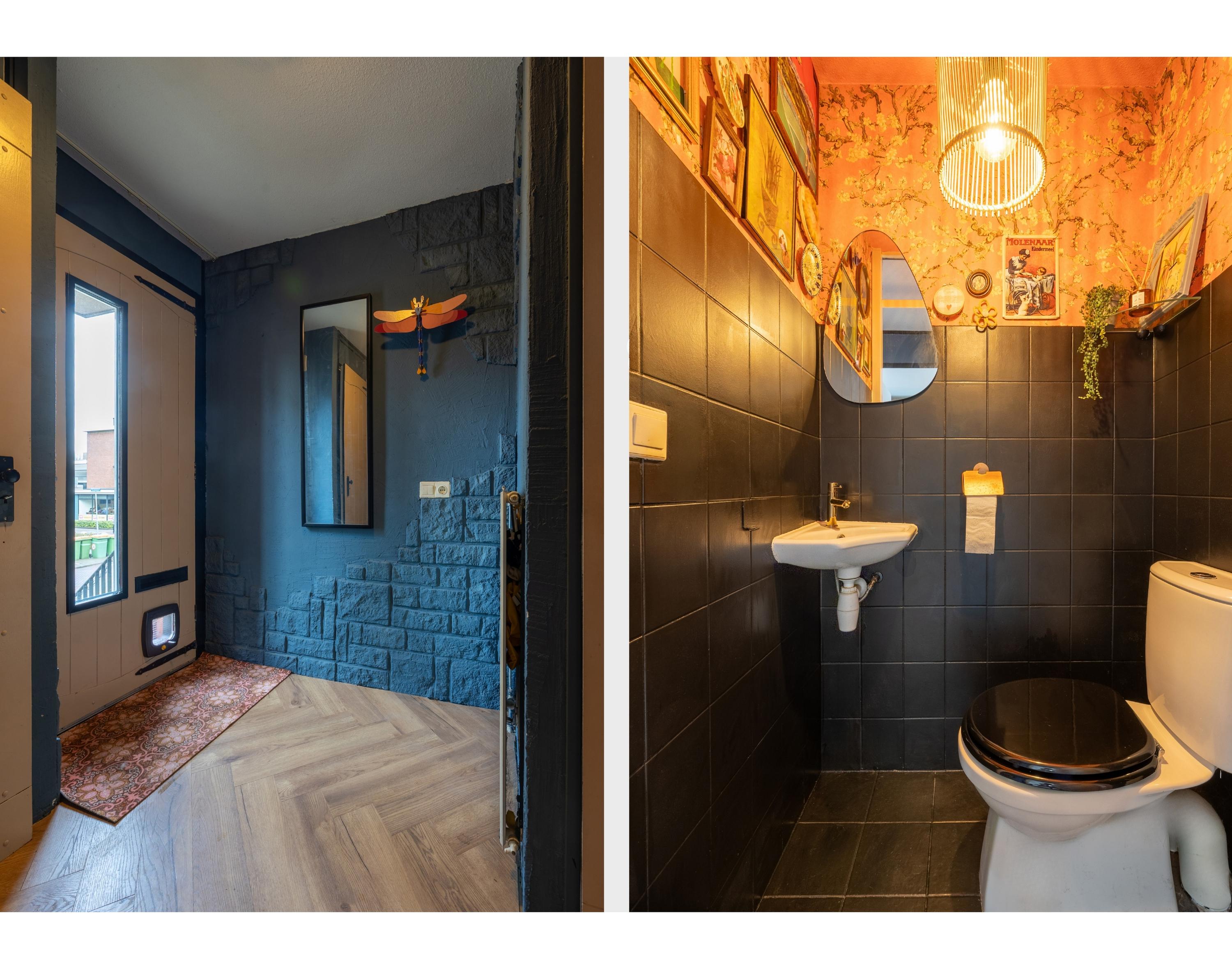 Binnenkomst via de hal met meterkast en toiletruimte. Vanuit hier toegang tot de eetkamer en open keuken.