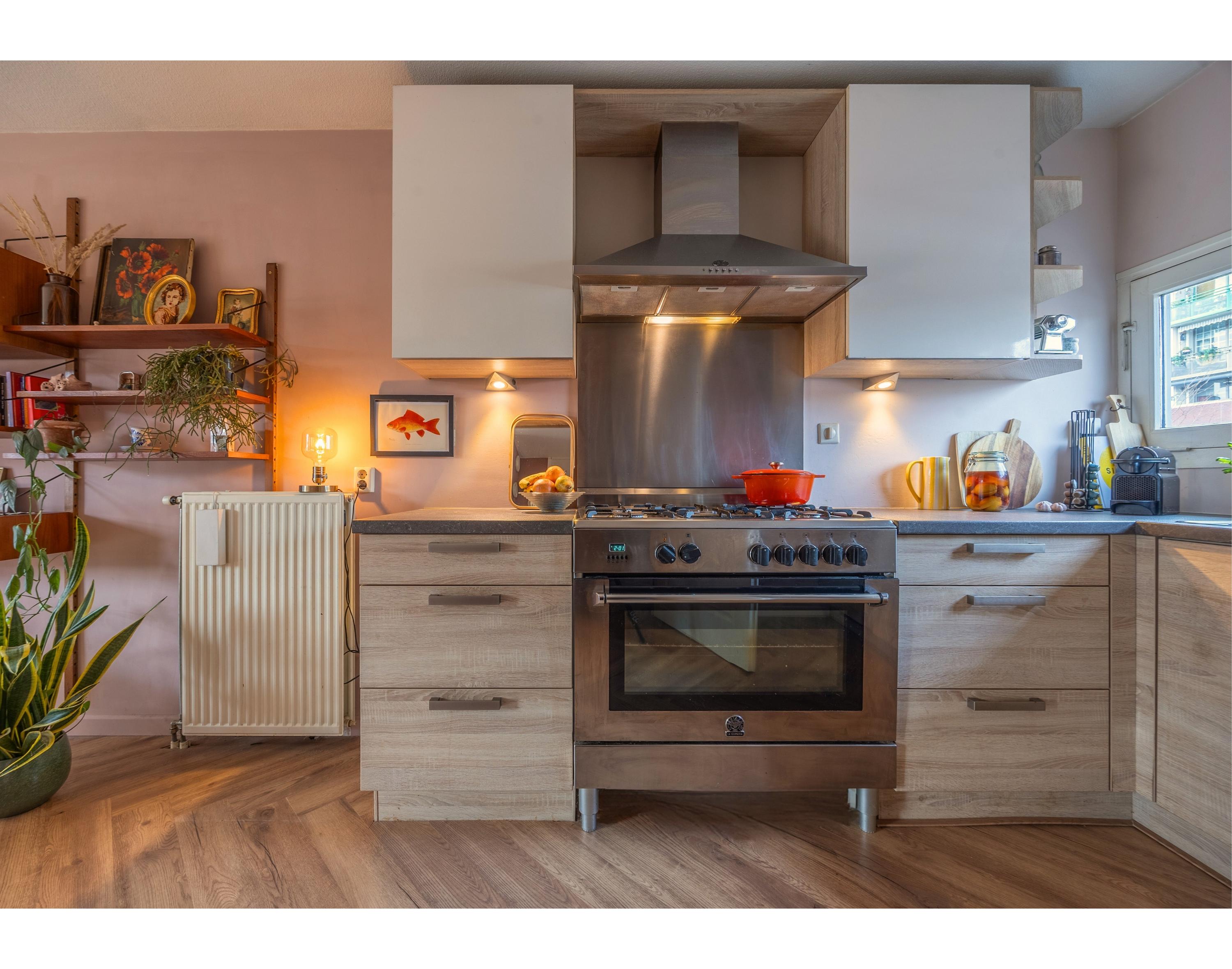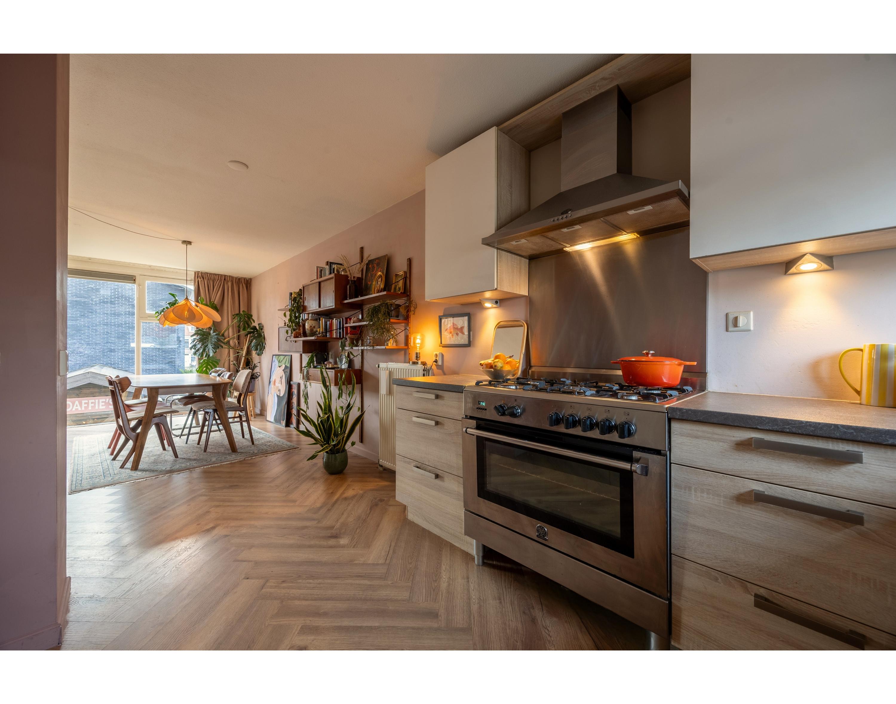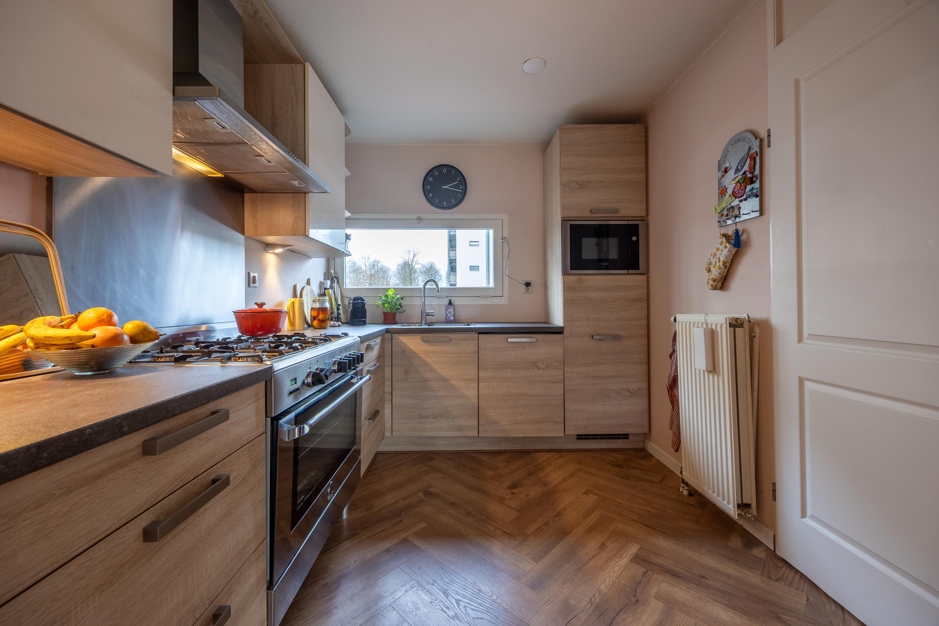 De open keuken is praktisch ingericht in hoekopstelling en uitgerust met een 5-pits gaskookplaat, RVS afzuigkap, koelkast, vaatwasser, oven en magnetron, aangevuld met diverse boven- en onderkasten.