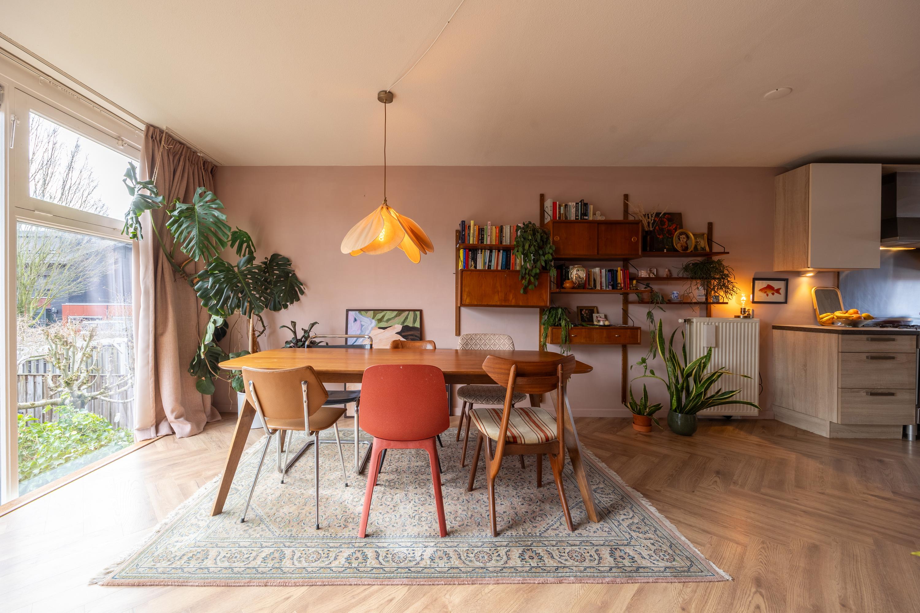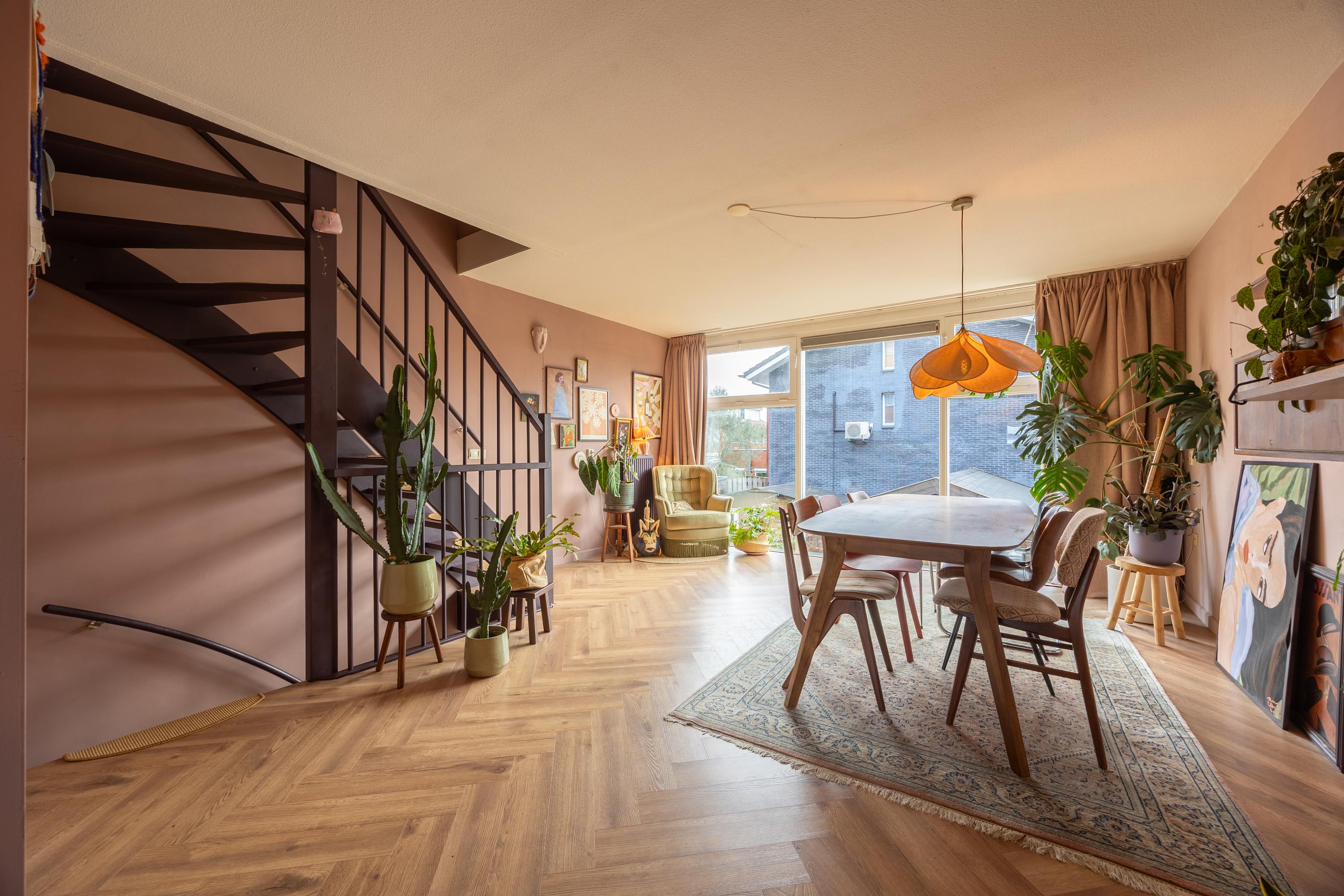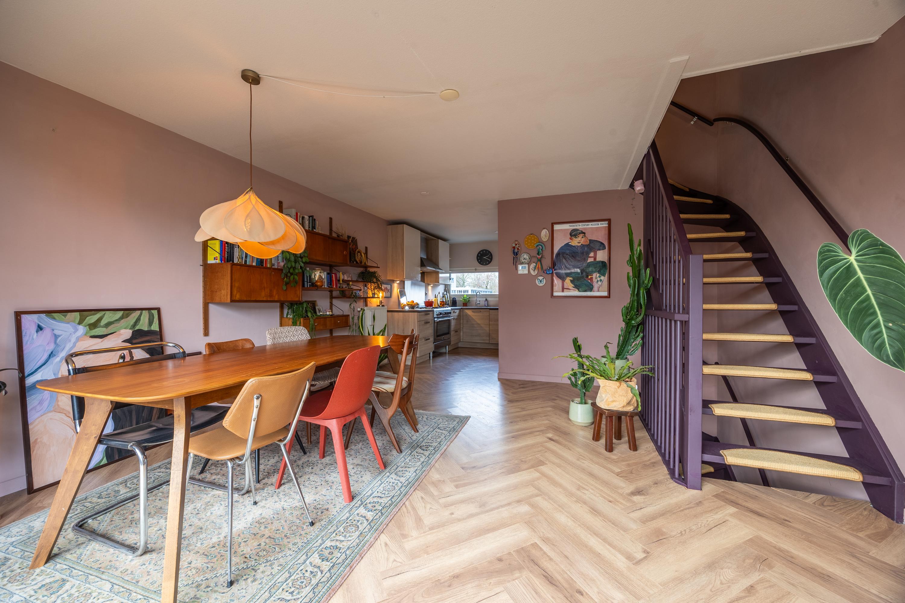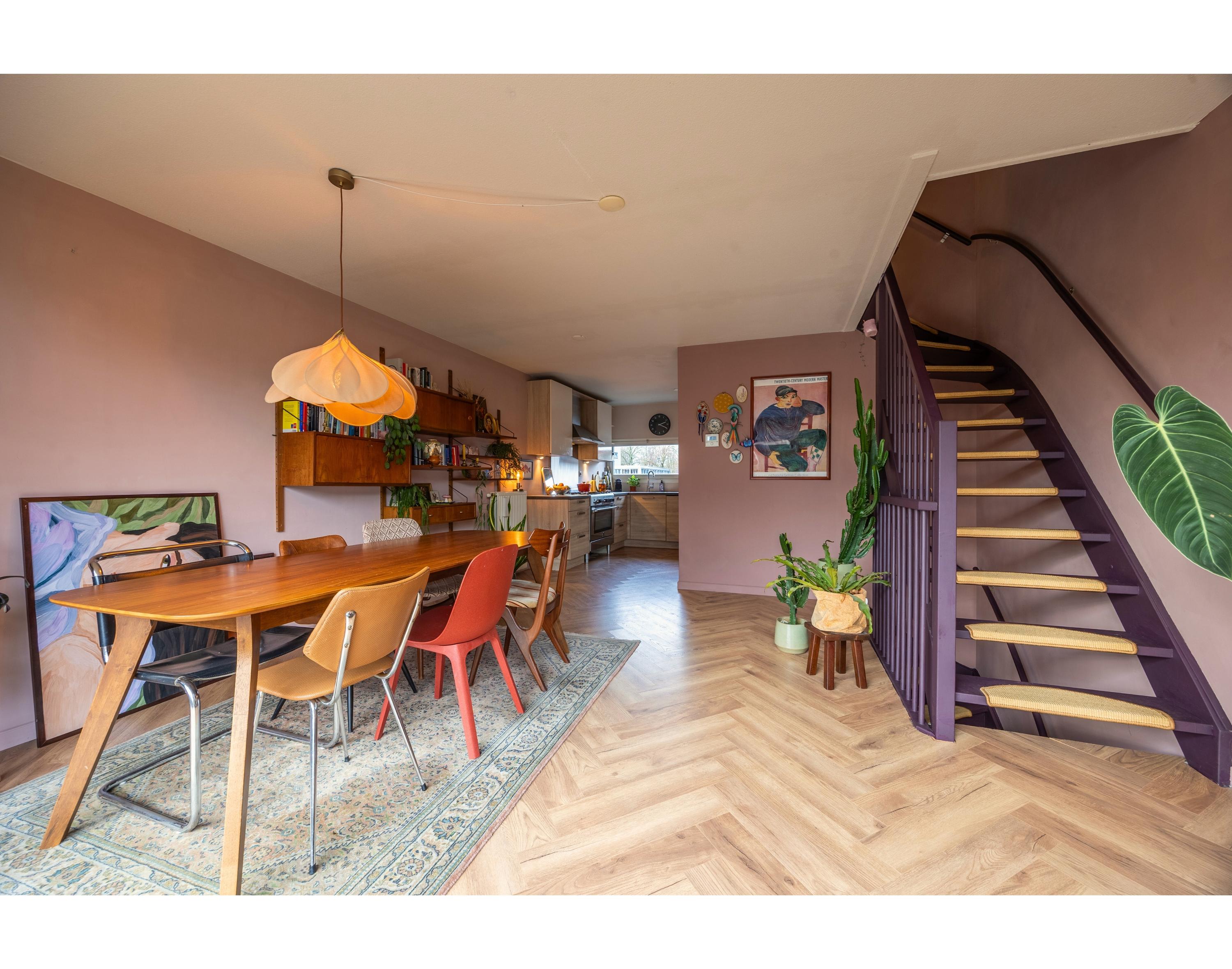 De eetkamer is licht en sfeervol, voorzien van een visgraatvloer en grote raampartijen die zorgen voor een fijne lichtinval. De open verbinding met de keuken en de trap naar zowel de eerste verdieping als het souterrain geven de ruimte een speels en ruimtelijk karakter.