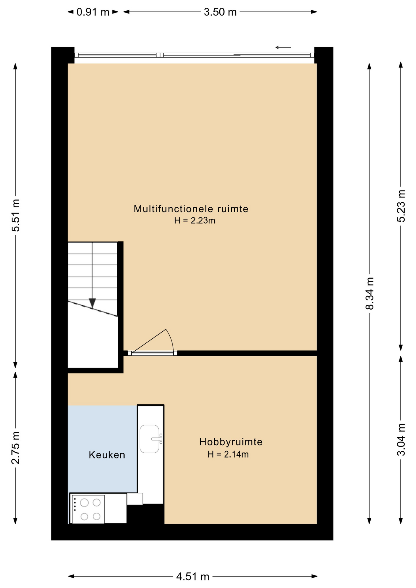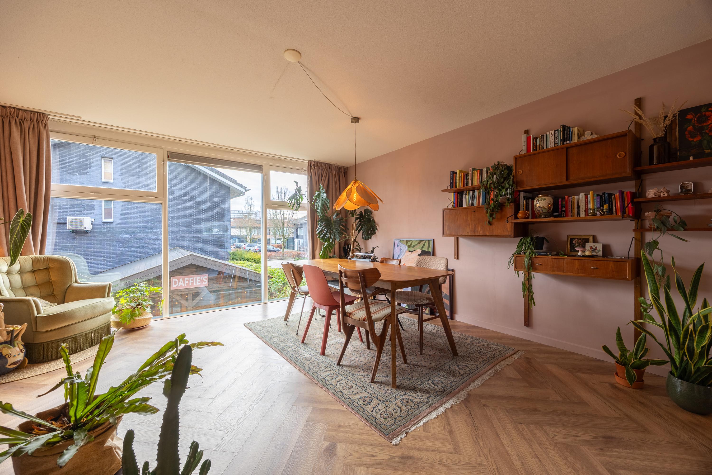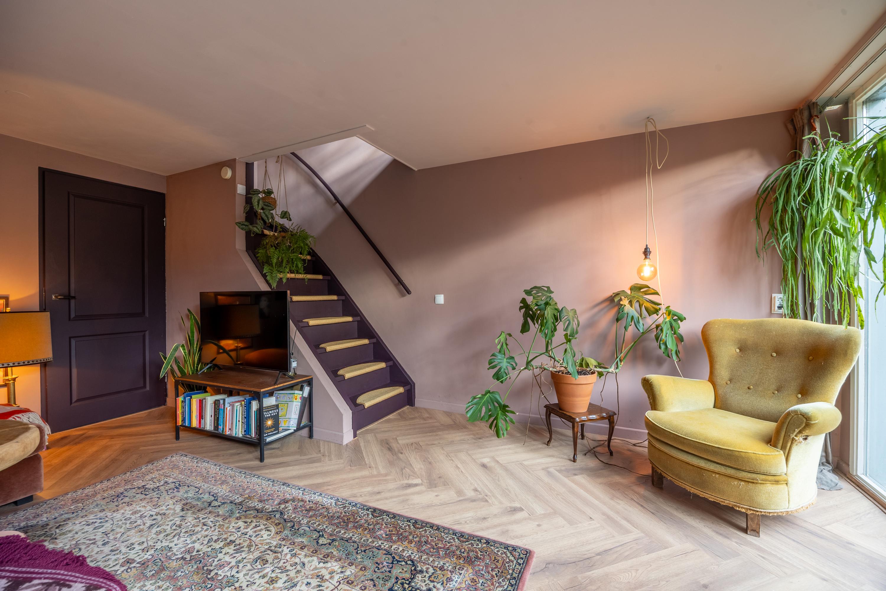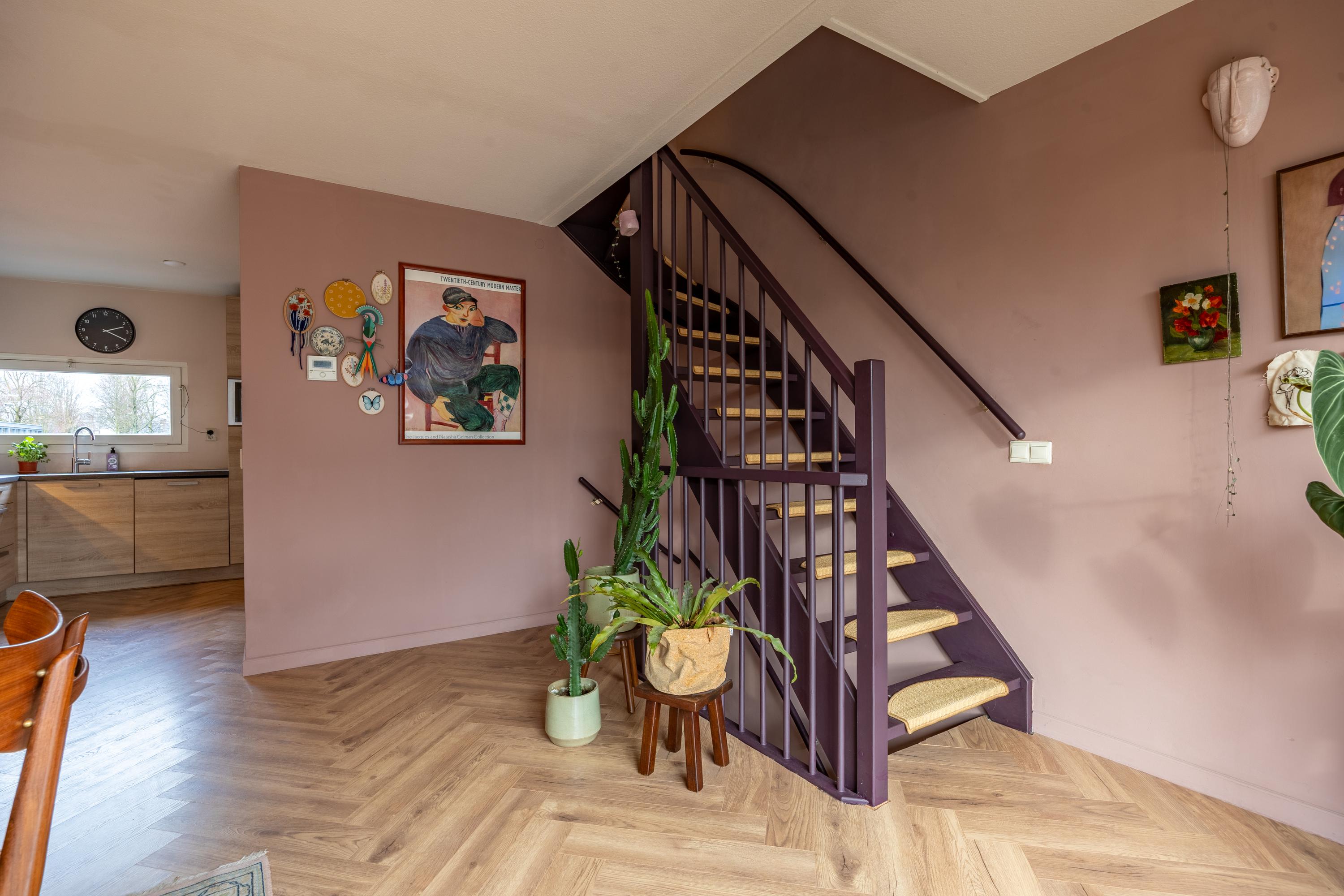 De eetkamer is licht en sfeervol, voorzien van een visgraatvloer en grote raampartijen die zorgen voor een fijne lichtinval. De open verbinding met de keuken en de trap naar zowel de eerste verdieping als het souterrain geven de ruimte een speels en ruimtelijk karakter.