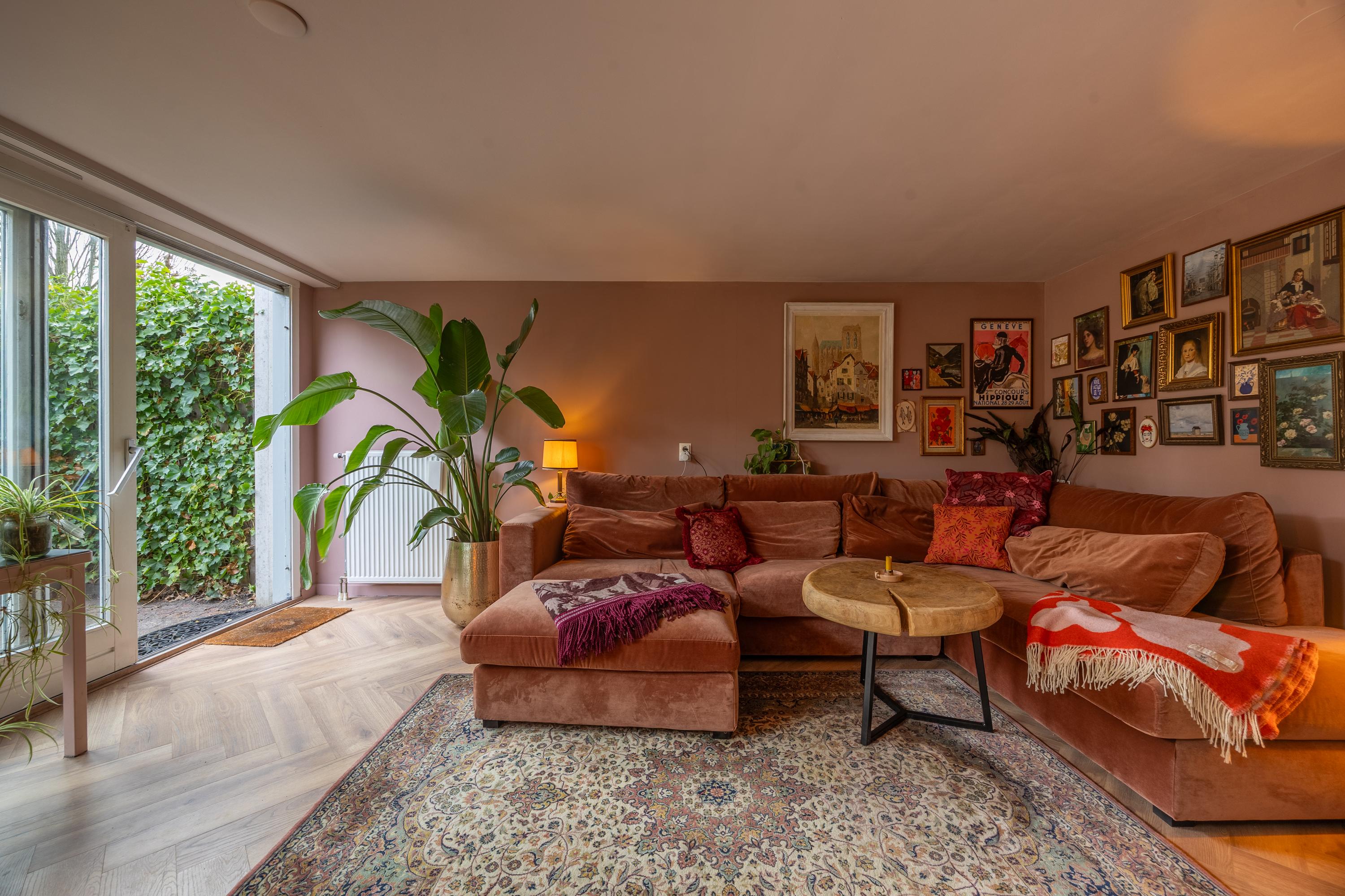 Een absolute eyecatcher van deze woning: de sfeervolle zitkamer met visgraatvloer en directe toegang tot de tuin via de schuifpui. Deze ruimte ligt circa één meter onder het maaiveld en beschikt over een gezellige bar, ideaal voor ontspannen avonden, thuiswerken of het ontvangen van gasten.
