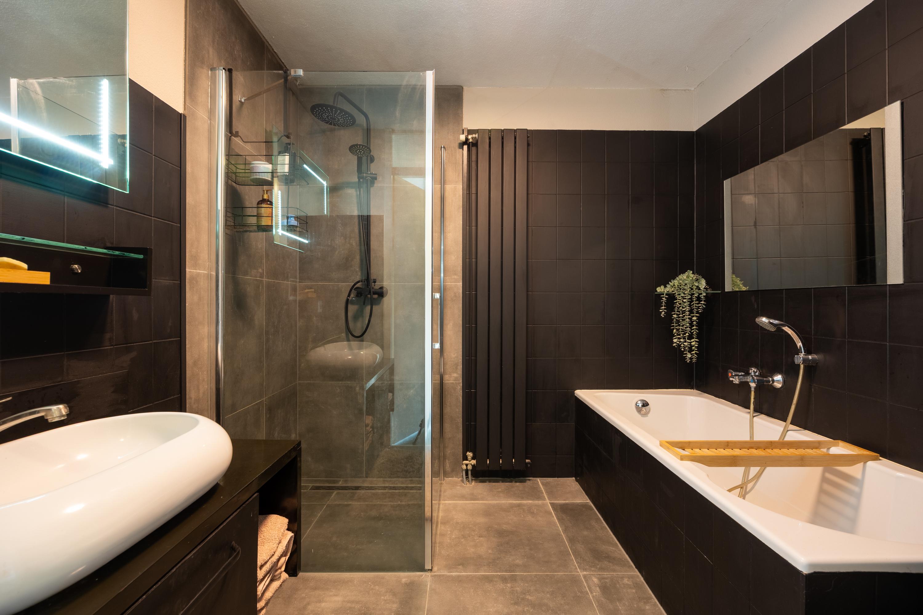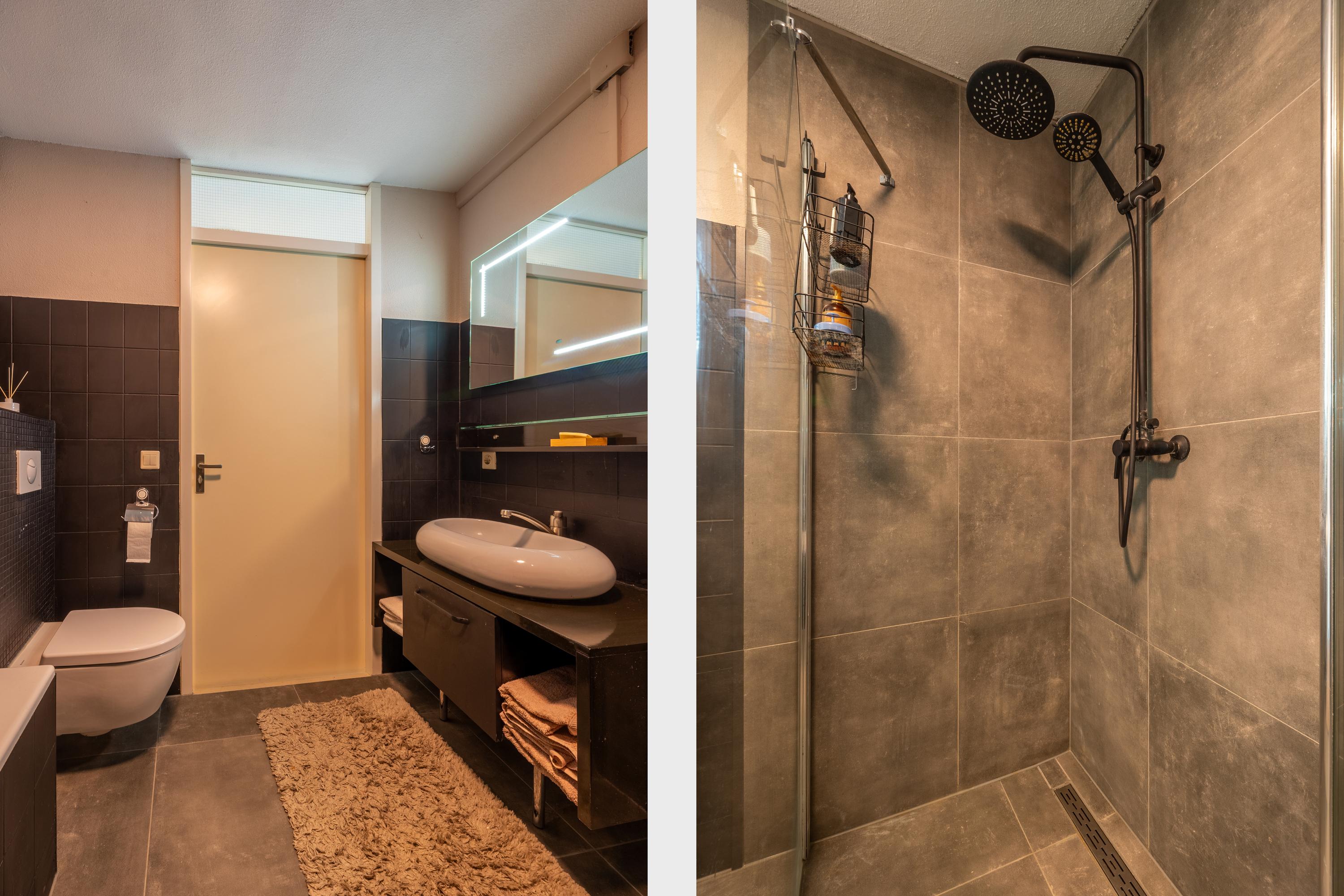 De badkamer is volledig betegeld en voorzien van een inloopdouche, ligbad, wastafelmeubel en een tweede toilet.
