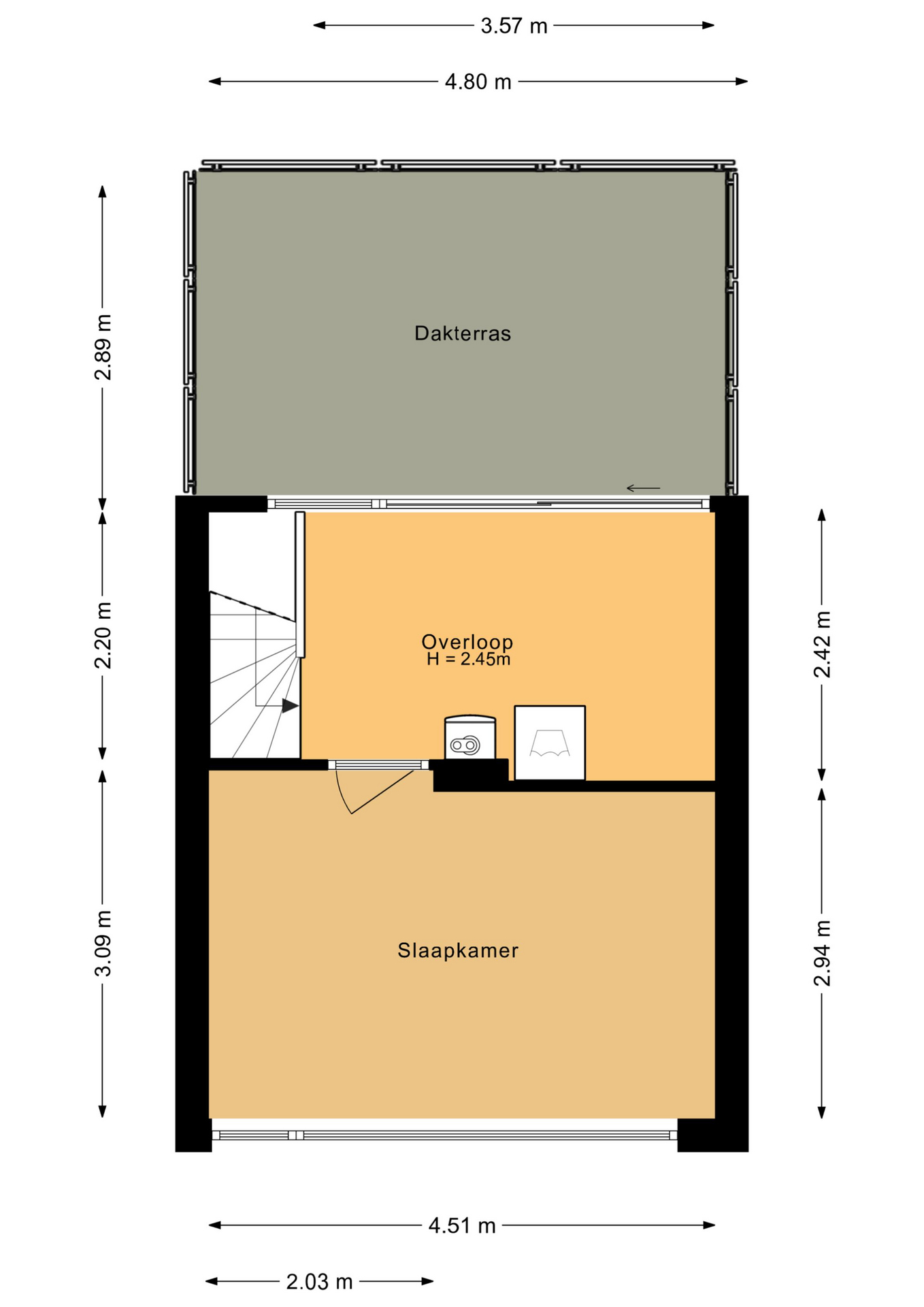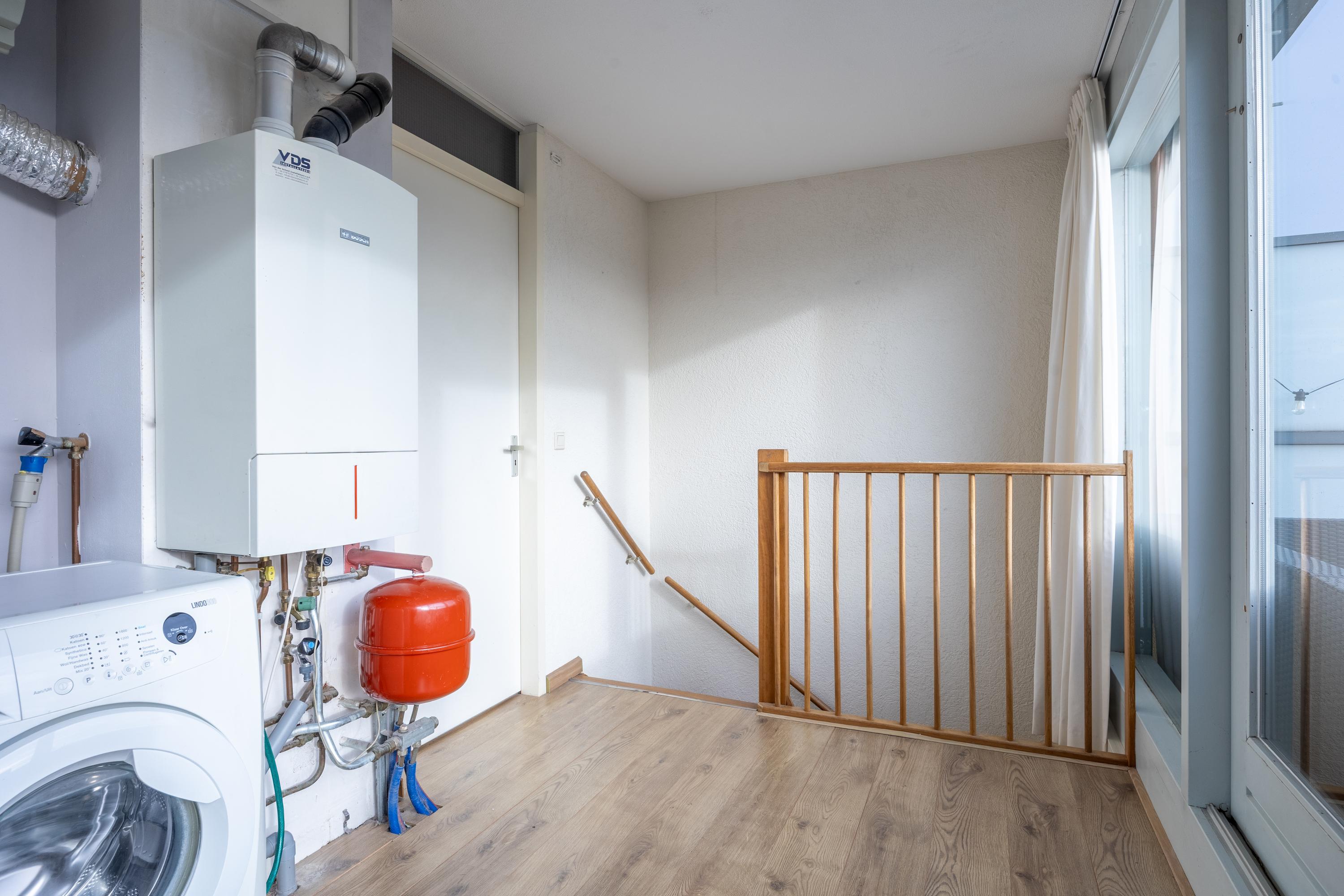 Overloop met opstelplaats van de cv-installatie (Bosch HR, 2009), mechanische ventilatie en aansluitingen voor wasapparatuur. Vanuit hier is er toegang tot de derde slaapkamer en het zonnige dakterras via een schuifpui.