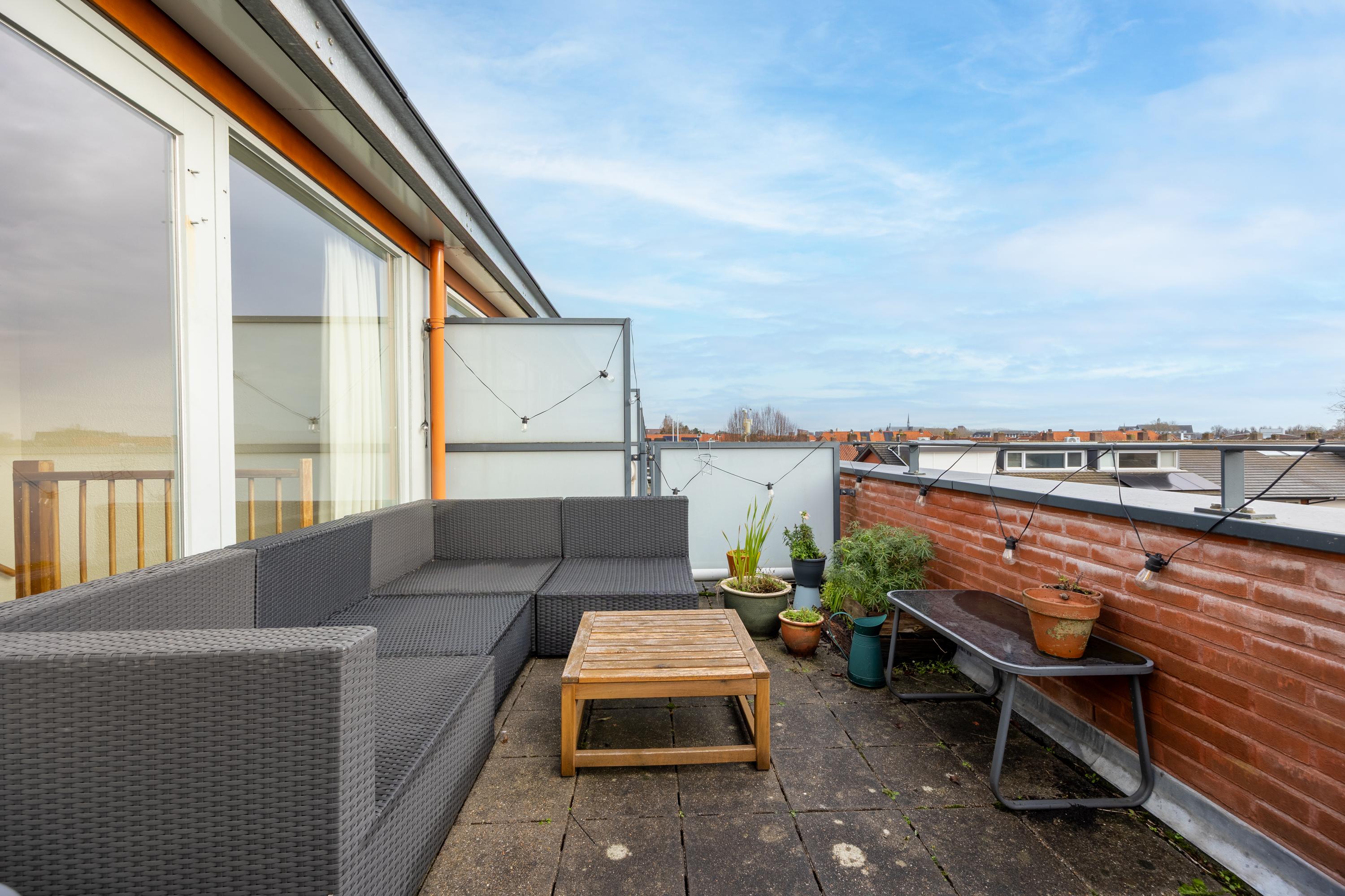 Het dakterras op het zuidwesten is een heerlijke plek om in alle rust van de zon te genieten, met uitzicht over de wijk en volop privacy.