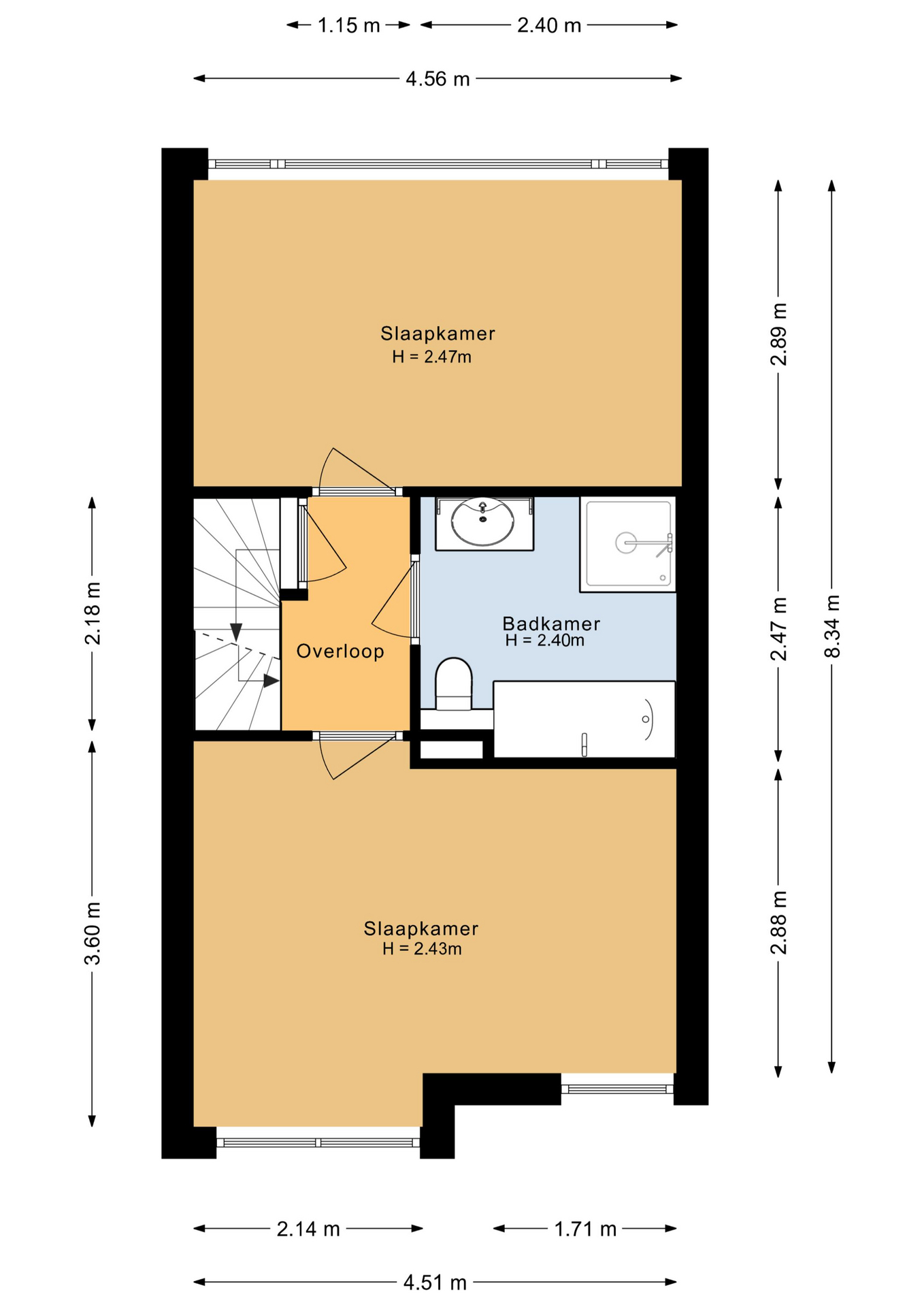 Overloop met toegang tot twee slaapkamers, de badkamer en de trap naar de tweede verdieping.