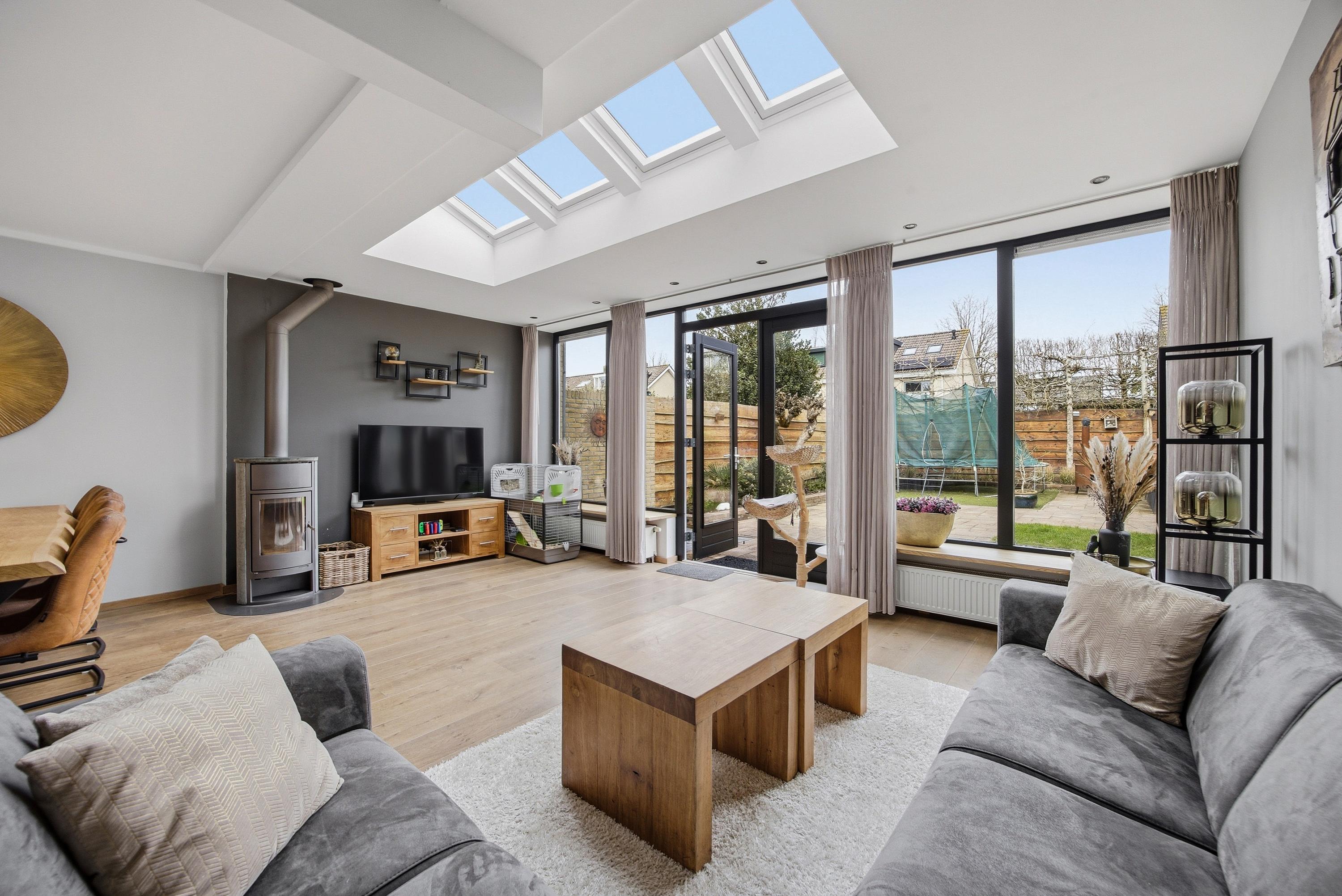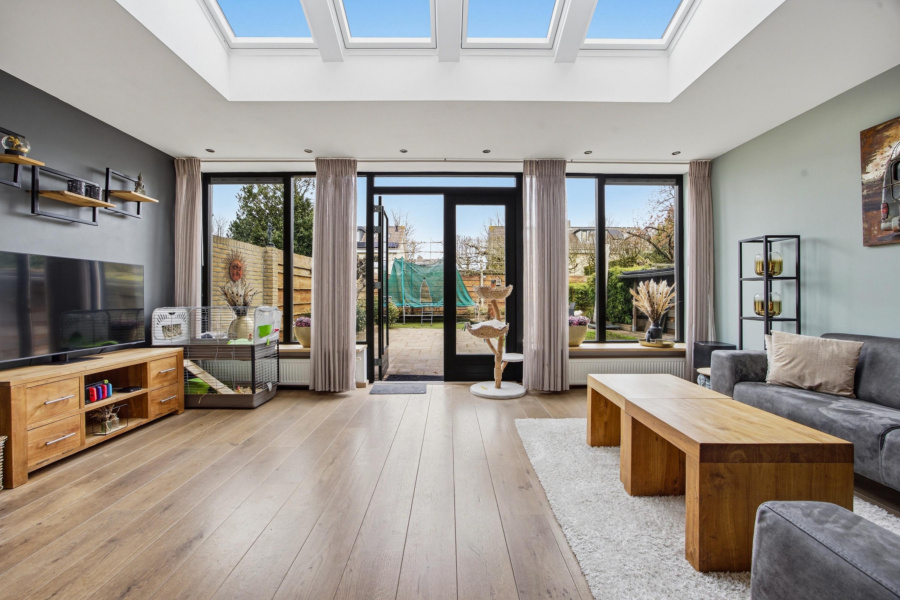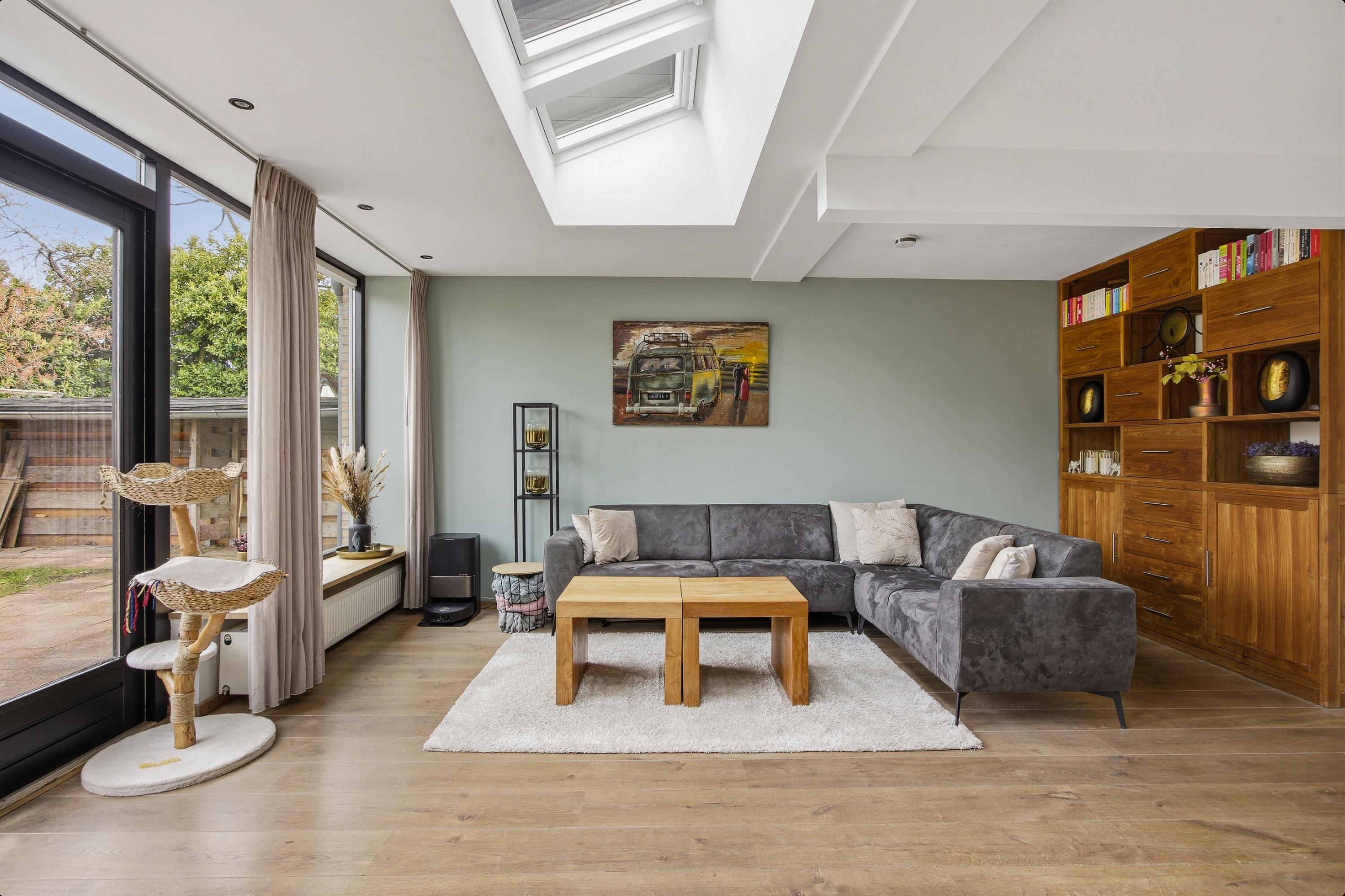 De uitgebouwde woonkamer is een echte leefruimte: royaal, licht en perfect in te delen. De lichtstraat en grote raampartijen aan voor- en achterzijde zorgen voor een prettige lichtinval en een open sfeer. Hier ervaar je direct de ruimte die deze woning te bieden heeft.