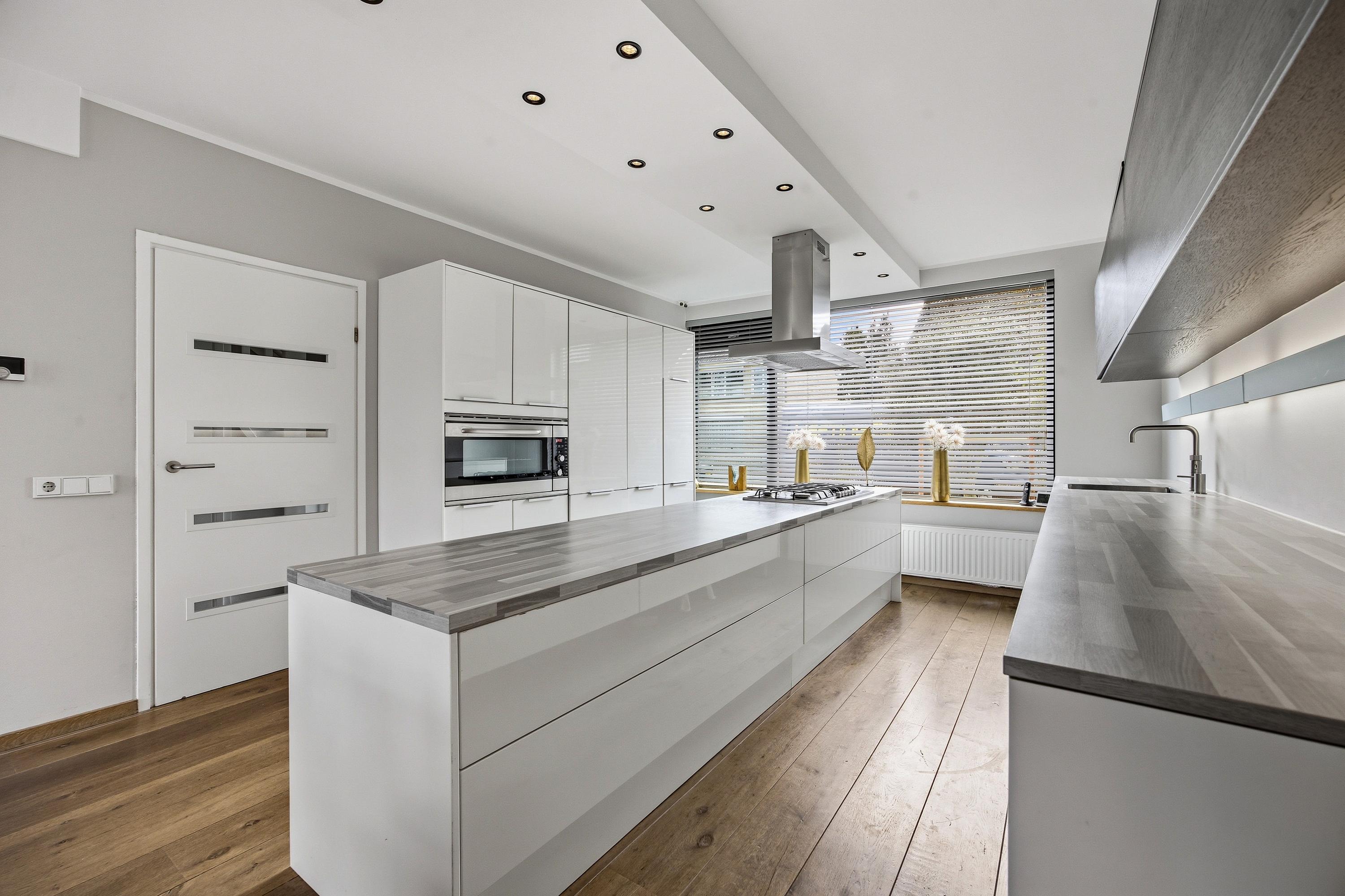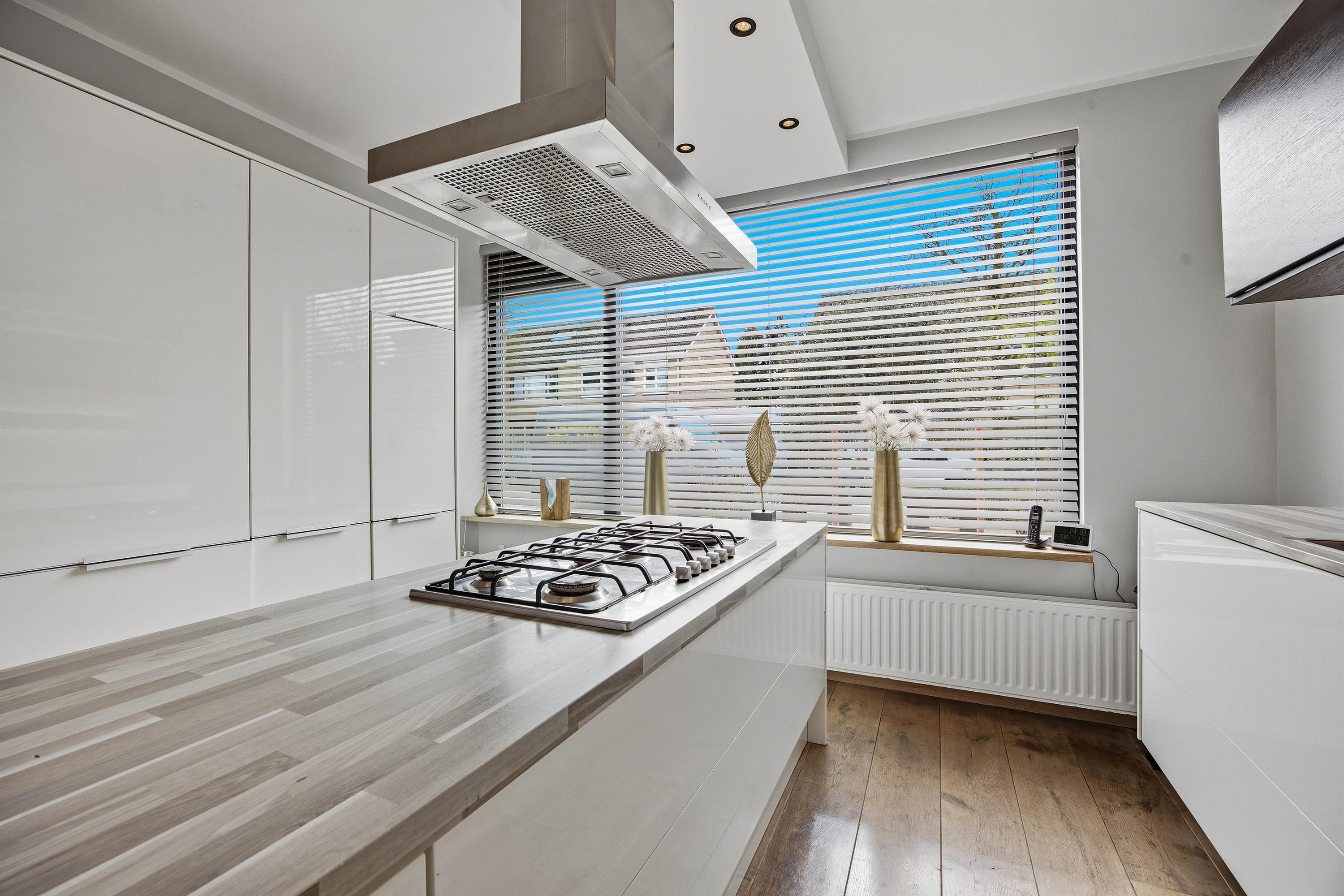 De keuken is modern en ruim opgezet met een kastenwand, kookeiland en aparte spoelzone. Voorzien van alle gewenste inbouwapparatuur, waaronder een 5-pits gaskookplaat, afzuigkap, vaatwasser, koelkast, oven en een Quooker. Ook hier zie je dat gekozen is voor kwaliteit en een praktische indeling, met volop werk- en bergruimte