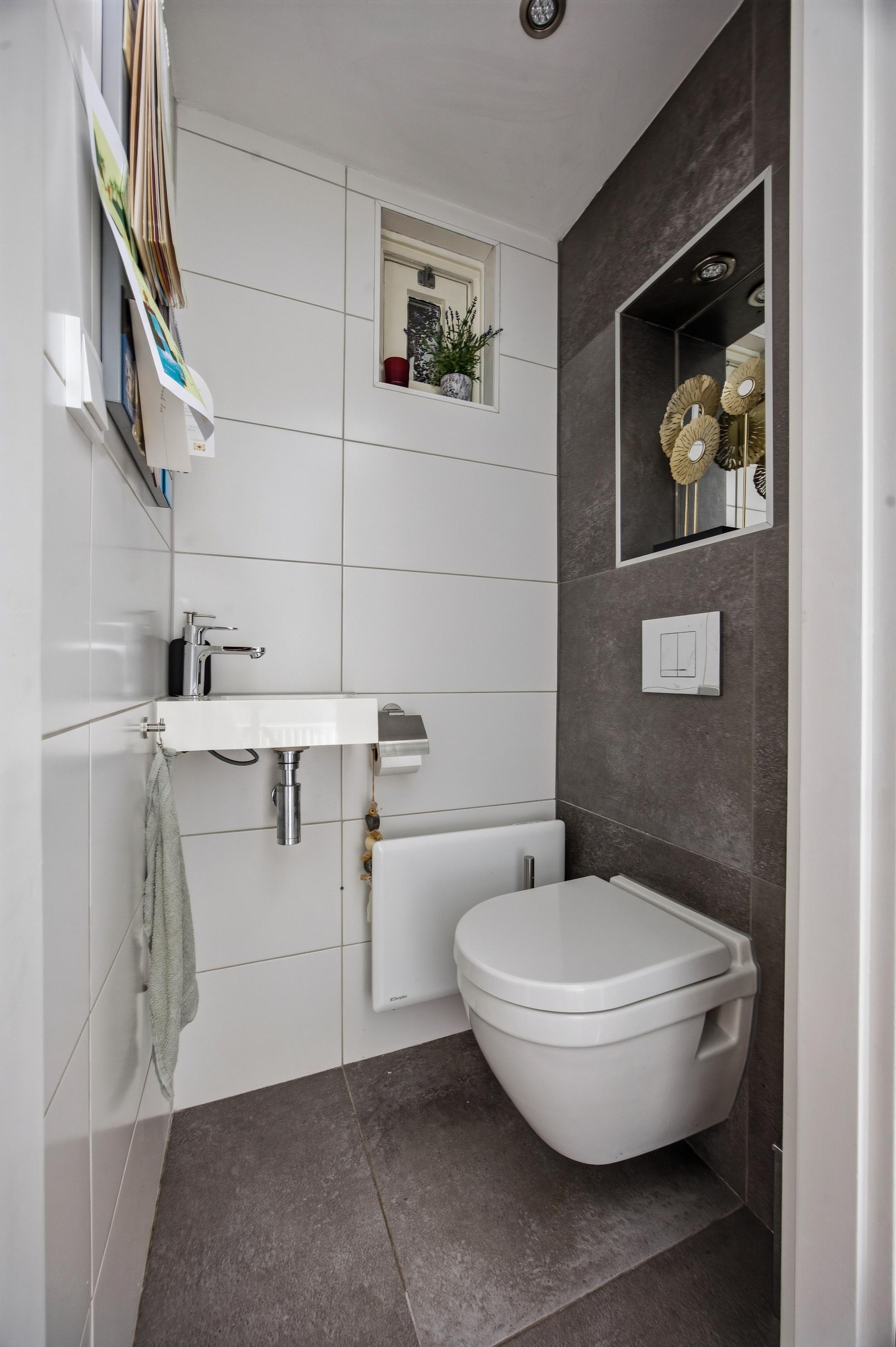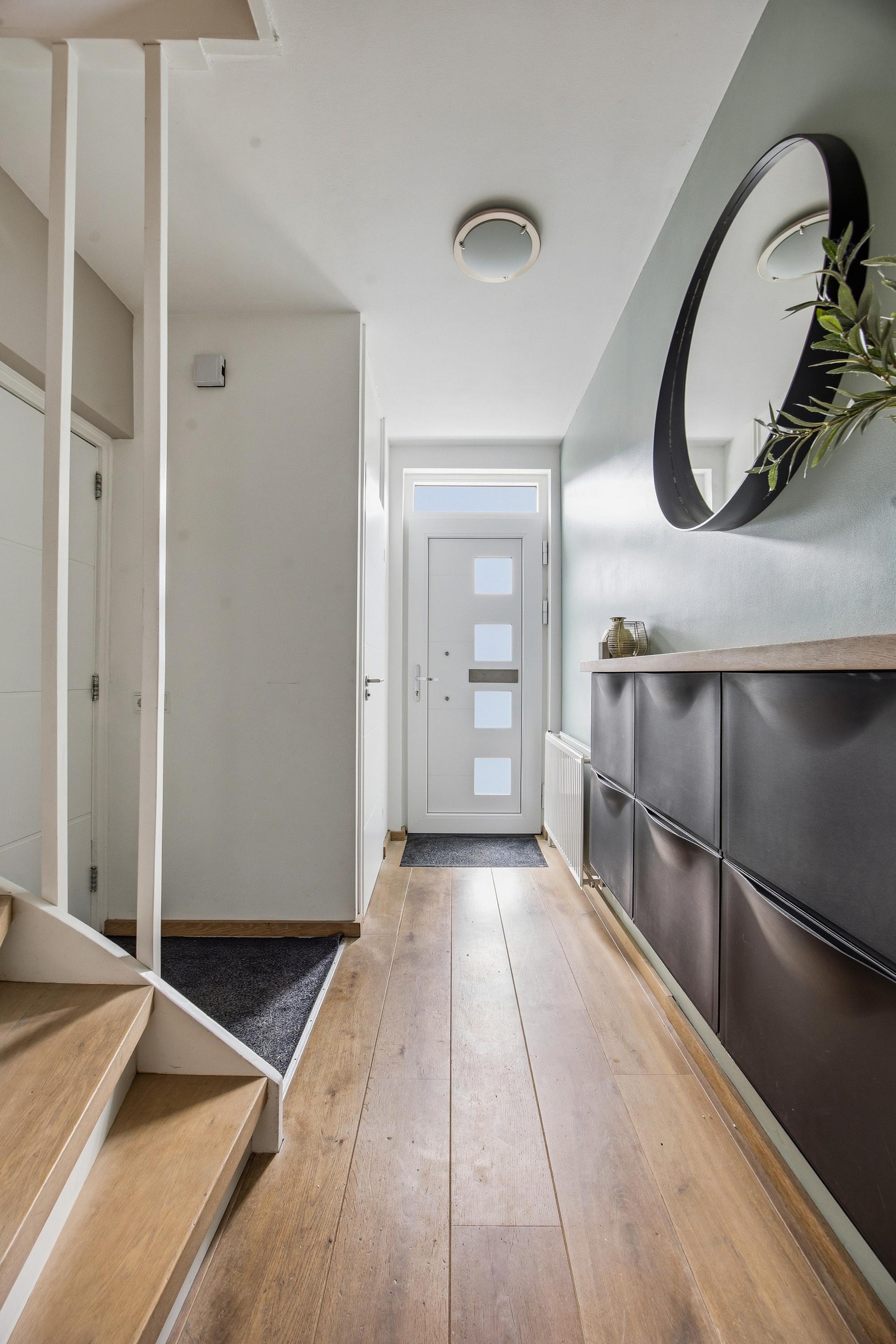 Via de entree kom je in de ruime hal met modern afgewerkt toilet, trapopgang en toegang tot zowel de woonkamer als de inpandige garage, waar de meterkast zit.