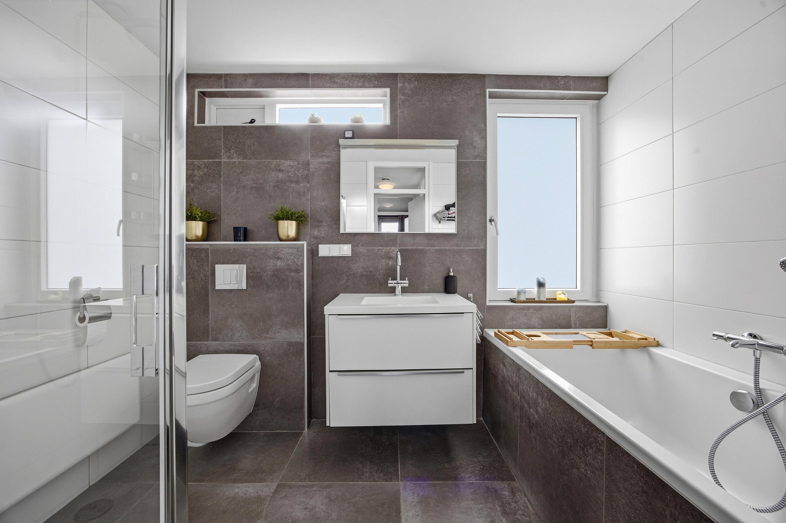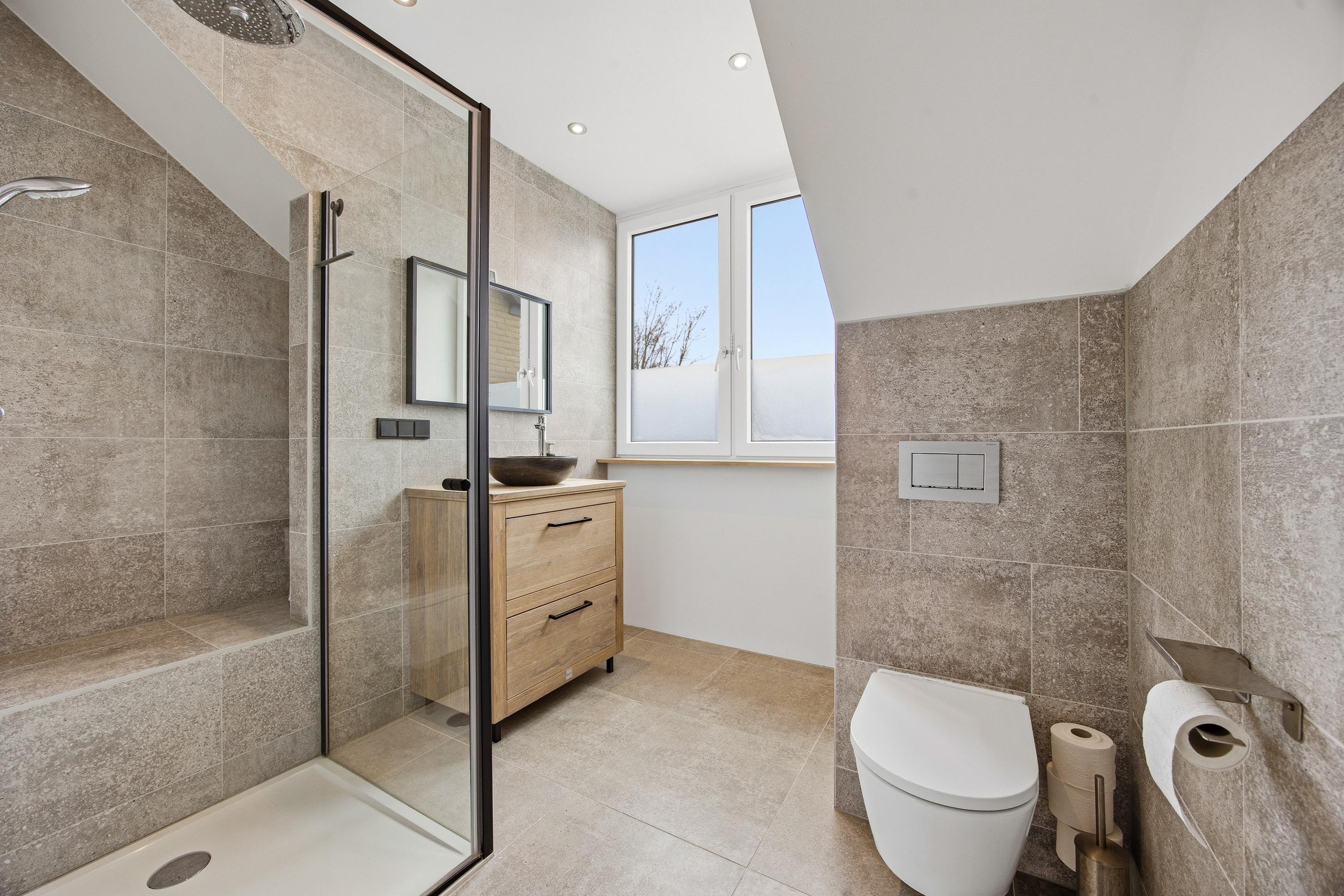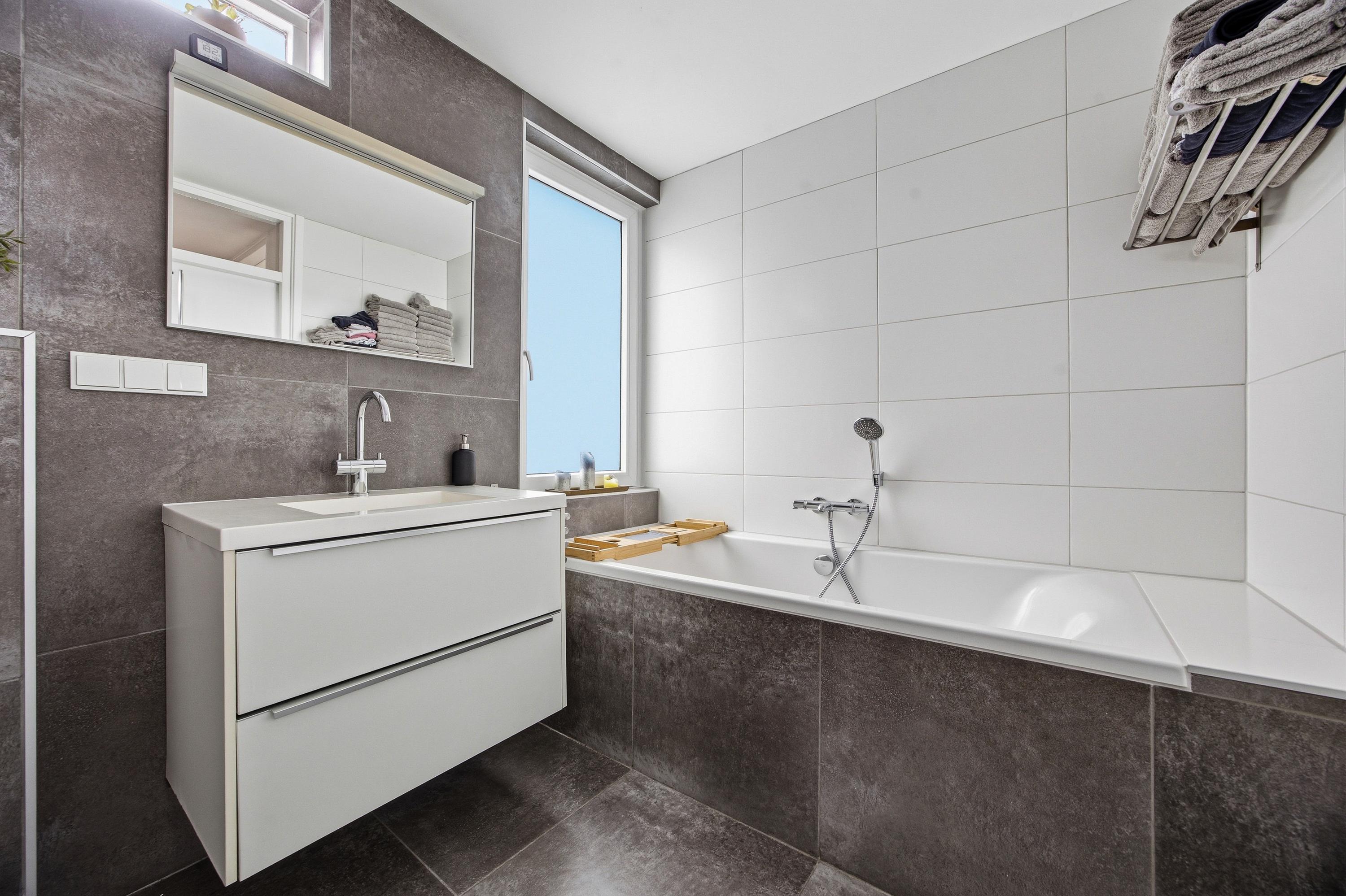 De tweede badkamer is compleet uitgevoerd en voorzien van vloerverwarming, een douche, toilet, wastafel en een ligbad, ideaal voor gezinnen.