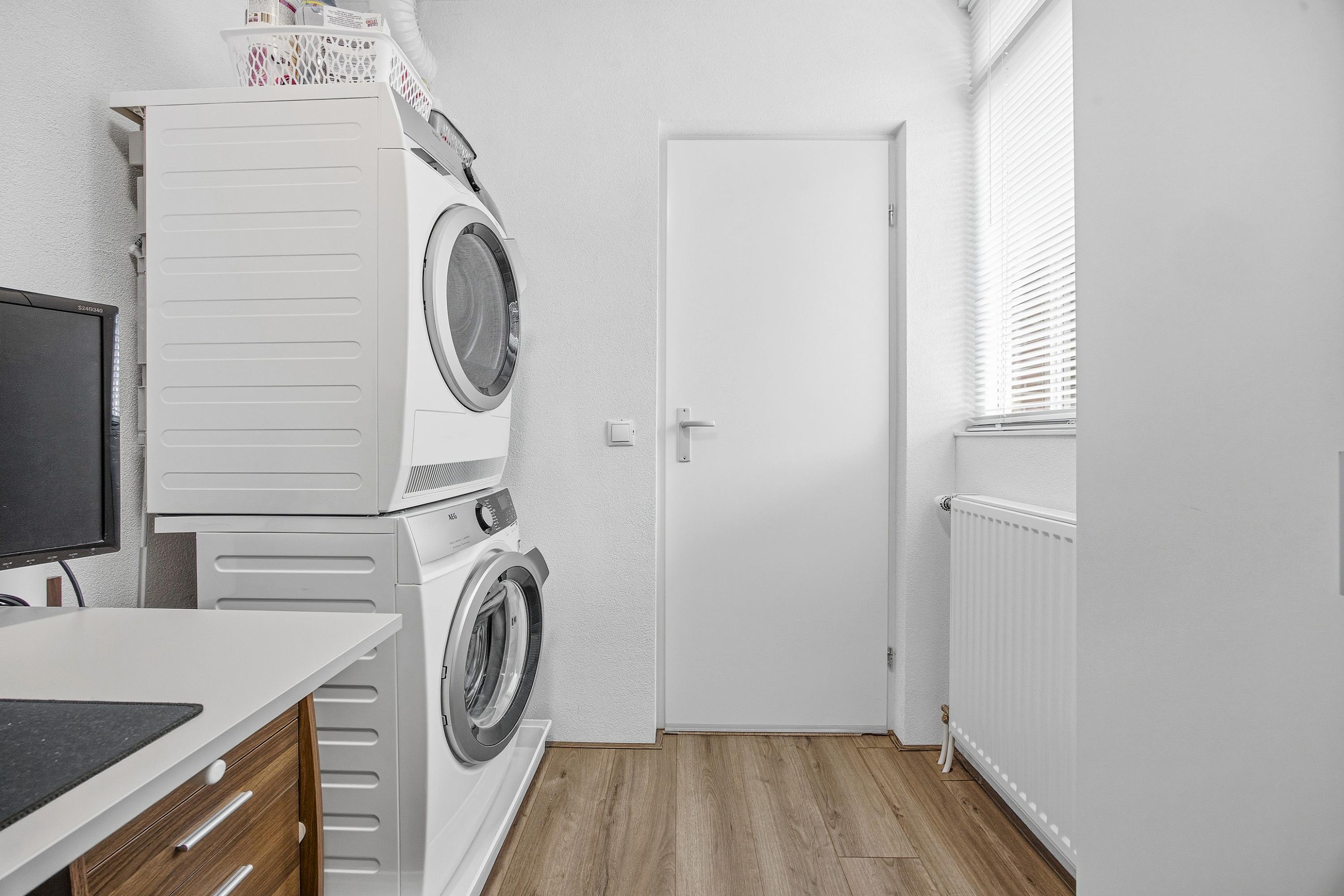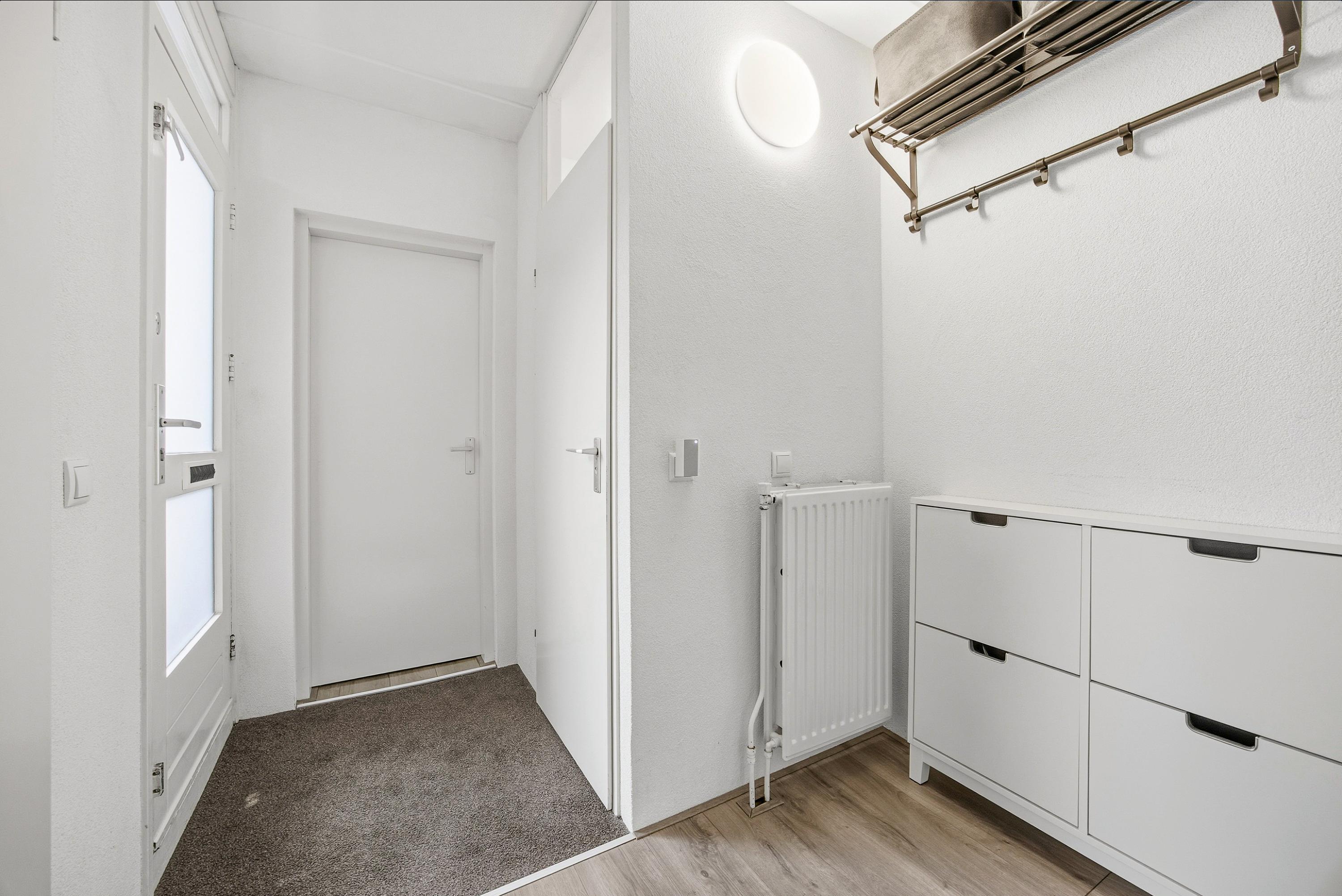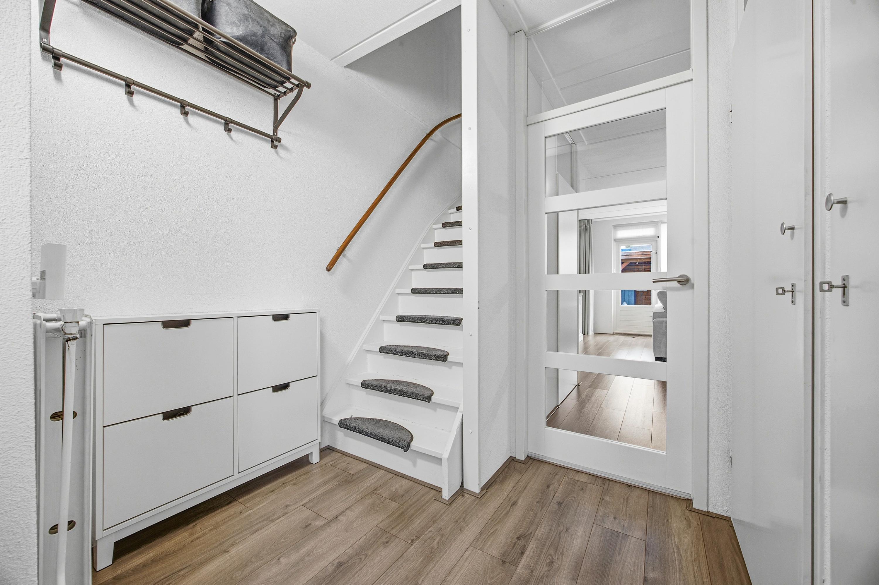 Via de entree kom je in de hal met moderne laminaatvloer, meterkast (stadsverwarming) en een modern toilet met hangend closet. Vanuit hier bereik je de bijkeuken/werkkamer en de trap naar de eerste verdieping.