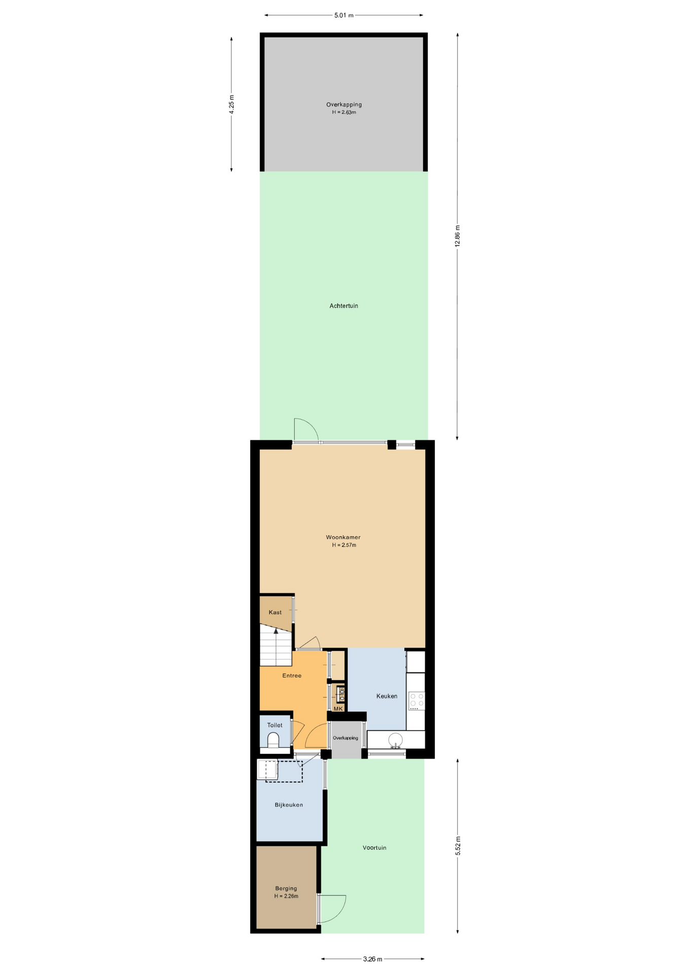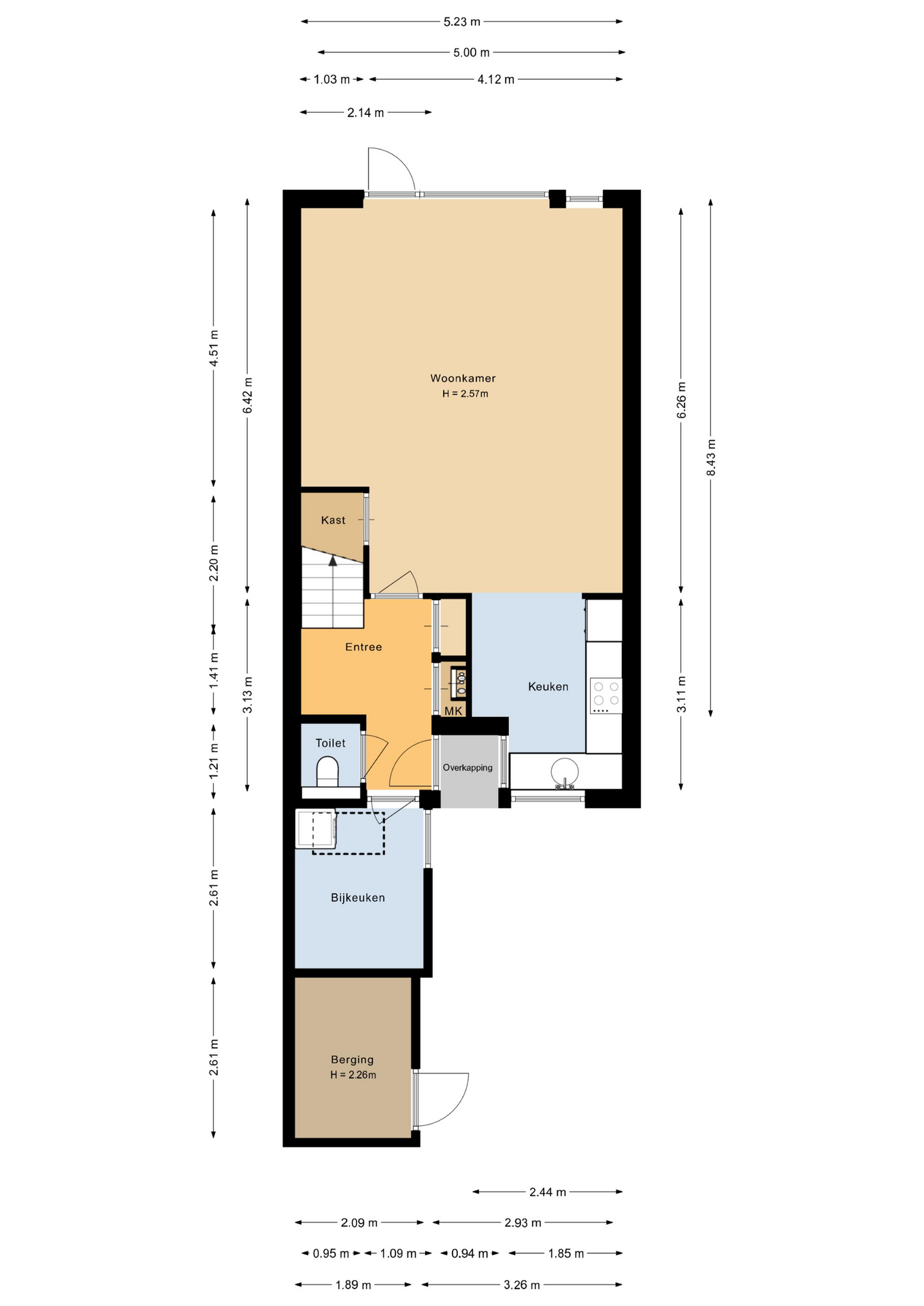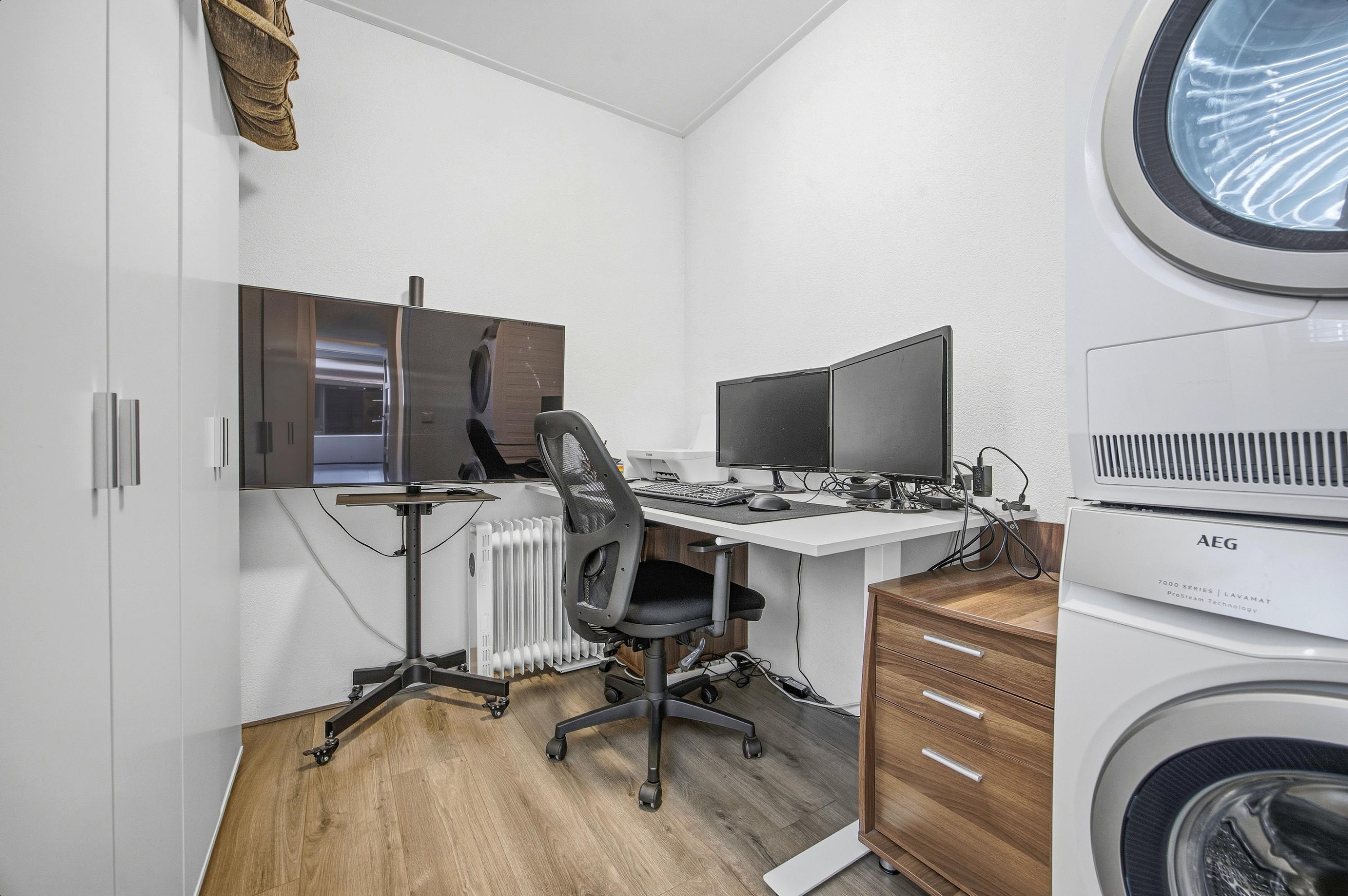 Via de entree kom je in de hal met moderne laminaatvloer, meterkast (stadsverwarming) en een modern toilet met hangend closet. Vanuit hier bereik je de bijkeuken/werkkamer en de trap naar de eerste verdieping.