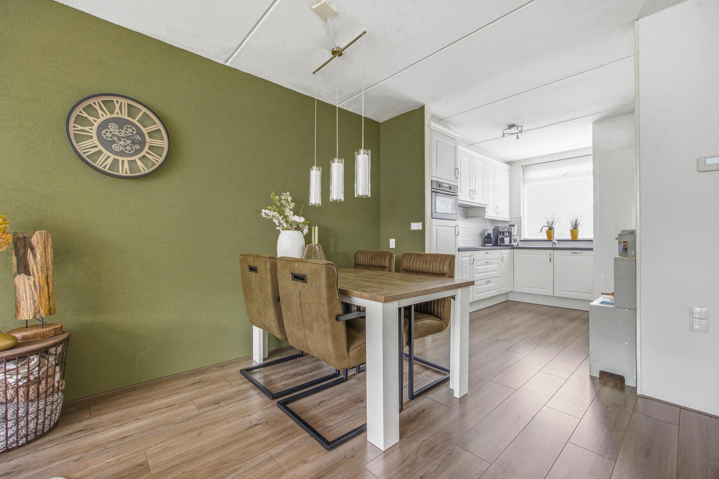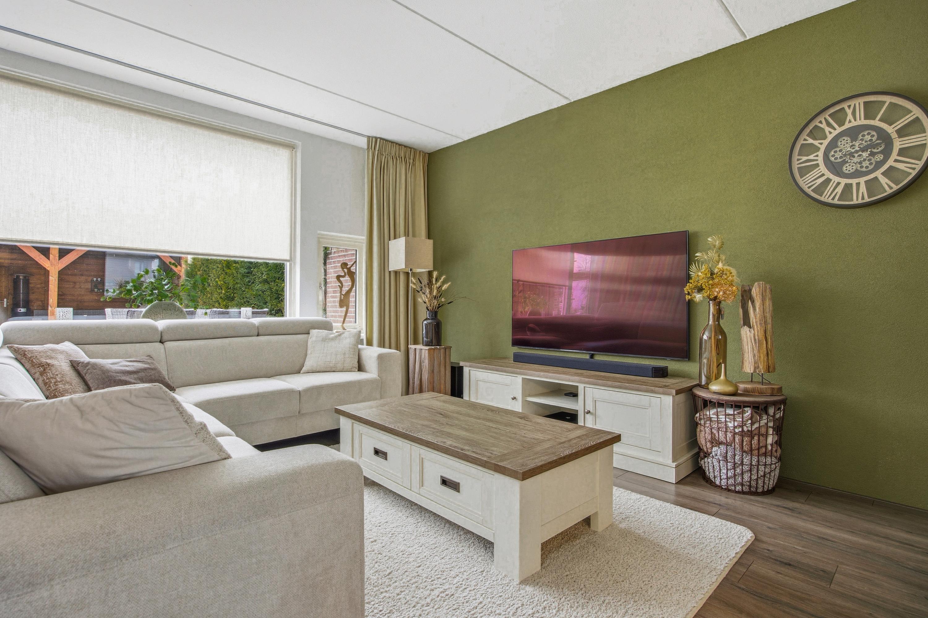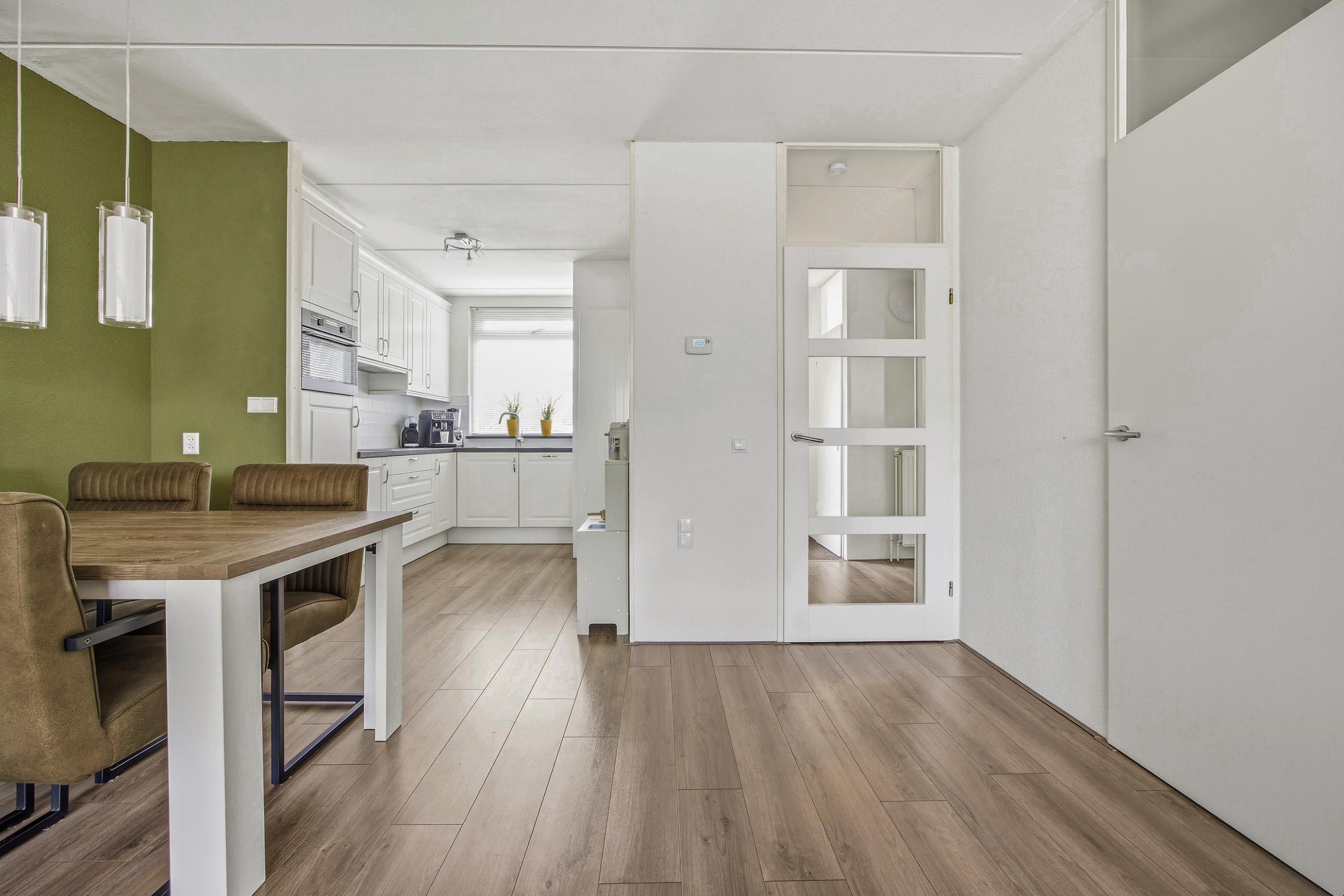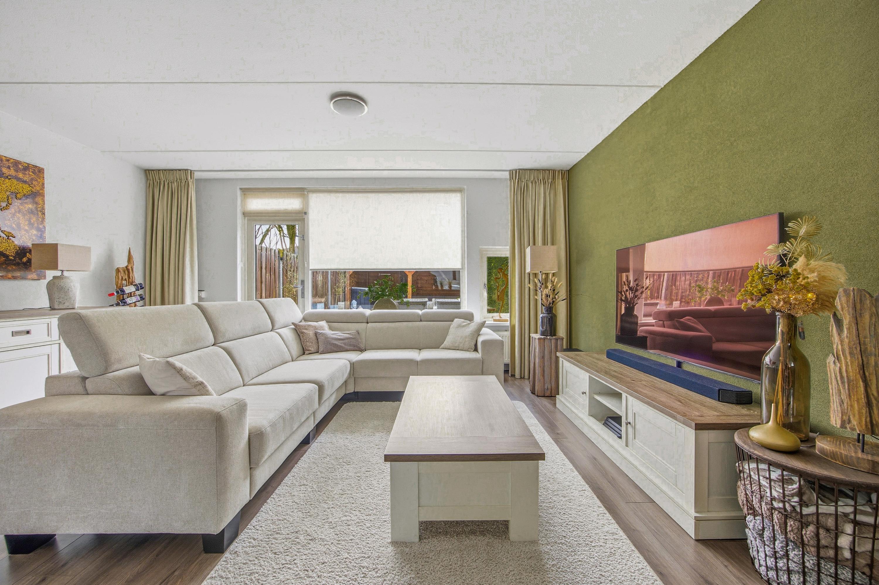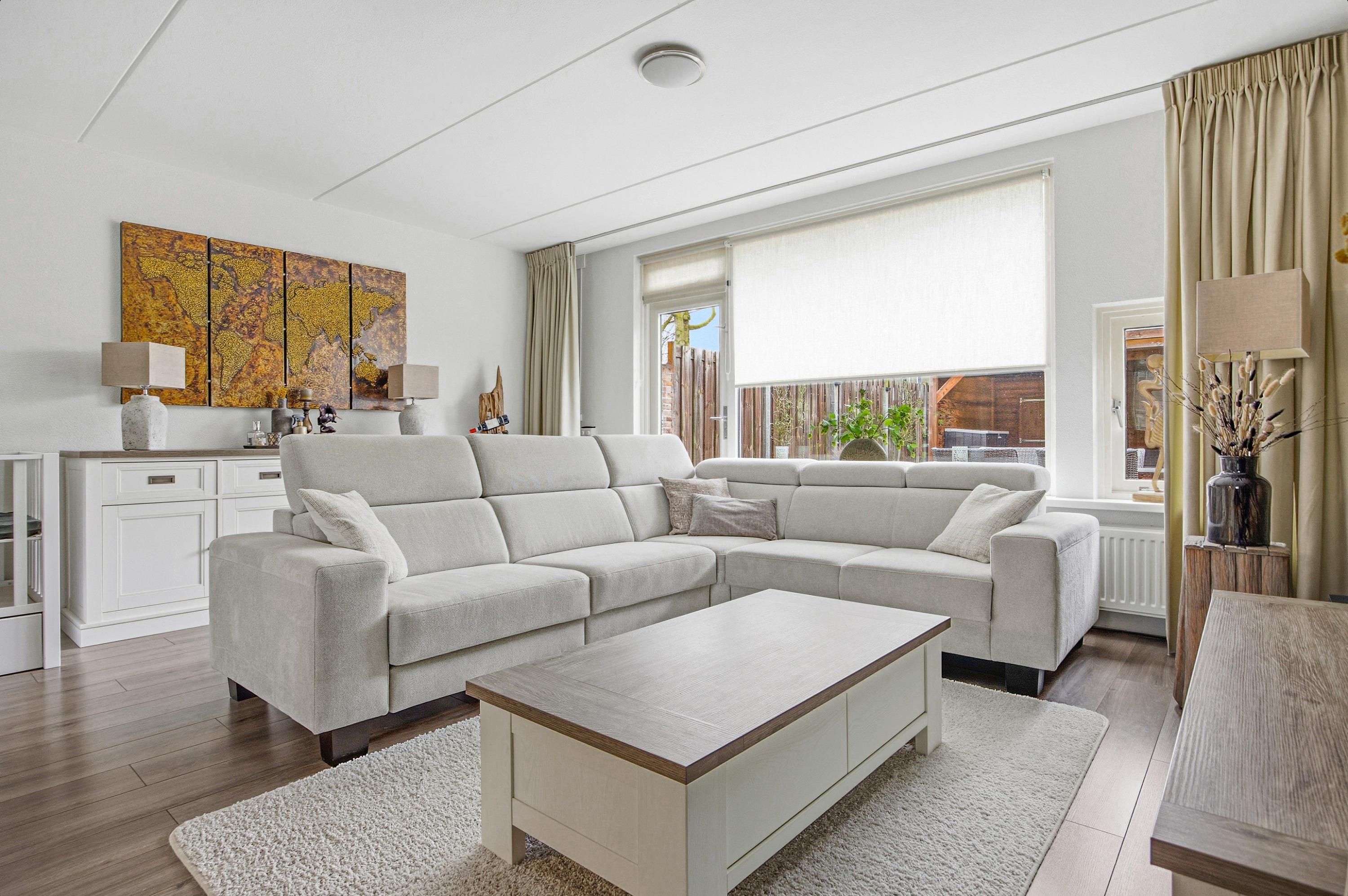 De woonkamer is licht en ruim opgezet en voorzien van een praktische trapkast. Aan de achterzijde van de woonkamer bevindt zich de comfortabele zithoek met directe toegang tot de tuin: een fijne plek om samen te komen of tot rust te komen na een lange dag.