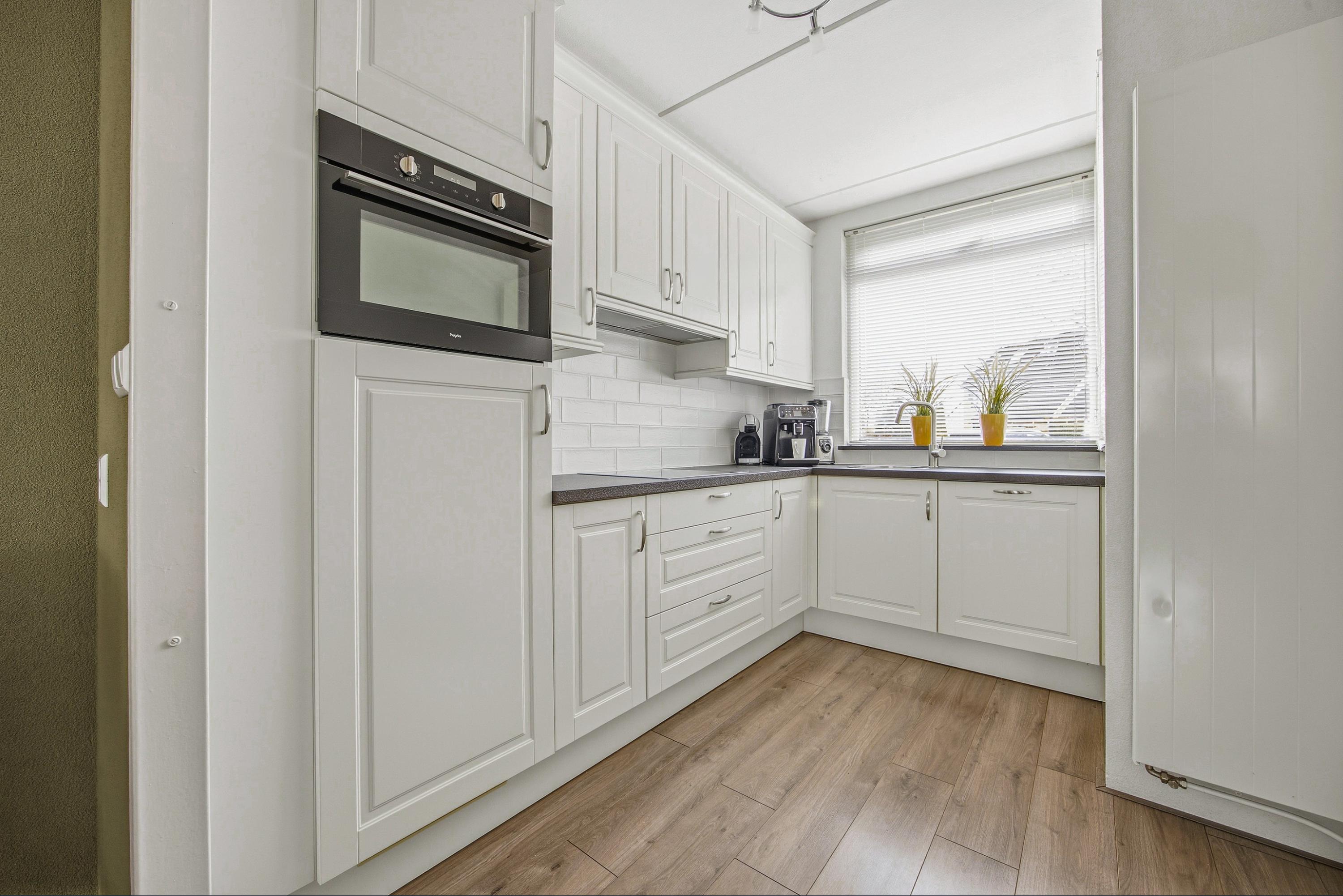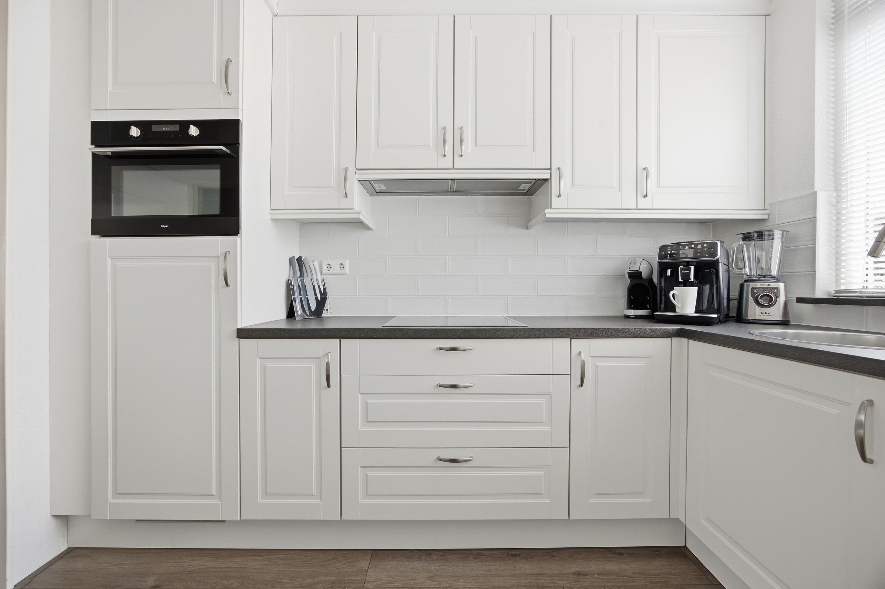 De open keuken aan de voorzijde is uitgevoerd in een L-opstelling en voorzien van diverse inbouwapparatuur, waaronder een keramische kookplaat, afzuigkap, vaatwasser, combi oven/magnetron en koelkast.