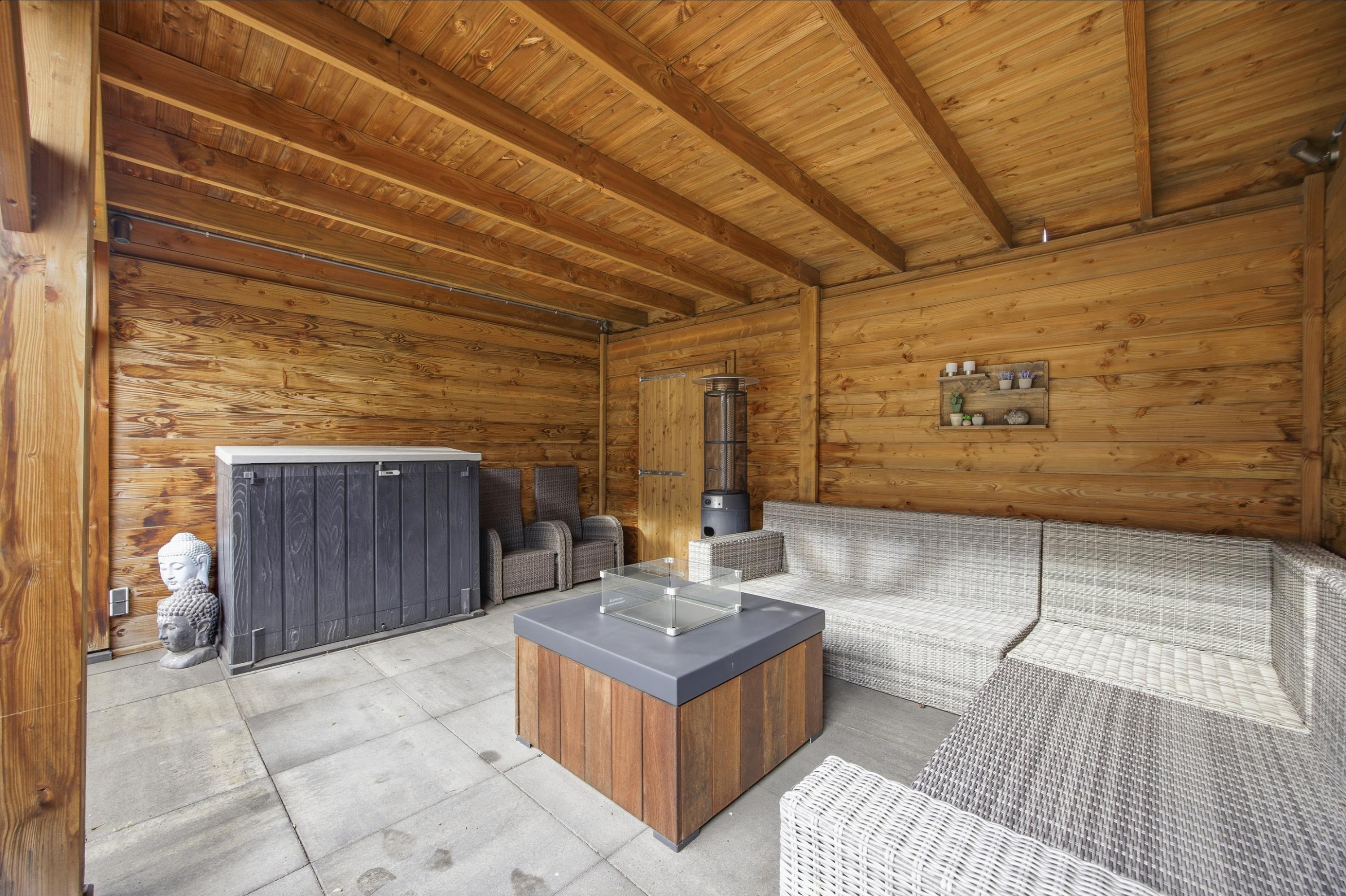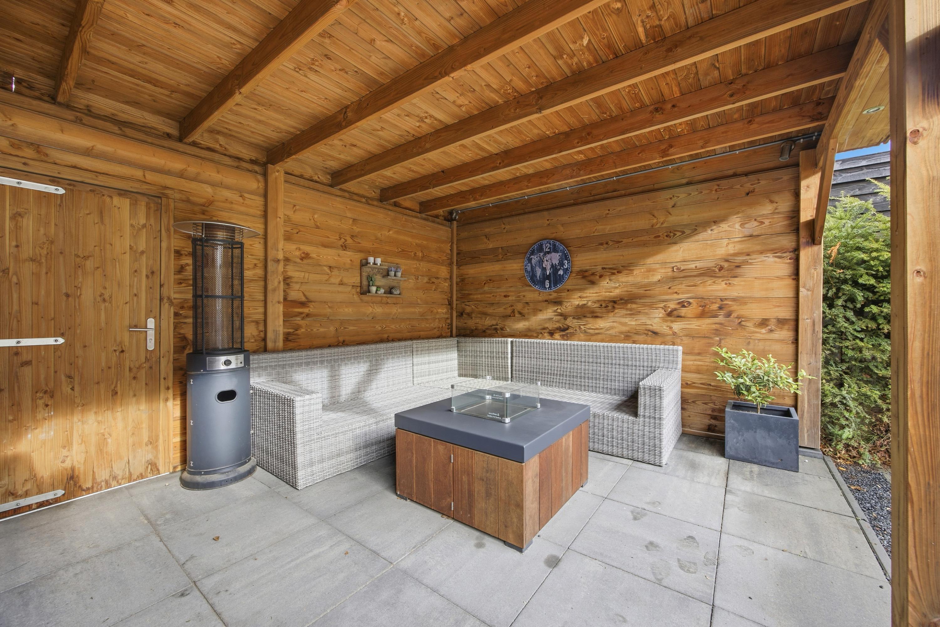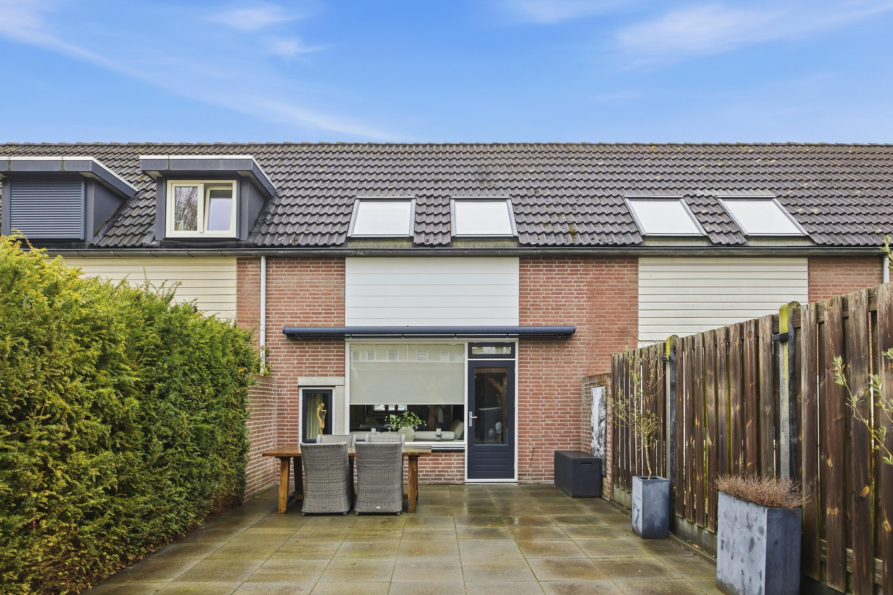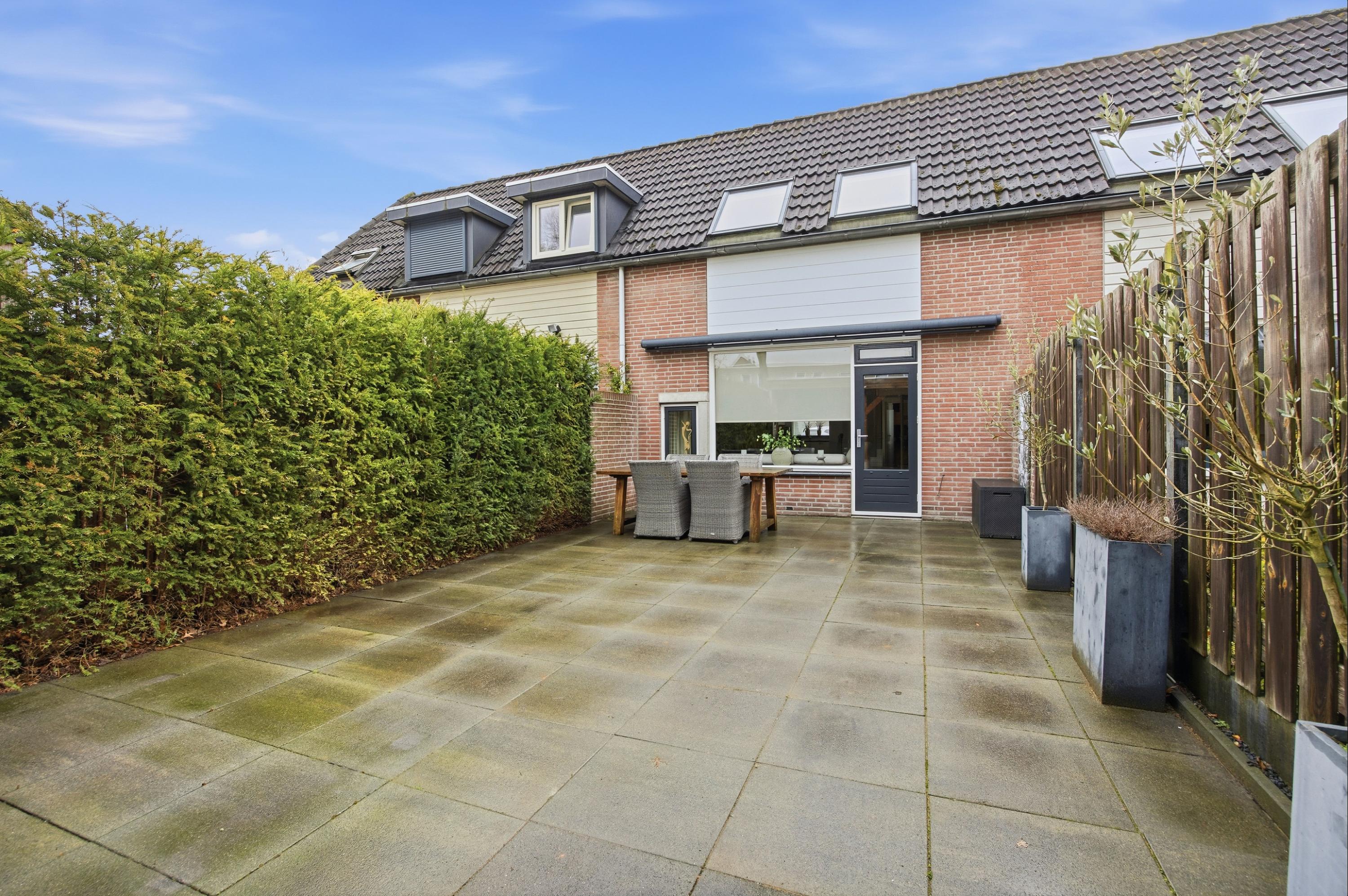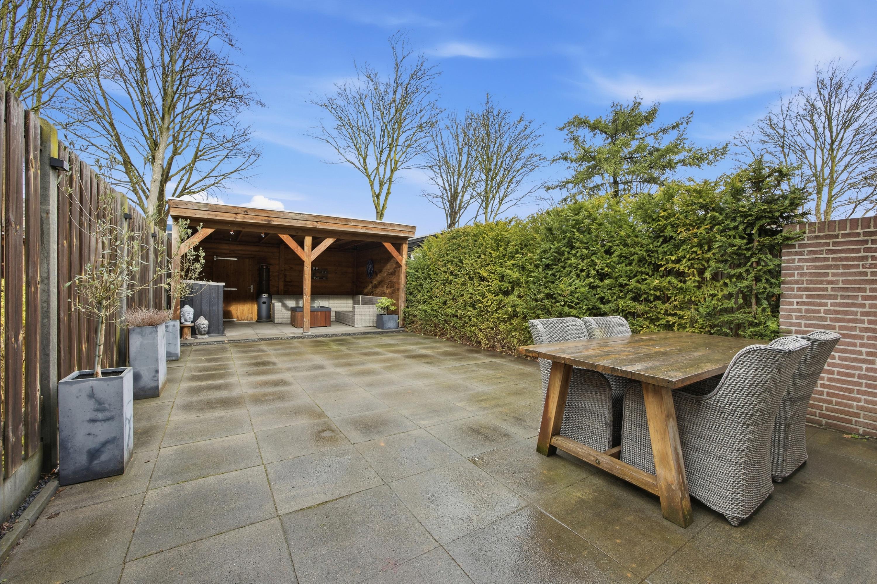 De onderhoudsvriendelijk aangelegde achtertuin ligt op het noorden. Dankzij de royale overkapping, achterom en het grote zonnescherm is dit een heerlijke buitenruimte waar je comfortabel kunt zitten. Extra pluspunt: er is geen directe bebouwing achter de woning, wat zorgt voor extra privacy.