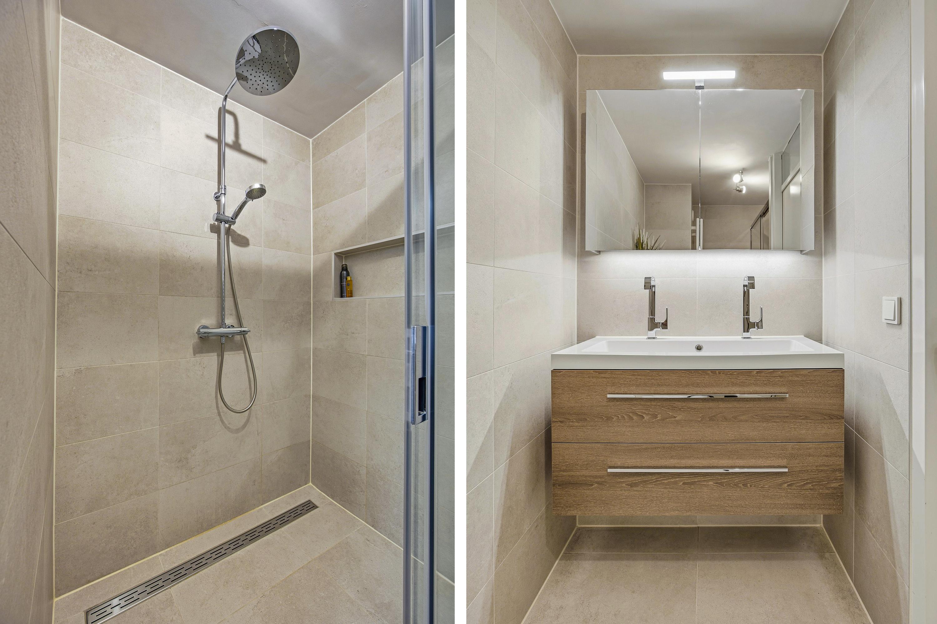 De vernieuwde badkamer is stijlvol uitgevoerd met een inloopdouche (regendouche en handdouche), hangend toilet en wastafel.