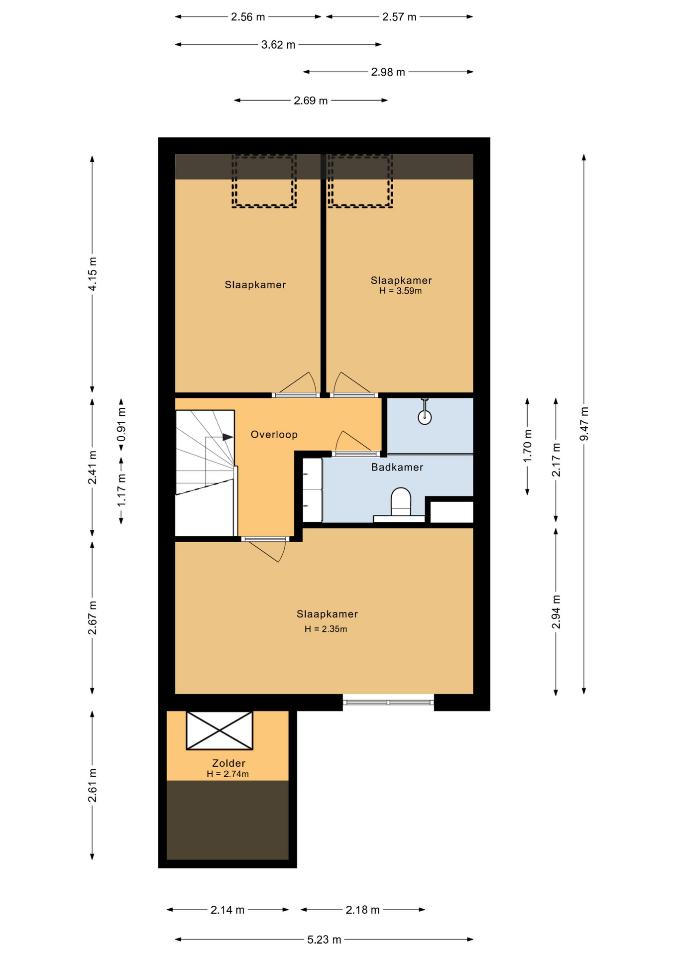 Twee slaapkamers aan de achterzijde (ca. 4,15 x 2,55 m) met dakraam
