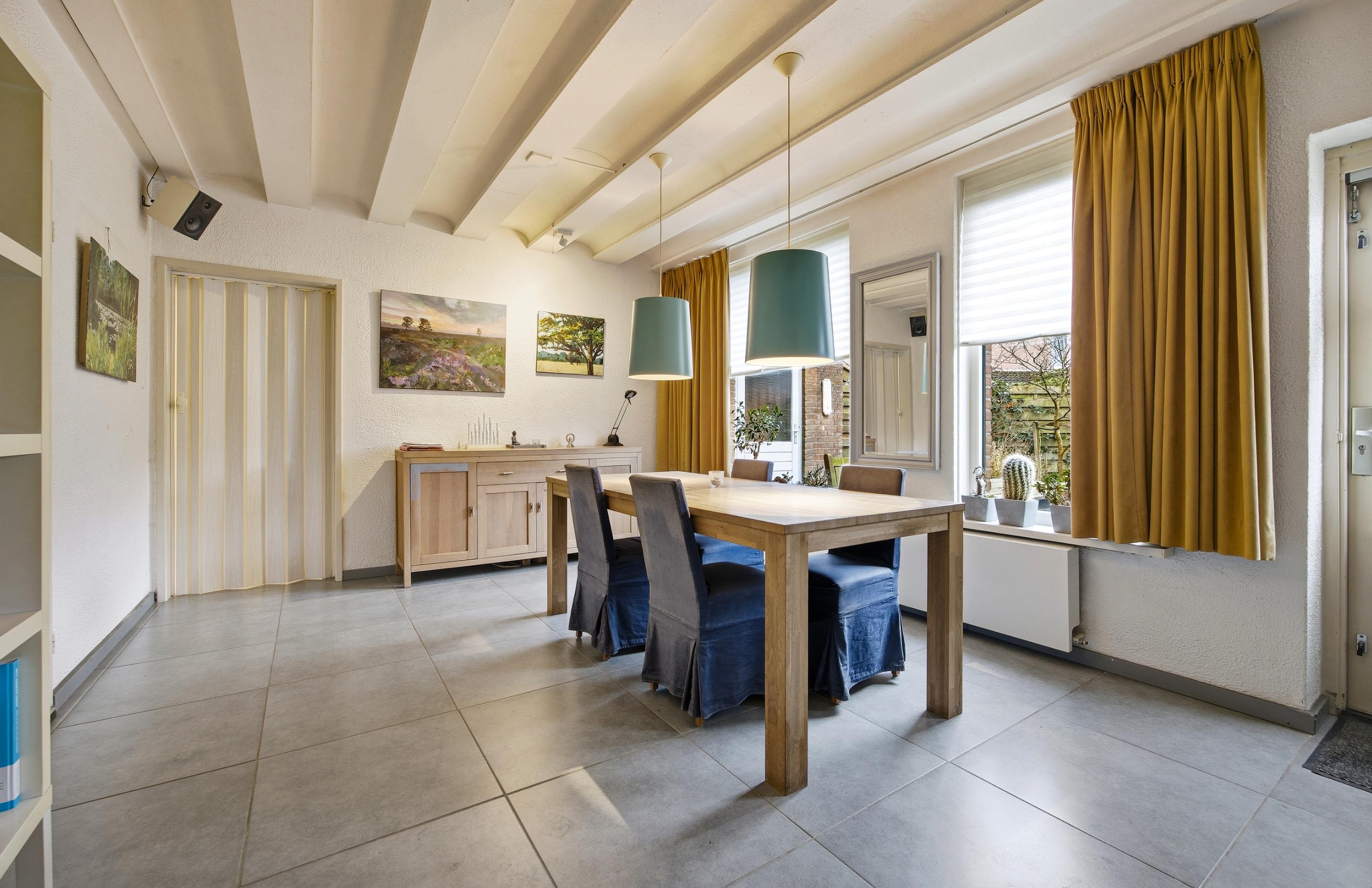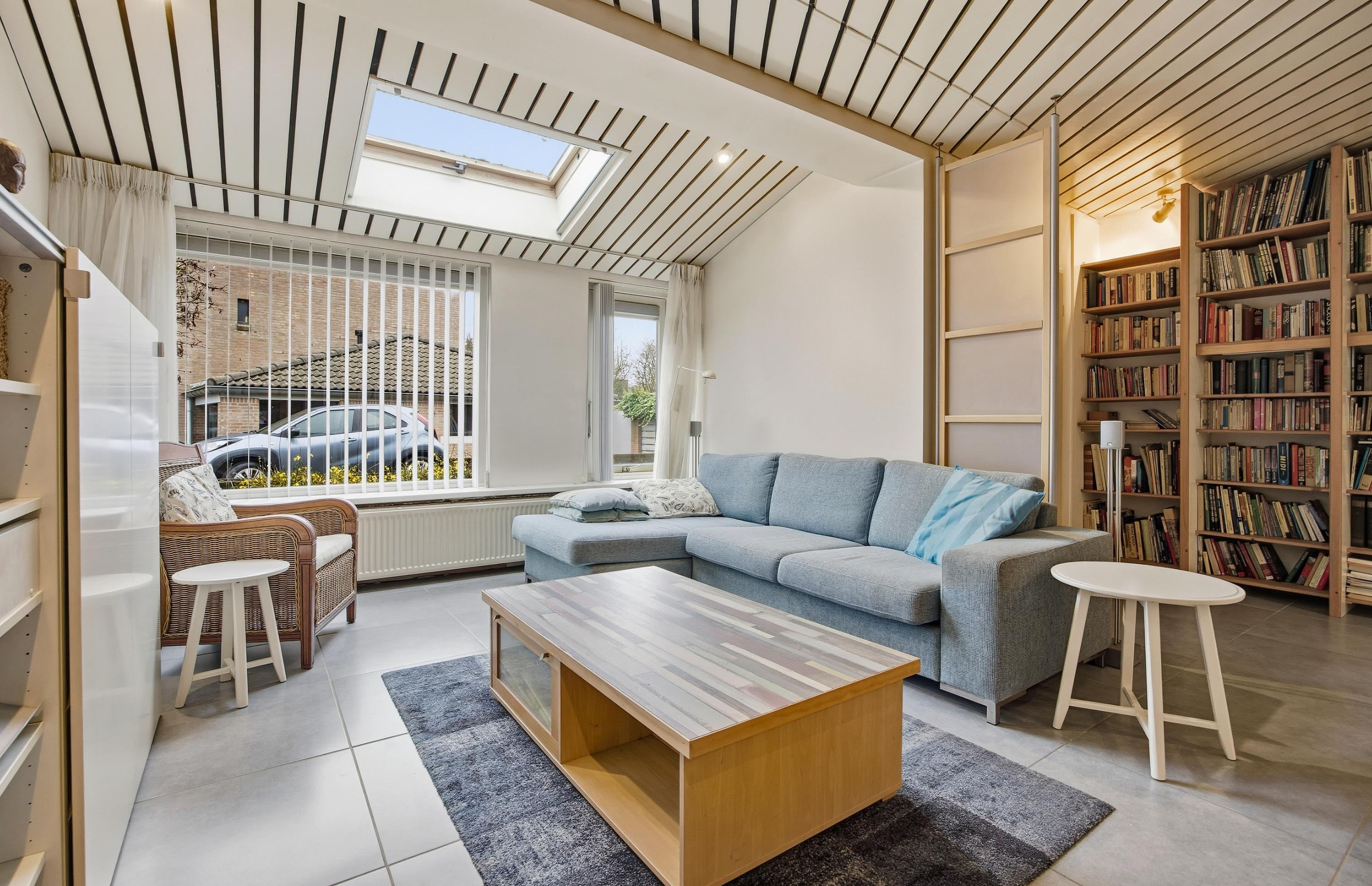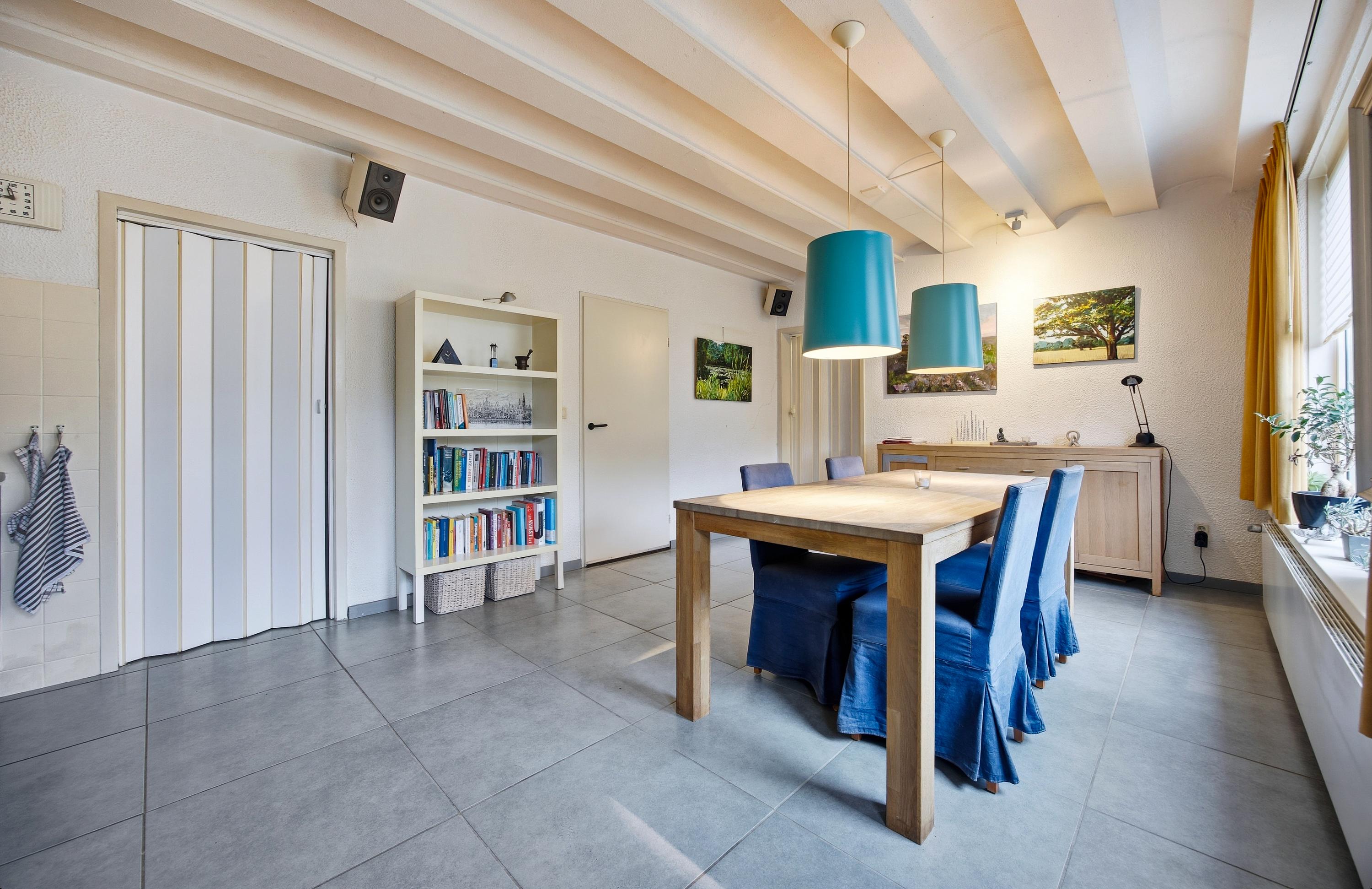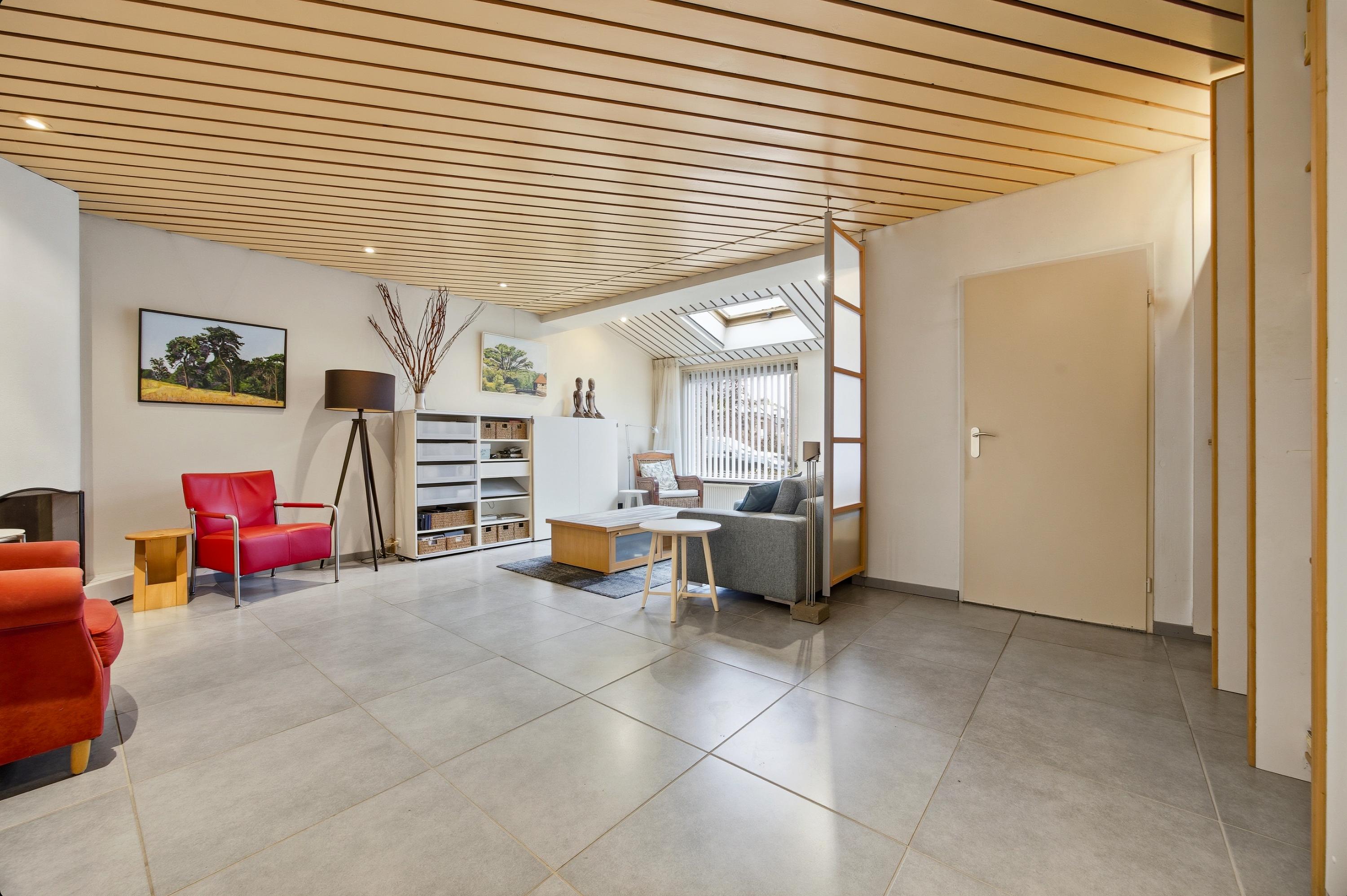 De woonkamer is royaal van opzet en afgewerkt met een tegelvloer. Aan de voorzijde bevindt zich een gezellige uitbouw met dakraam, wat zorgt voor extra licht en ruimte. Daarnaast is de woonkamer voorzien van een open haard.