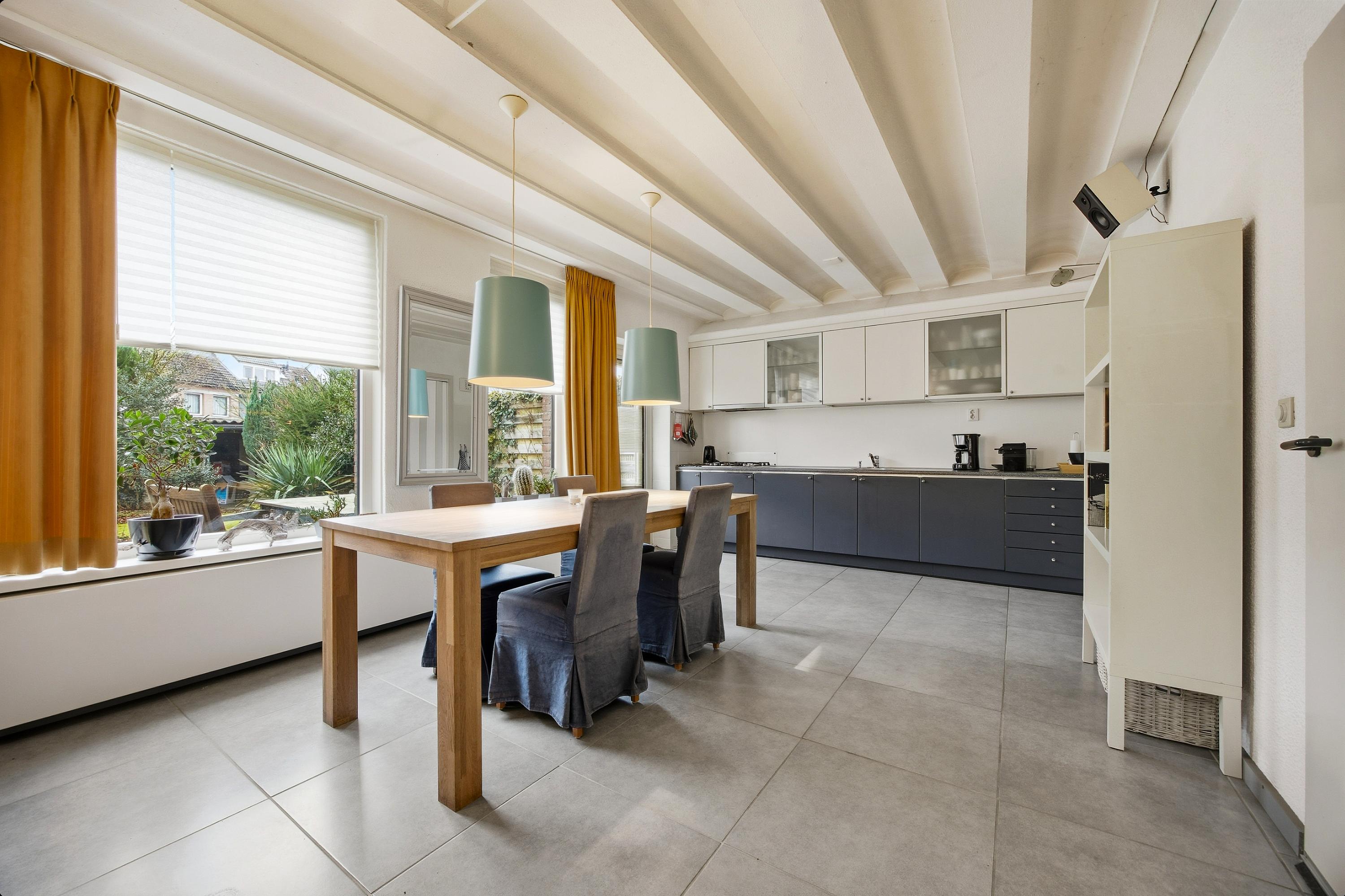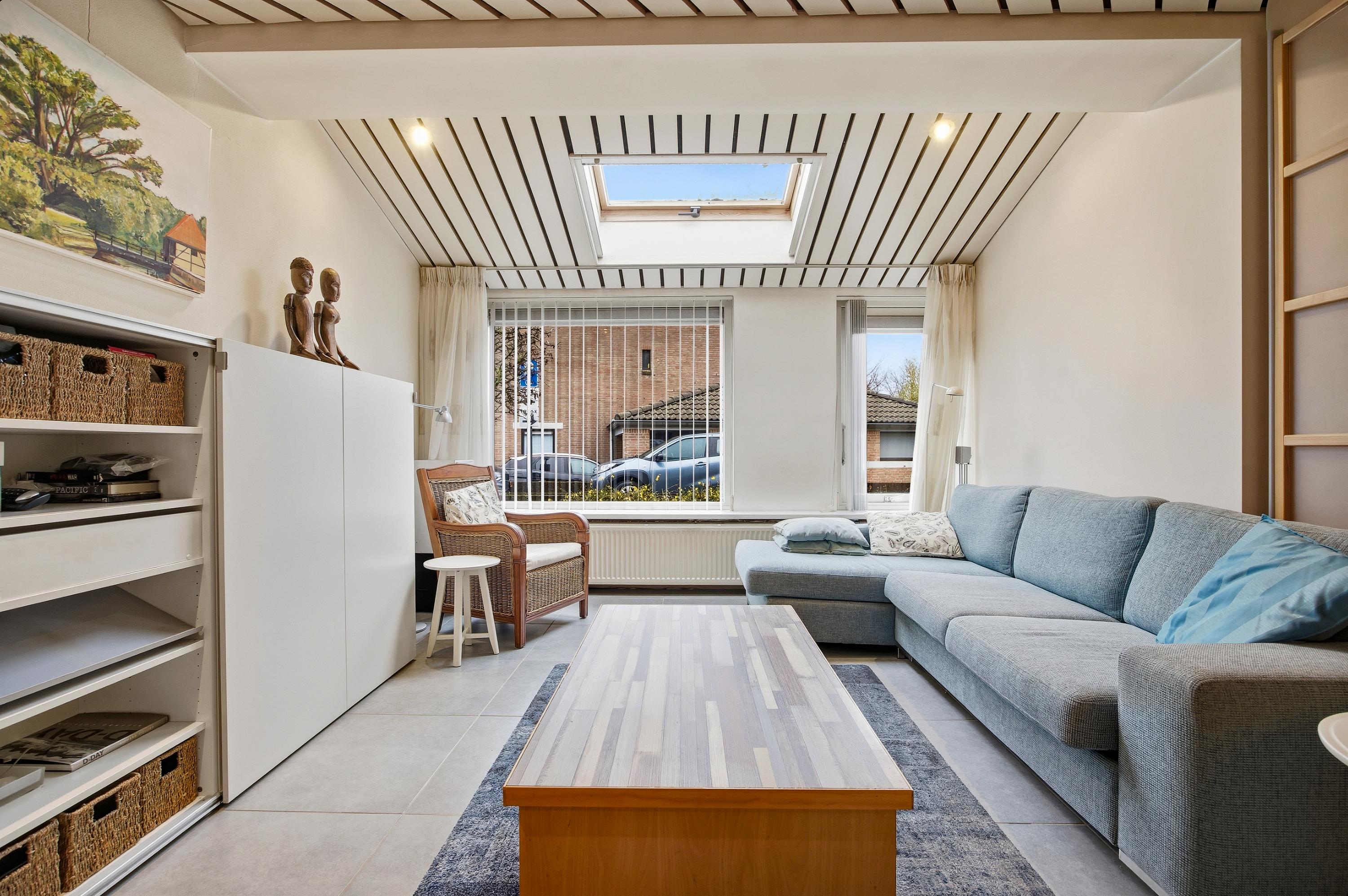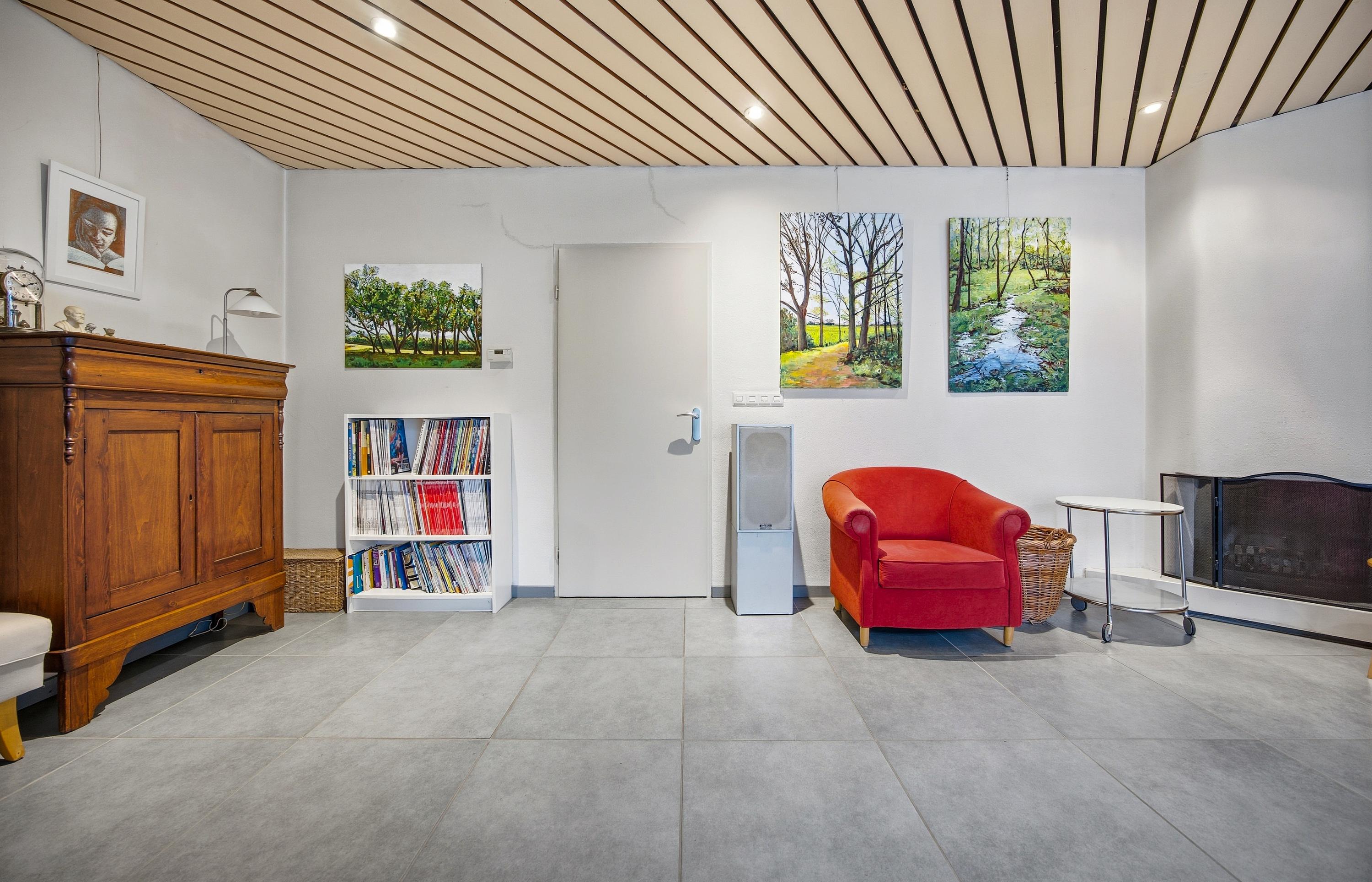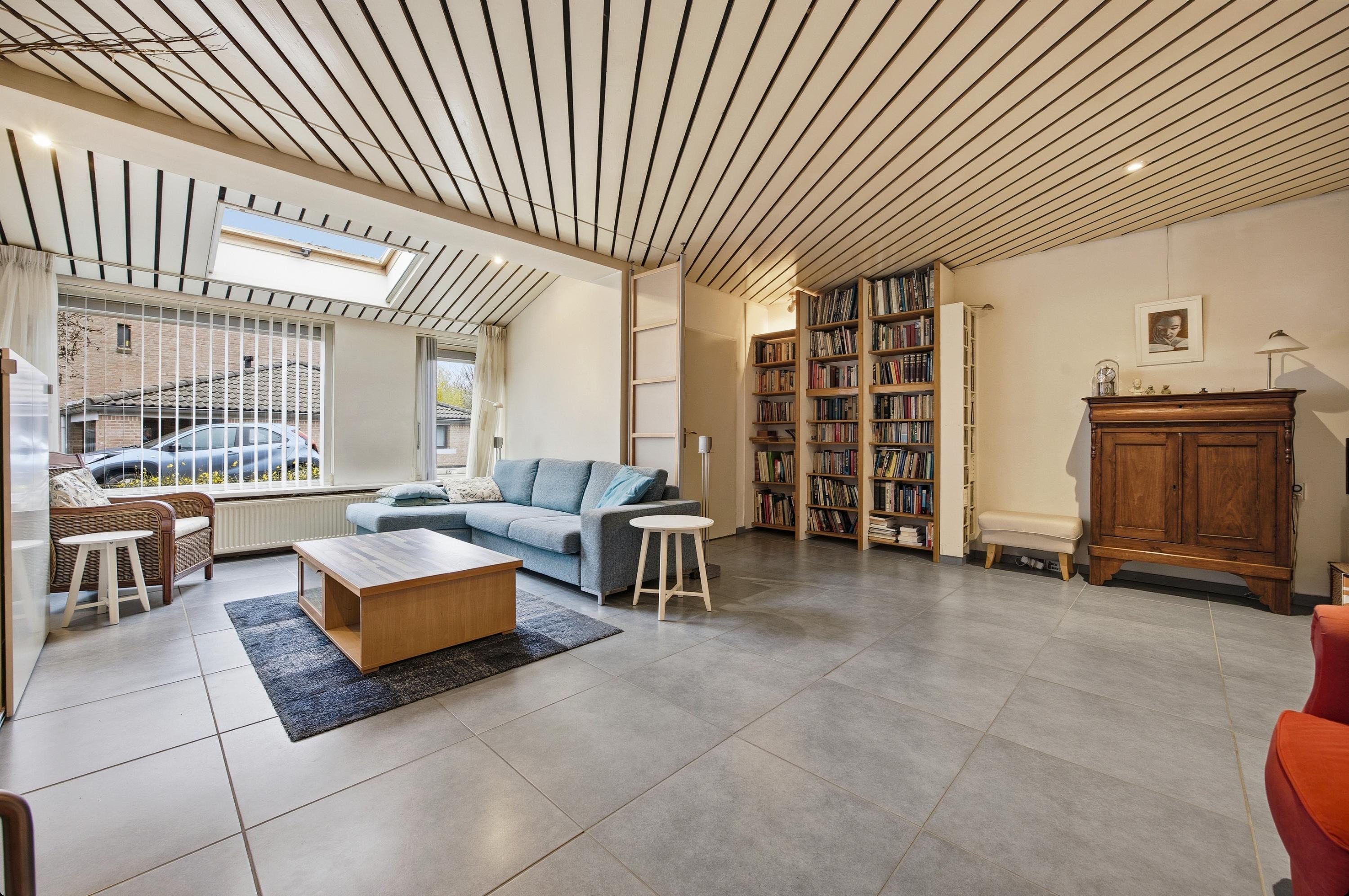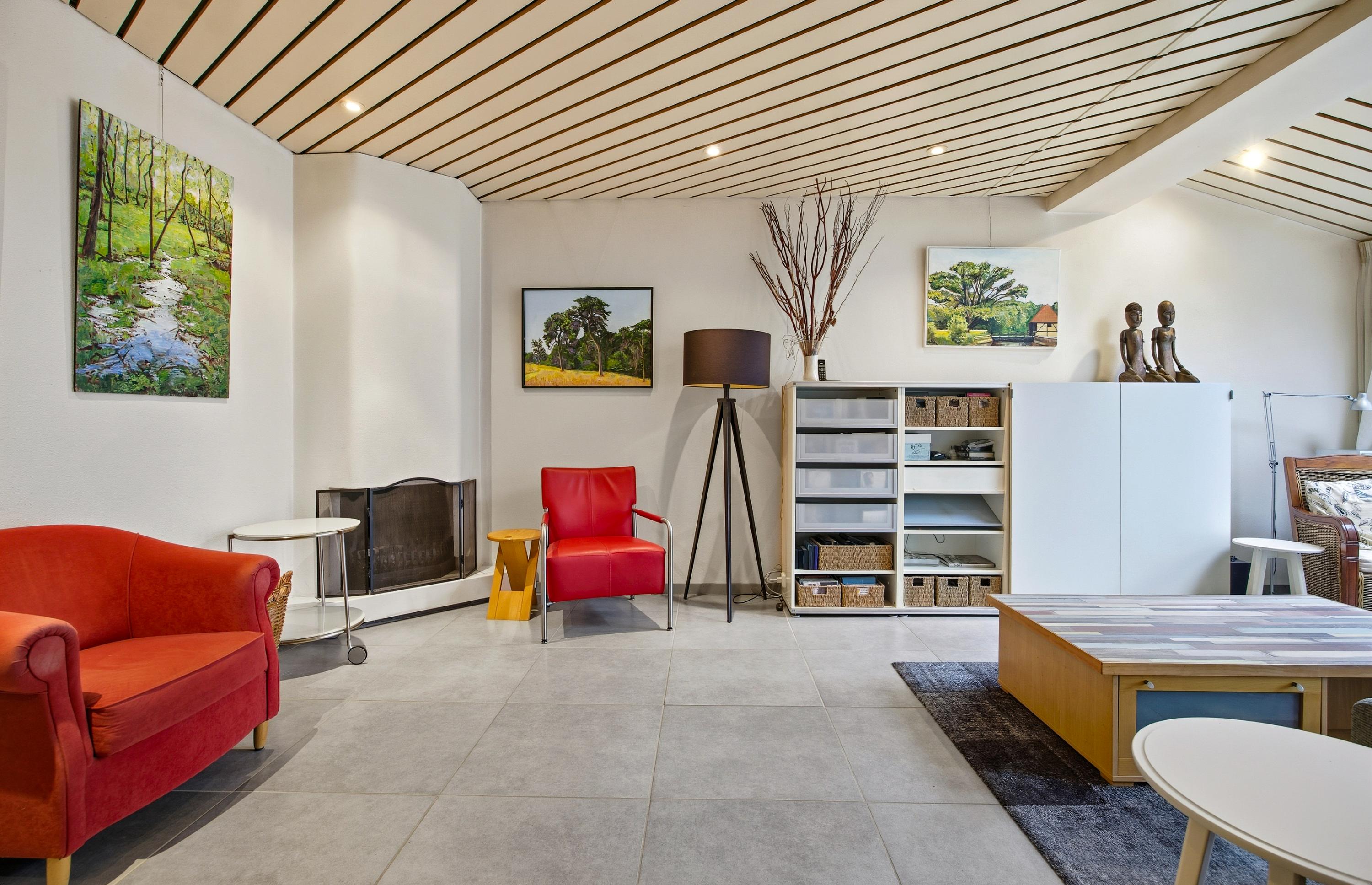 De woonkamer is royaal van opzet en afgewerkt met een tegelvloer. Aan de voorzijde bevindt zich een gezellige uitbouw met dakraam, wat zorgt voor extra licht en ruimte. Daarnaast is de woonkamer voorzien van een open haard.