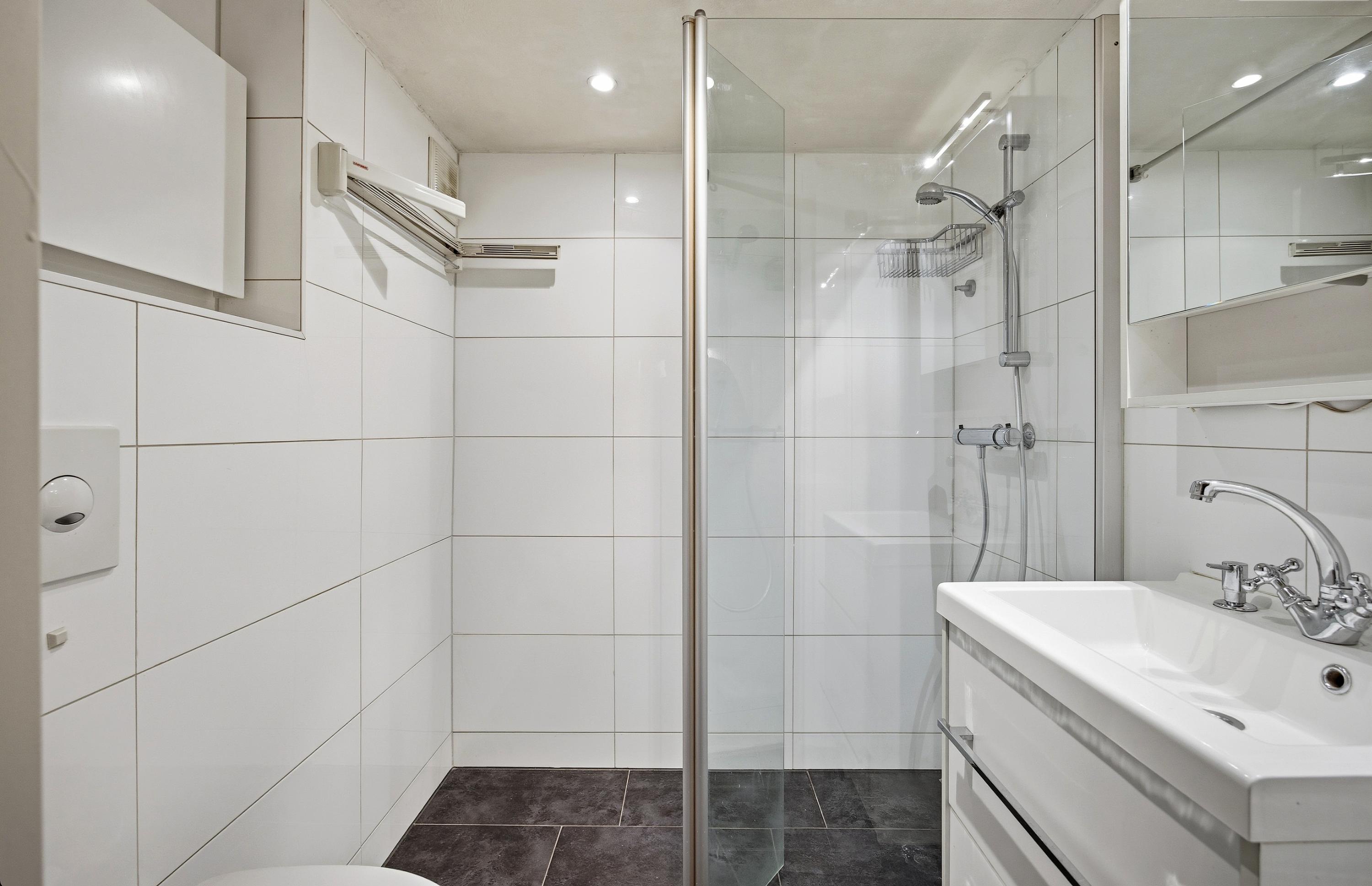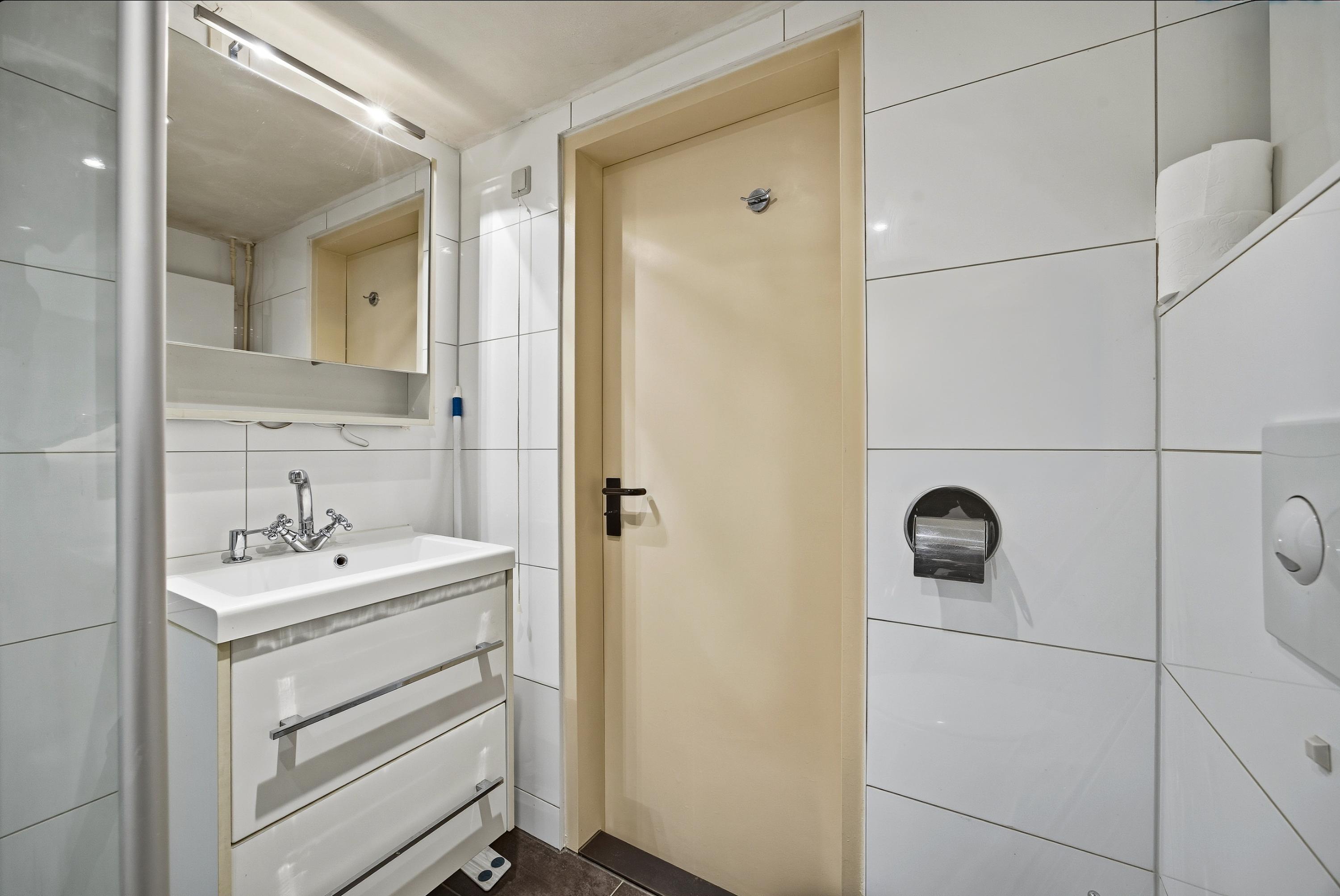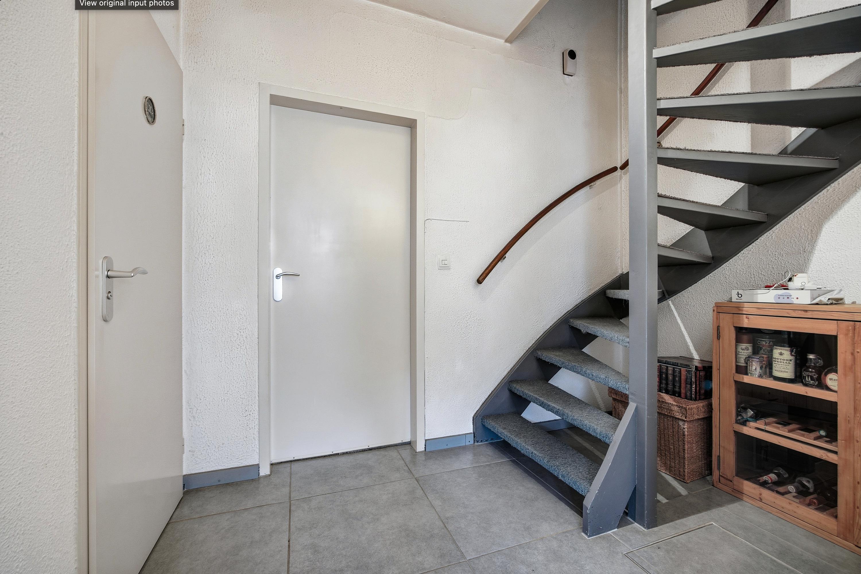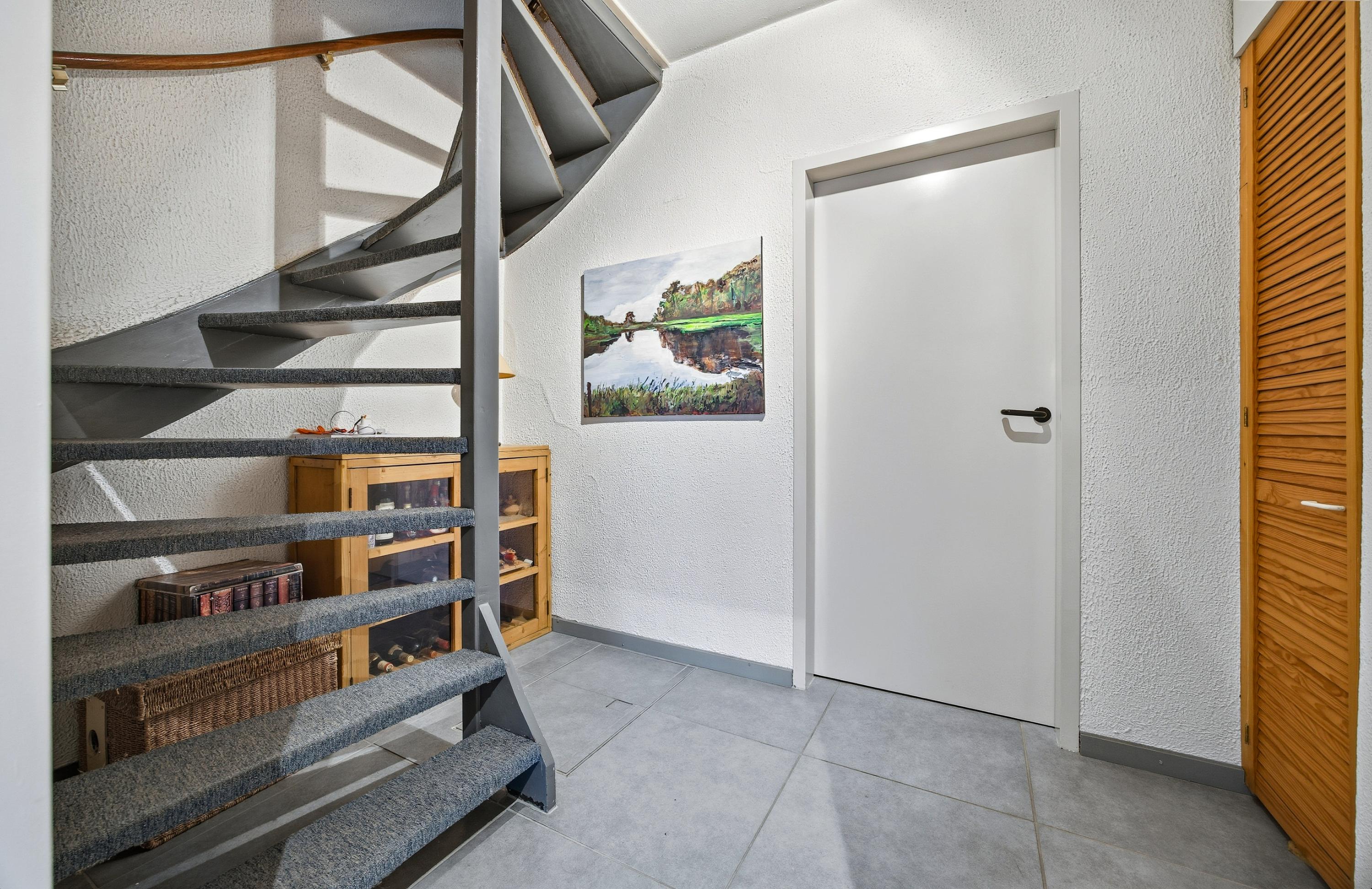 Vanuit de woonkamer bereik je een tussenhal met trapopgang, een hangend toilet met fonteintje en een praktische opbergkast.