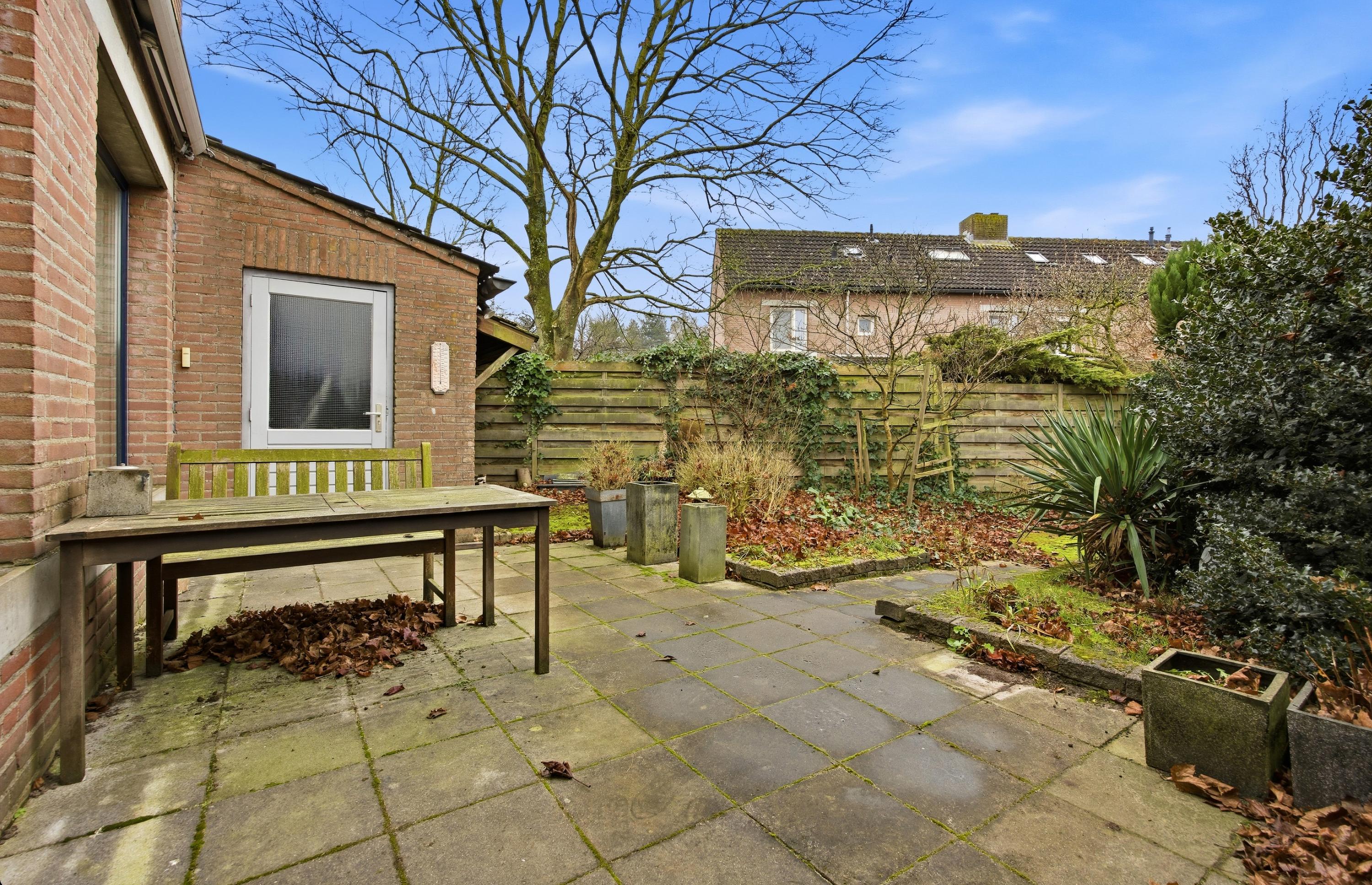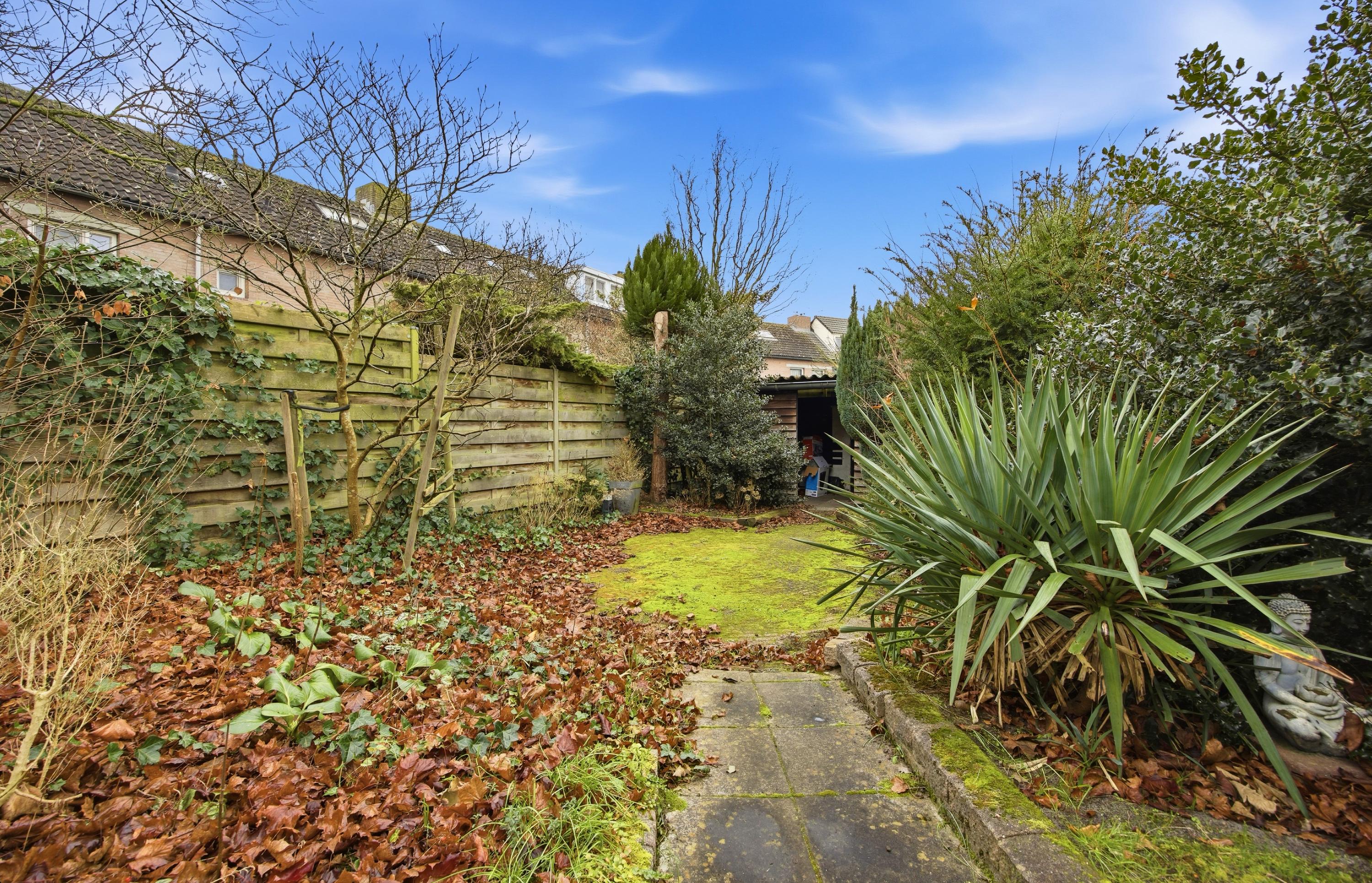 De tuin is ruim, gelegen op het zonnige westen en voorzien van een terras, beplanting, een overkapping, een stenen berging en een achterom.
