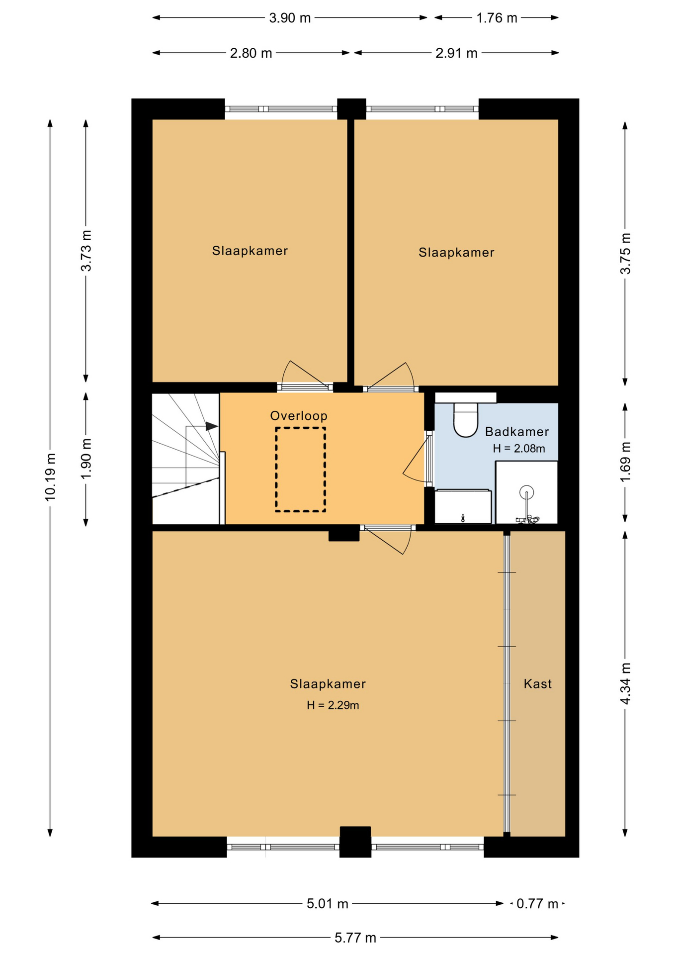 Op de eerste verdieping bevinden zich drie slaapkamers, met de mogelijkheid om een vierde slaapkamer te realiseren. De badkamer is voorzien van een hangend toilet, wastafel met meubel, afzuiging en verwarming.