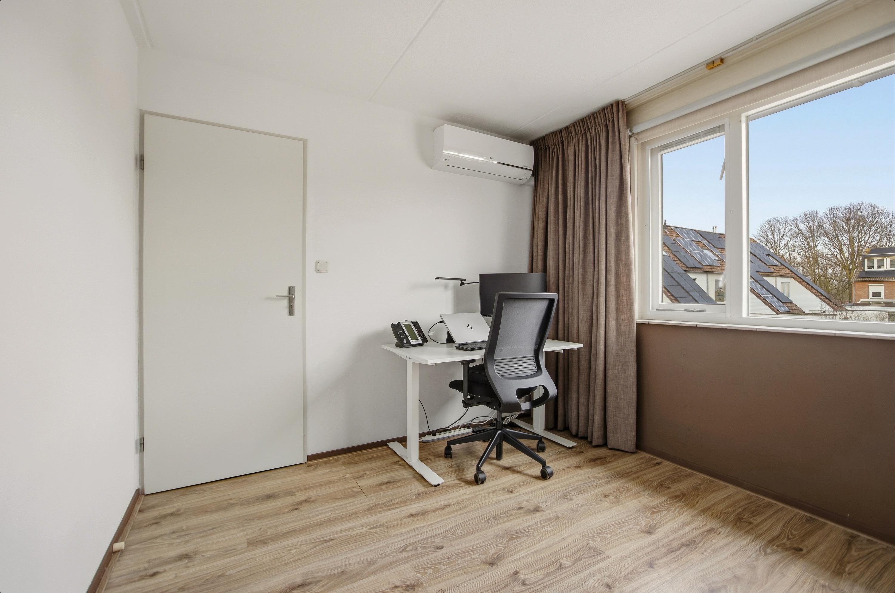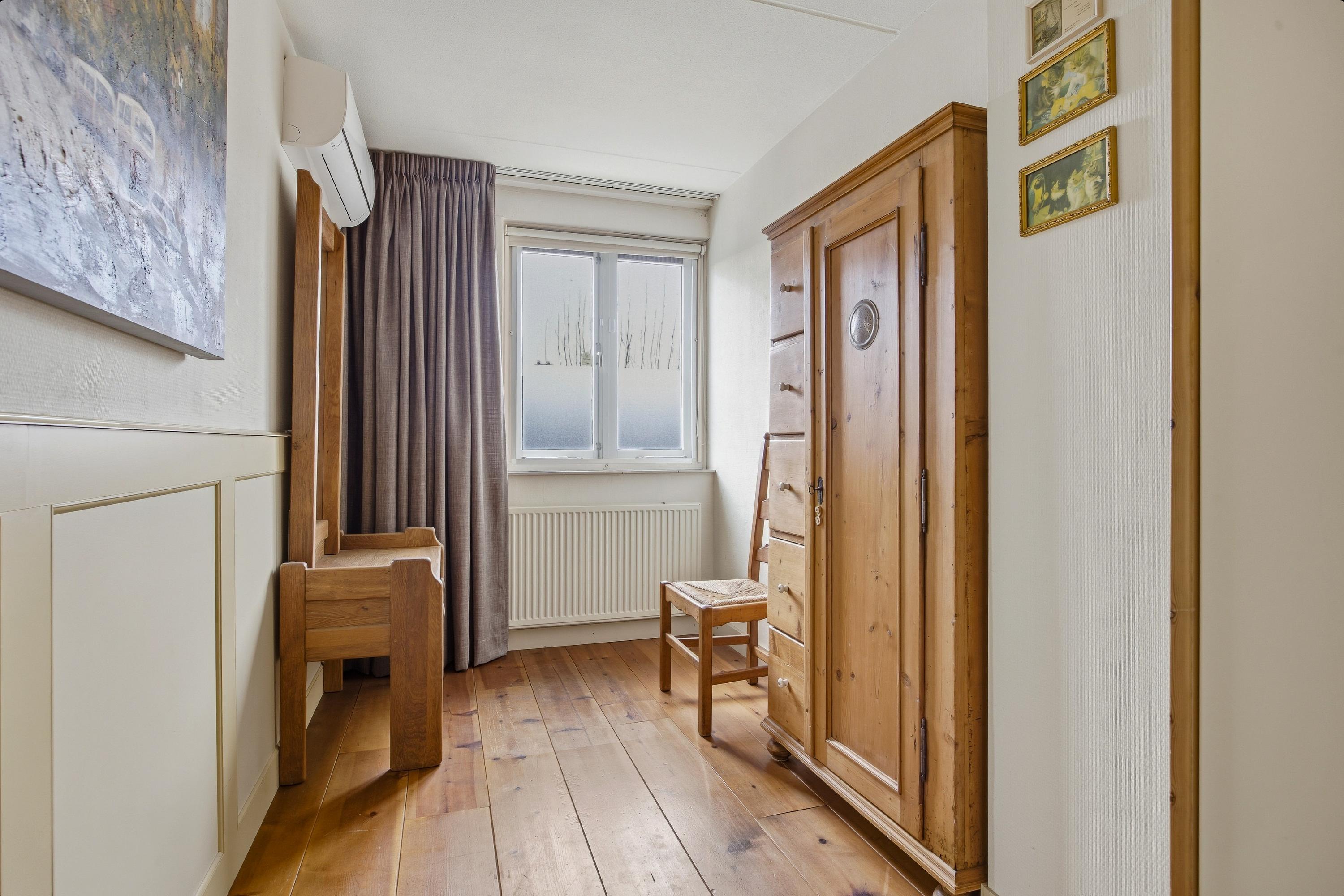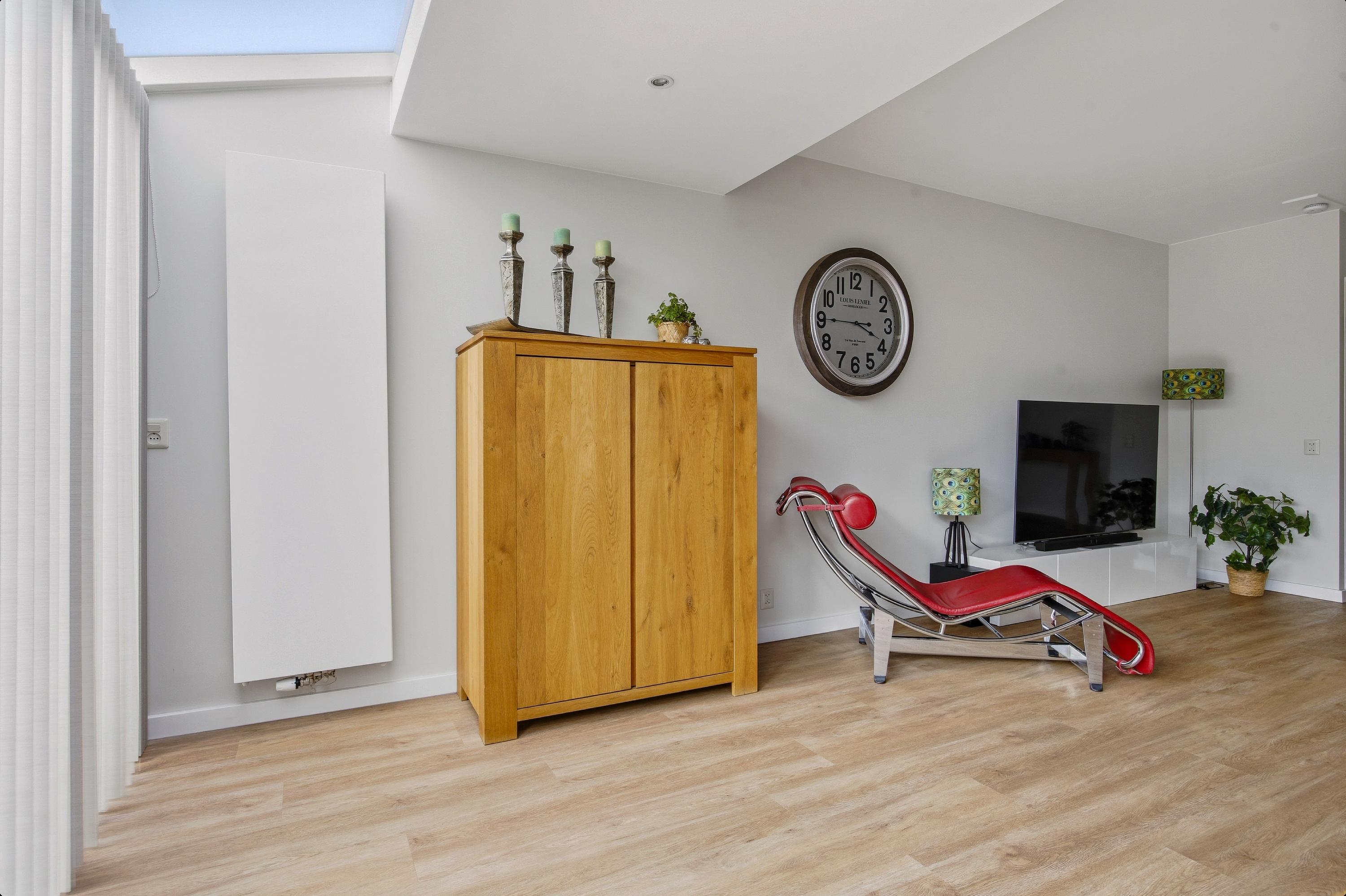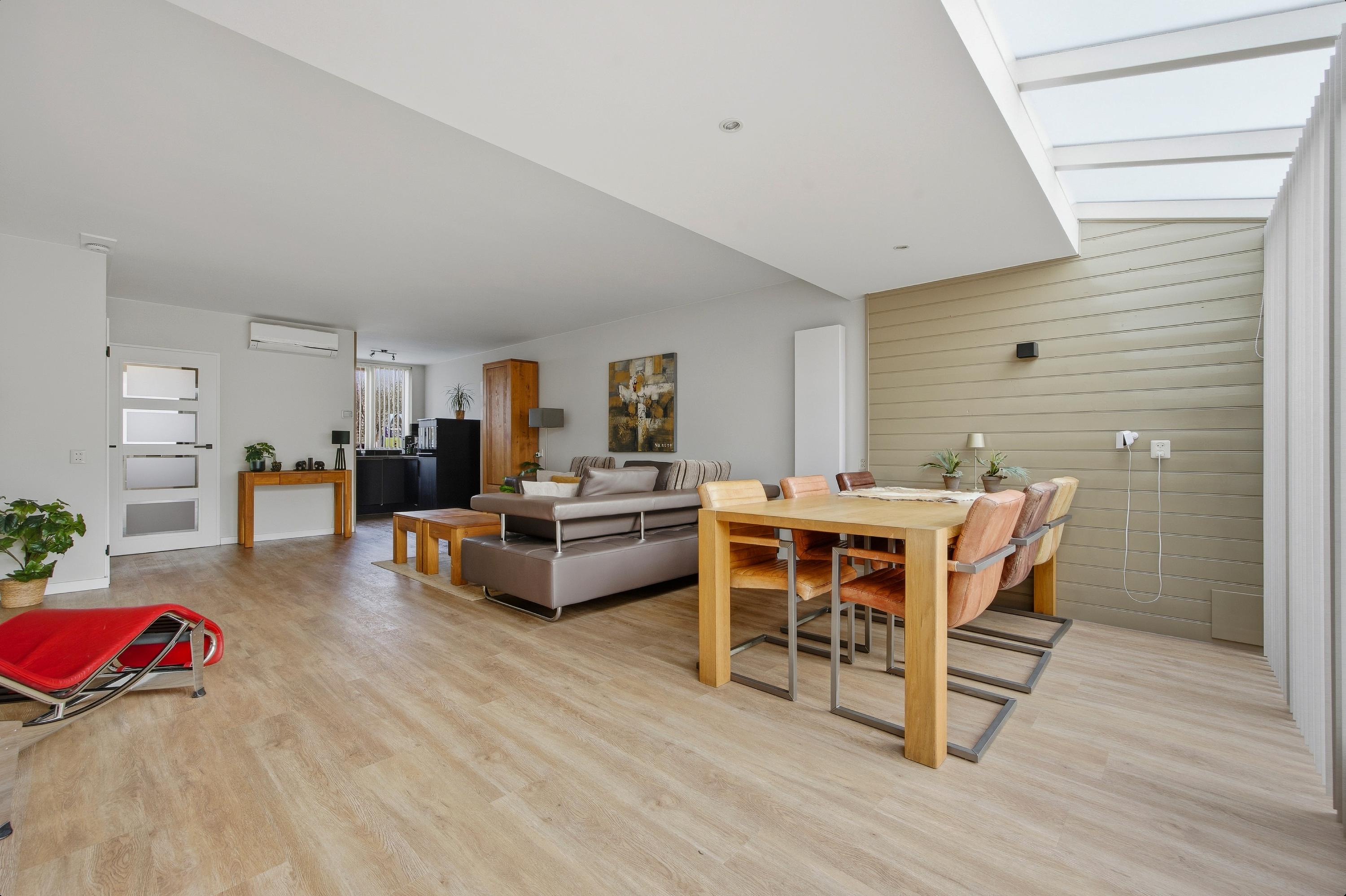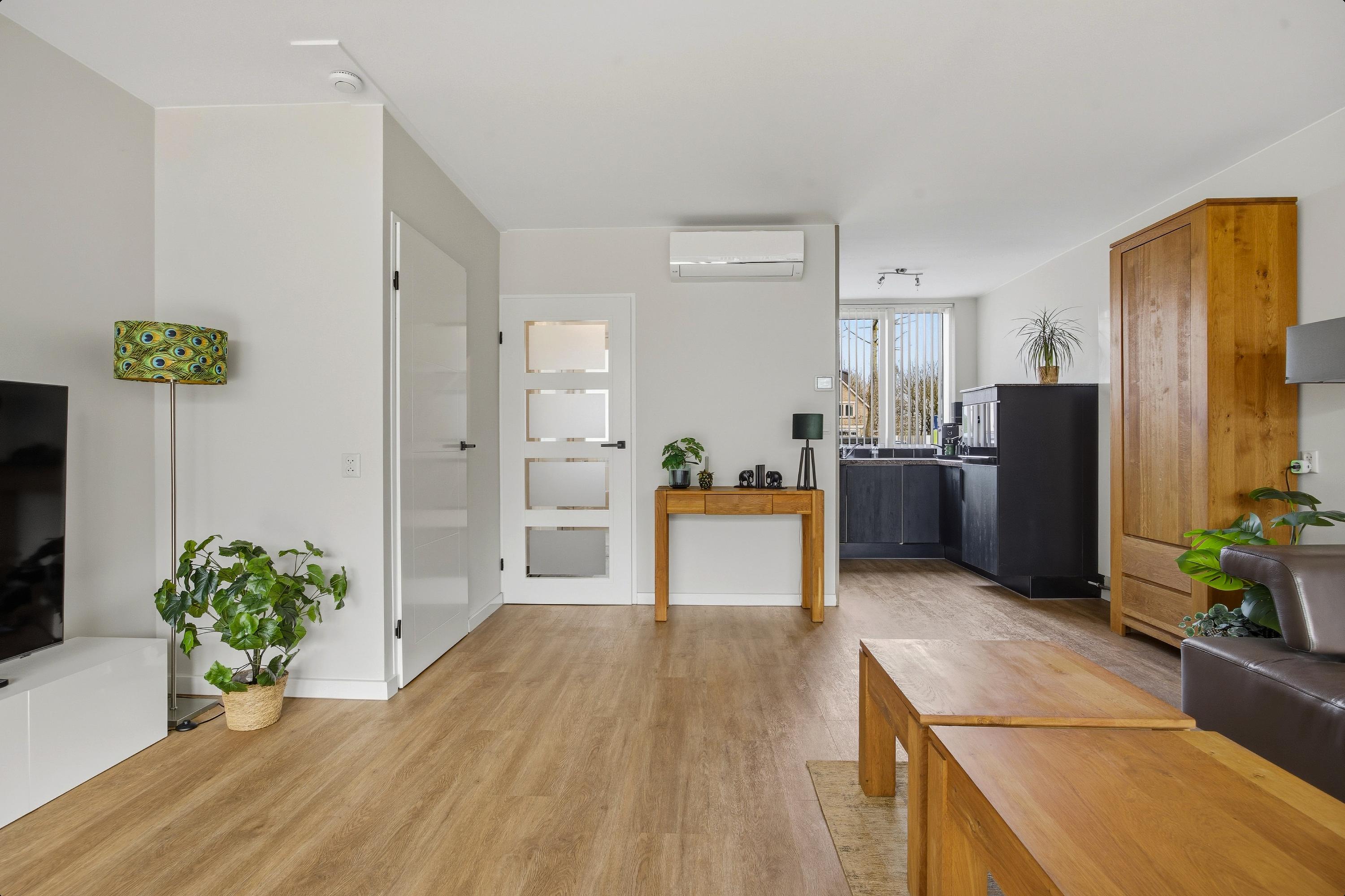 De begane grond is (m.u.v. van het toilet) afgewerkt met een fraaie pvc vloer. De tuingerichte woonkamer is circa vijf meter breed, voorzien van een uitbouw en geniet van een prettige lichtinval. Daarnaast is de woonkamer uitgerust met airconditioning, wat bijdraagt aan extra comfort in alle seizoenen. Vanuit de woonkamer heeft u toegang tot een praktische trapkast, ideaal voor het opbergen van voorraad en speelgoed.