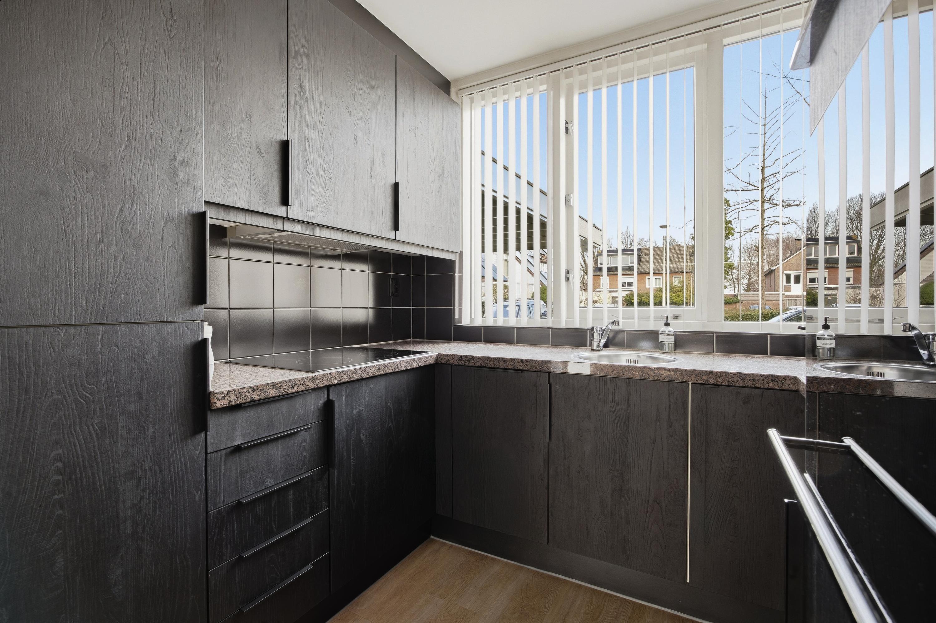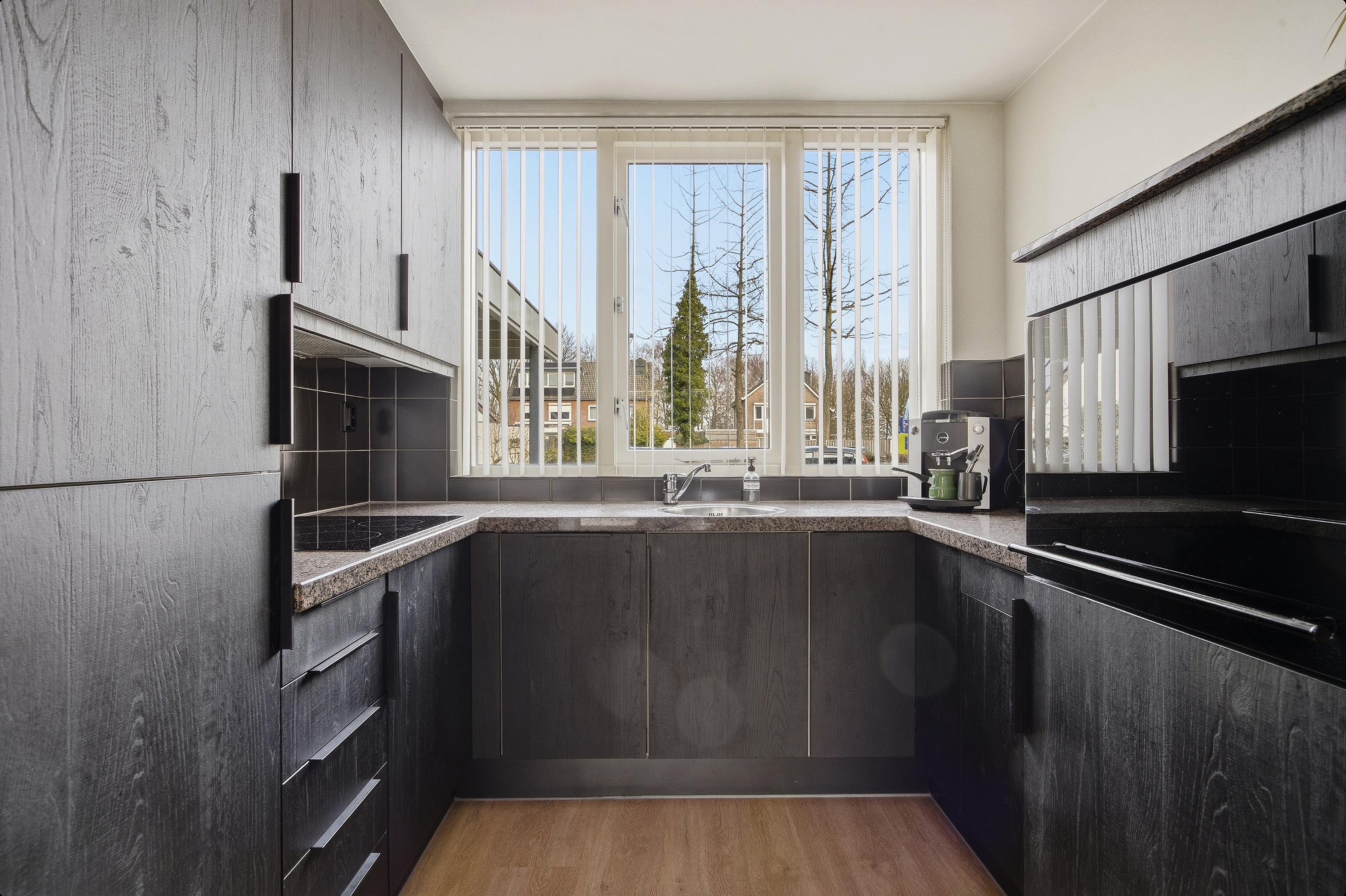 De keuken is aan de voorzijde van de woning gesitueerd en uitgevoerd in een praktische U-opstelling. Deze is voorzien van diverse inbouwapparatuur, waaronder een inductiekookplaat, afzuigkap, koelkast, vriezer, vaatwasser en spoelbak. Vanuit de keuken kijkt u uit op het speelveldje voor de deur, waardoor u tijdens het koken eenvoudig een oogje in het zeil kunt houden.