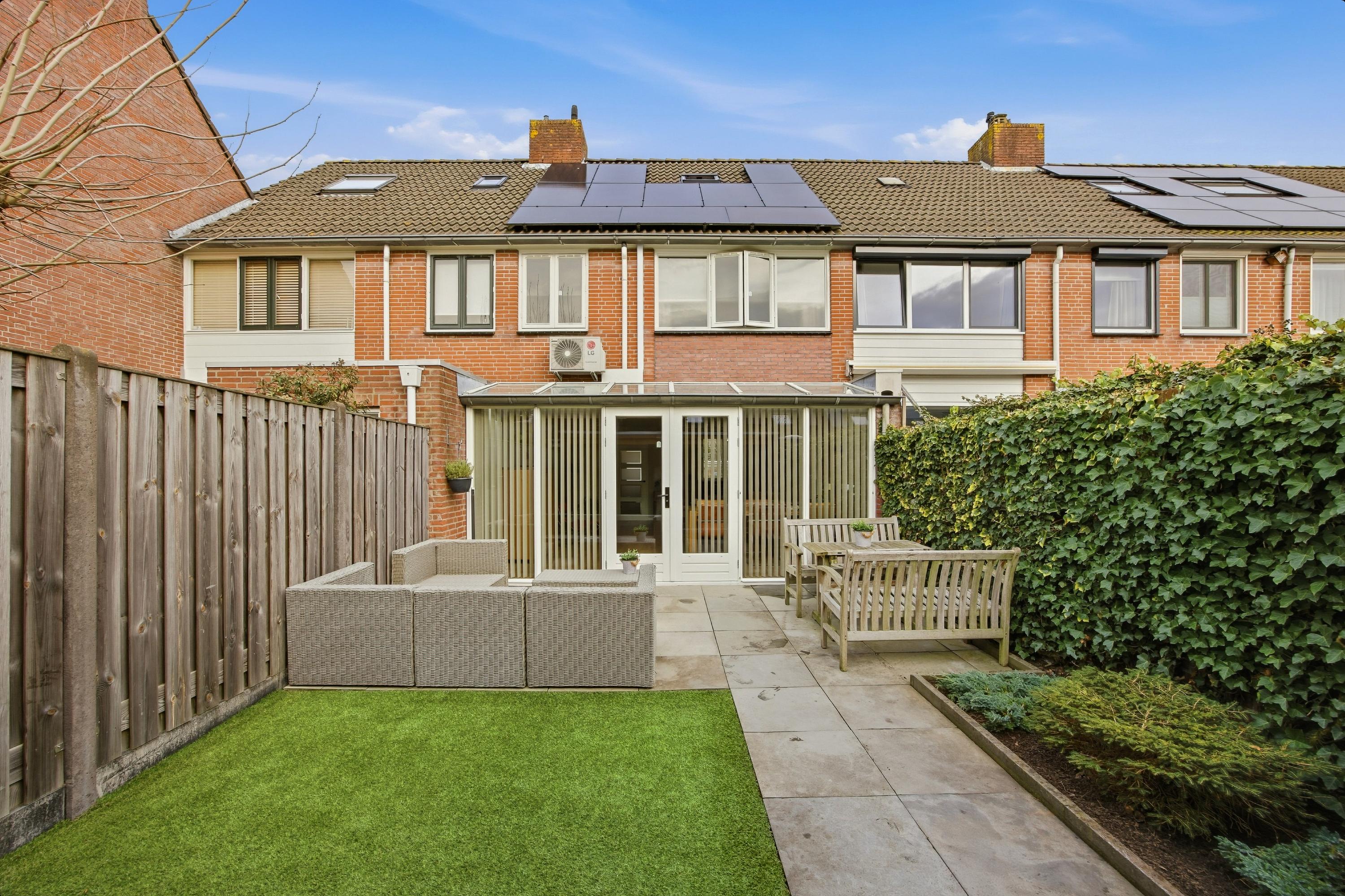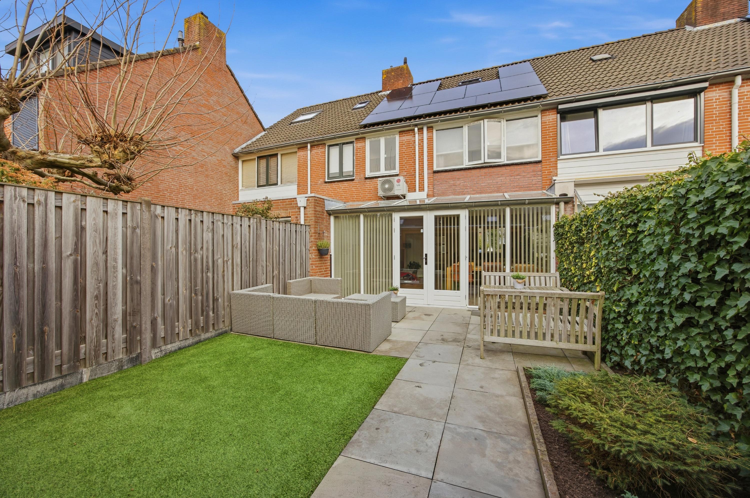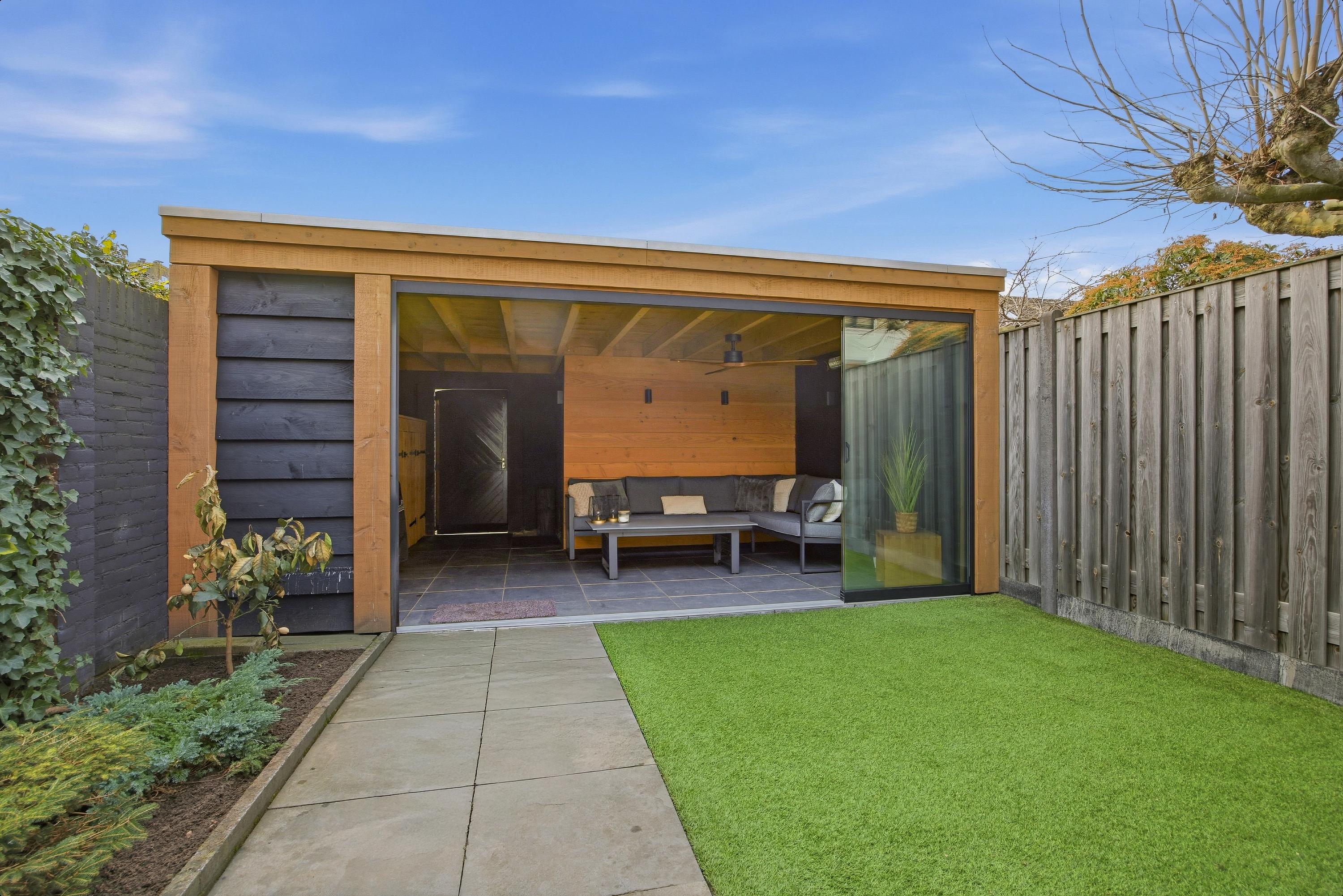 De achtertuin is circa 11 meter diep en ruim 5 meter breed en is gelegen op het zonnige zuidwesten. Hierdoor geniet u het grootste deel van de dag van de zon. De tuin is fraai aangelegd met kunstgras, een groot terras aan de woning en een riante overkapping, waardoor u het hele jaar door comfortabel buiten kunt zitten. Achterin de tuin bevindt zich een stenen berging met elektriciteit.