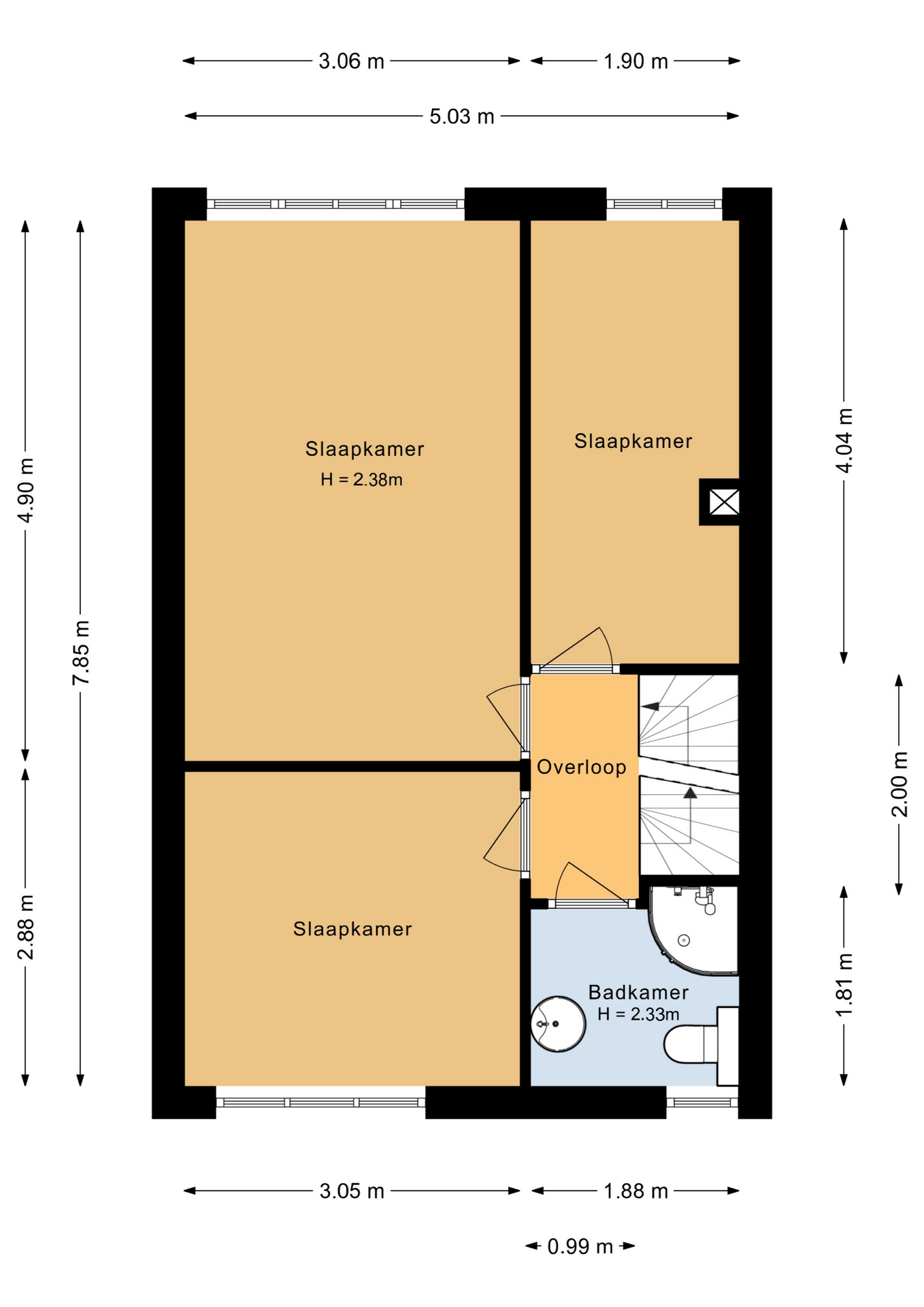 Alle slaapkamers zijn van een goed formaat en voorzien van airconditioning. De kamers aan de achterzijde zijn nog uitgerust met enkelglas. De badkamer is compleet uitgevoerd met een douche, wastafel en toilet.